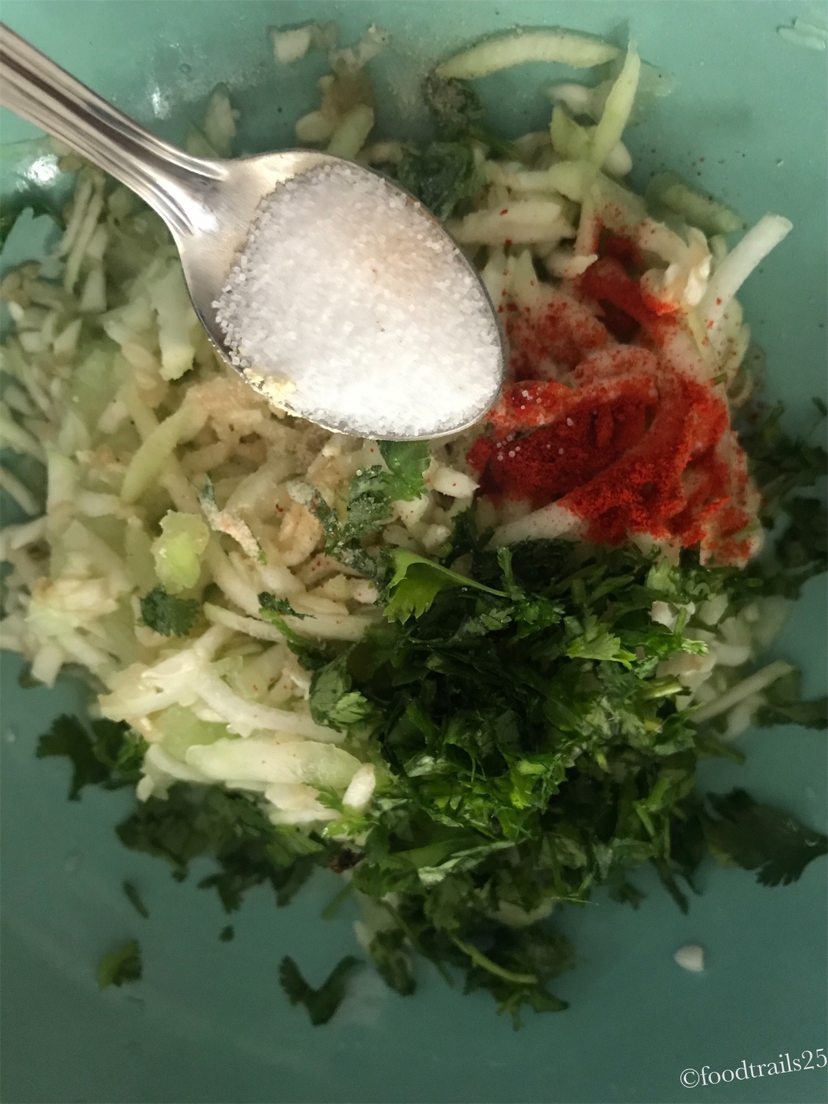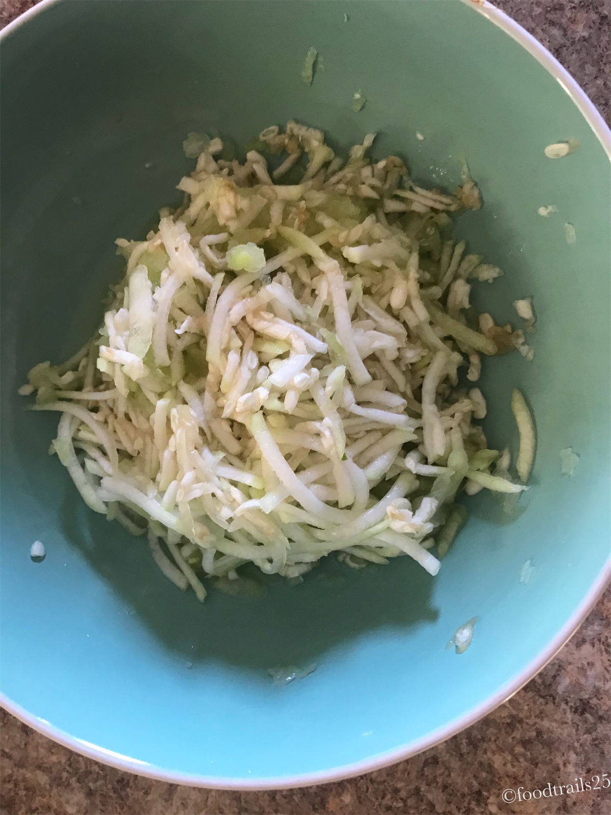 To make Koftas, wash and peel lauki, grated and mix with chickpea flour spices . Add salt just before frying koftas as lauki leaves water and the mixture can become watery. You can squeeze water from grated lauki and use if for binding flour. I do not add extra water to make the batter. The mixture should not be too thick as the fried koftas can get hard when added to curry. Also, do not leave grated lauki open for long, as it starts changing color.