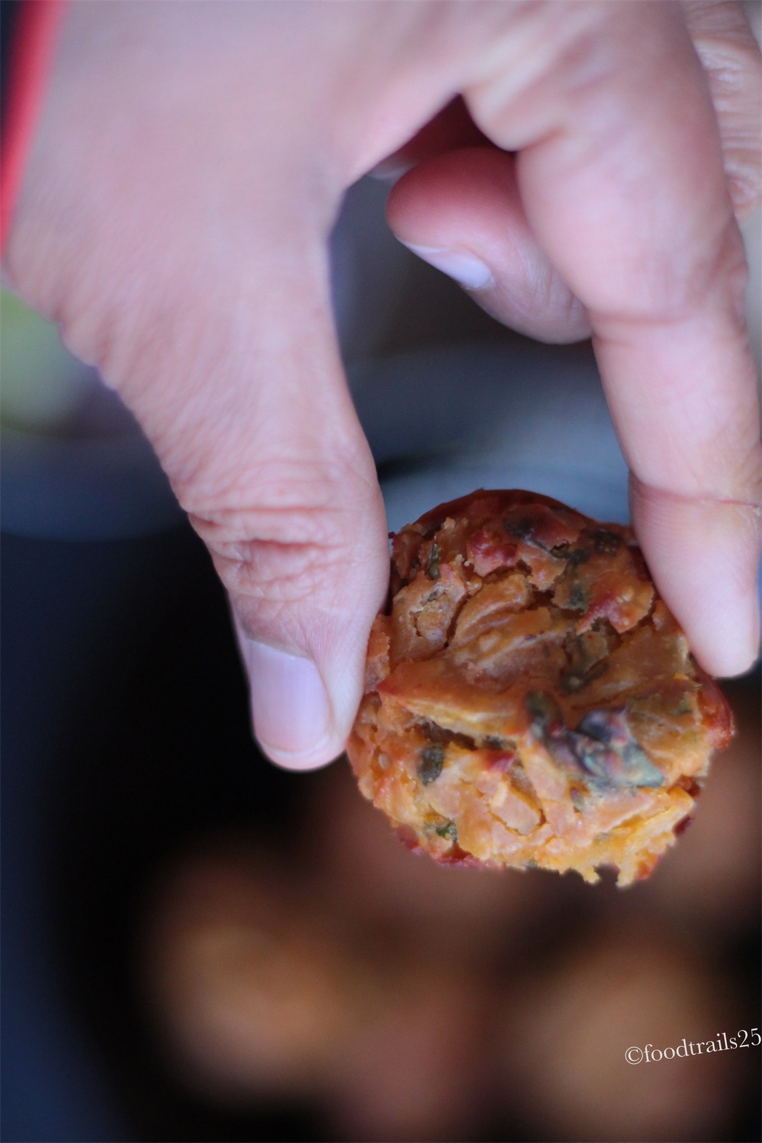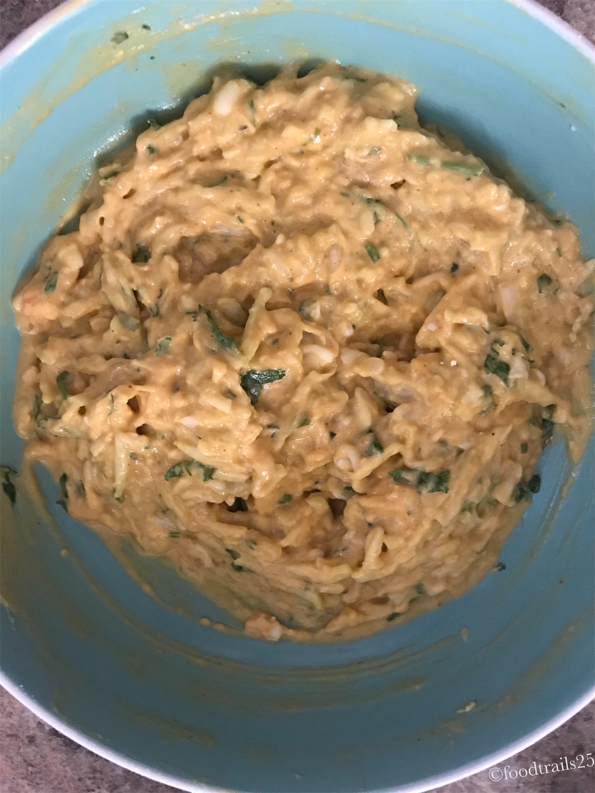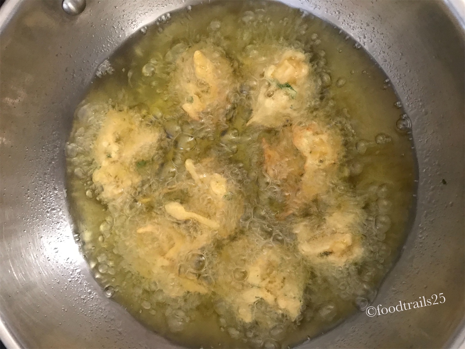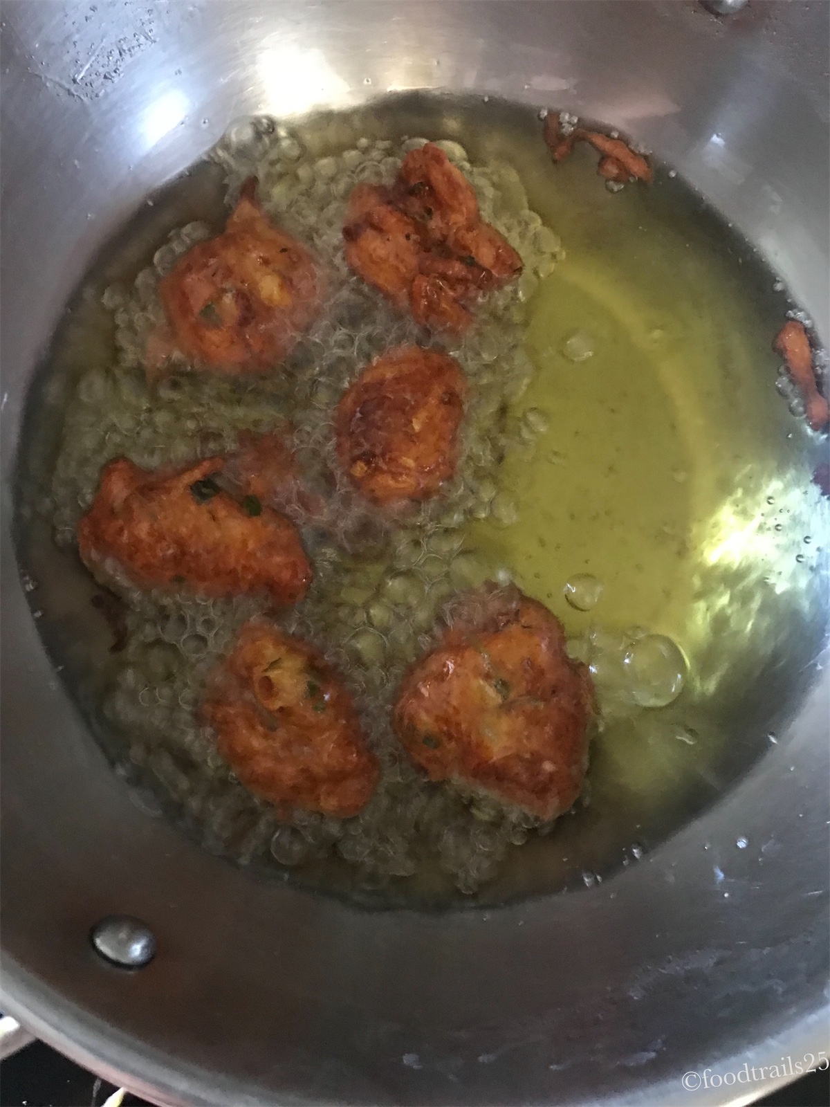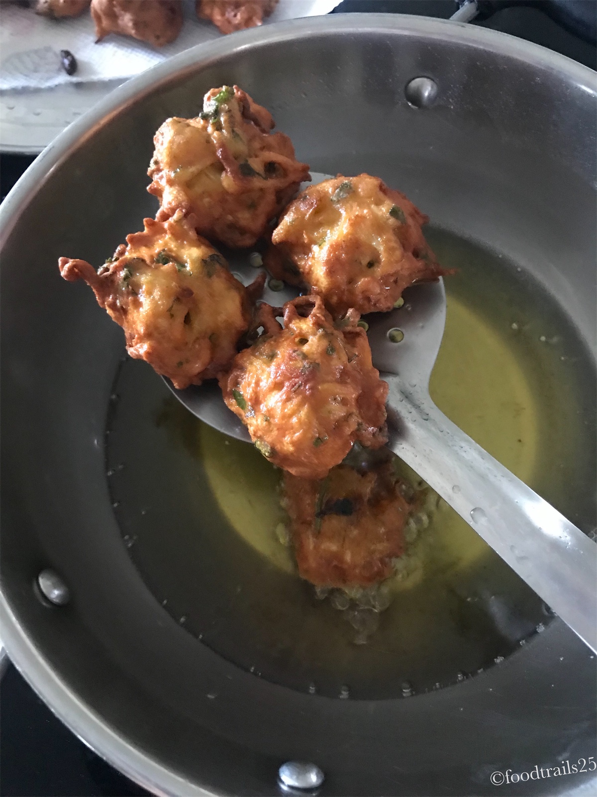 The batter should be of dropping consistency. Take small portions of batter and fry in hot oil till it is golden brown in color. Once fried take out and keep aside on a kitchen towel.
