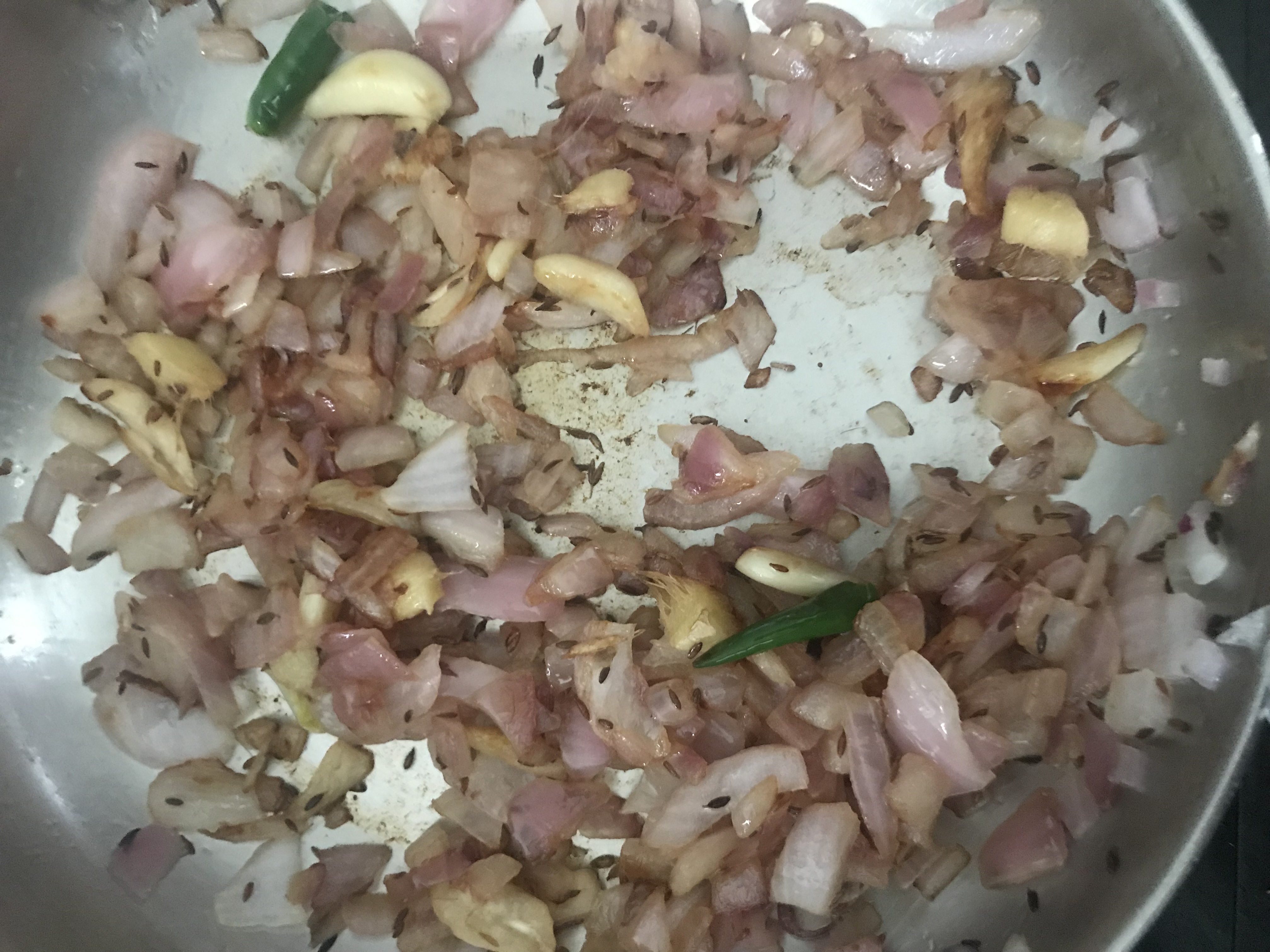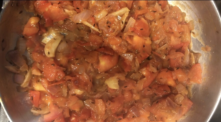 To make masala, roughly chop onions and tomatoes. In a frying pan, add oil once the oil is hot, add cumin seeds and fry onions, ginger and garlic till light brown. add green chilies if you want. Add tomatoes and cook till tomatoes are mushy. Cool masala and grind to a smooth paste.