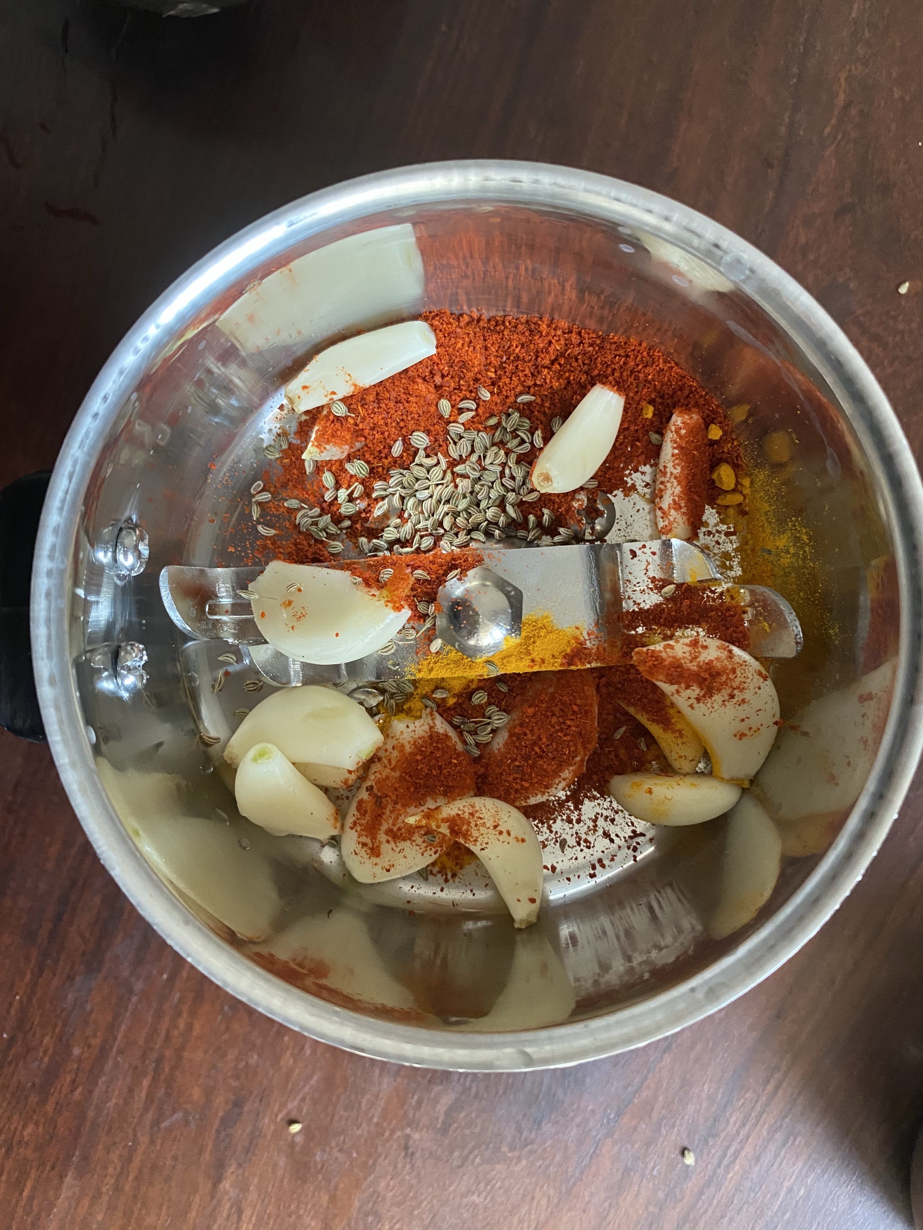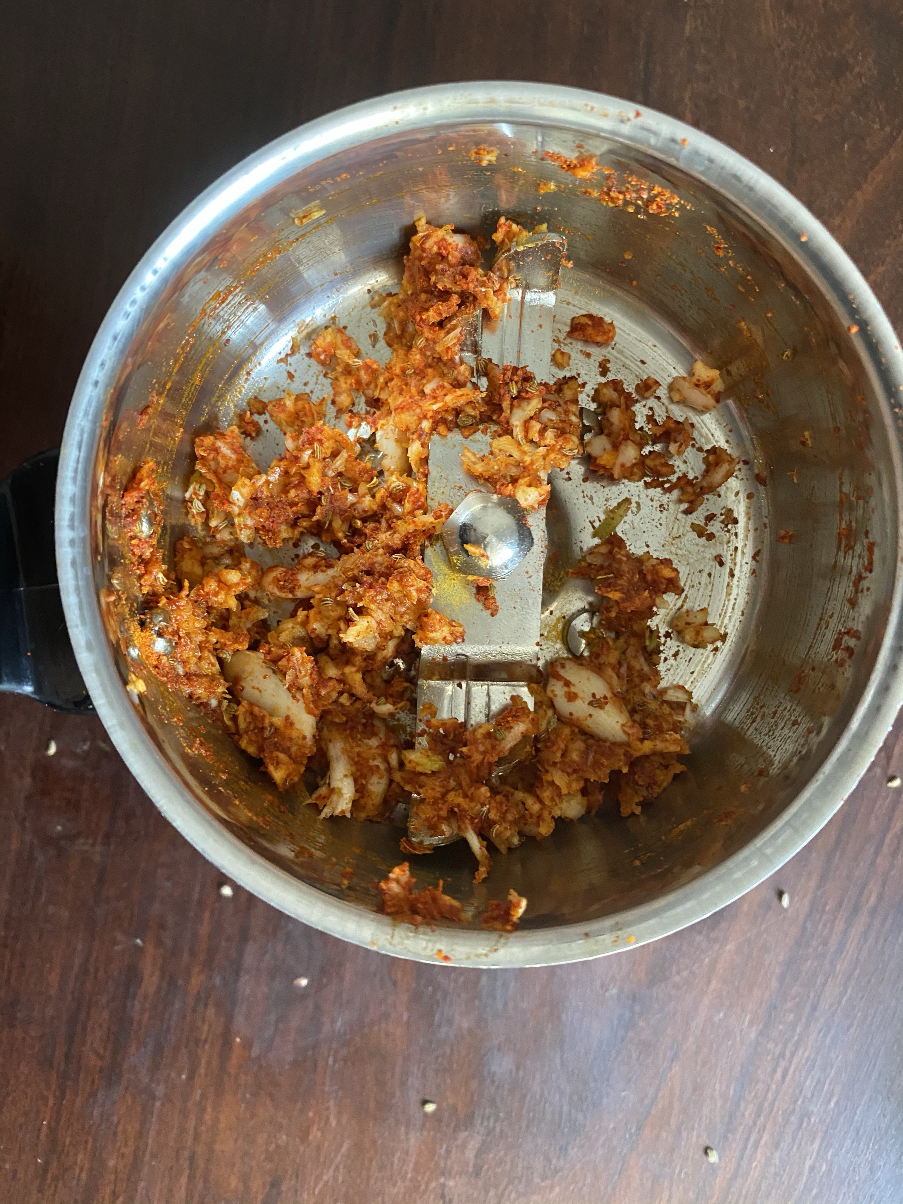 Main step is to make garlic and spice paste. Many people like to make a smooth paste, but I like to keep it coarse. In a grinder add spices, garlic cloves with 1-2 tbsp of water and grind. We like small bits of burnt/deep fried garlic(as small bits get deep fried) that come in sev bites.