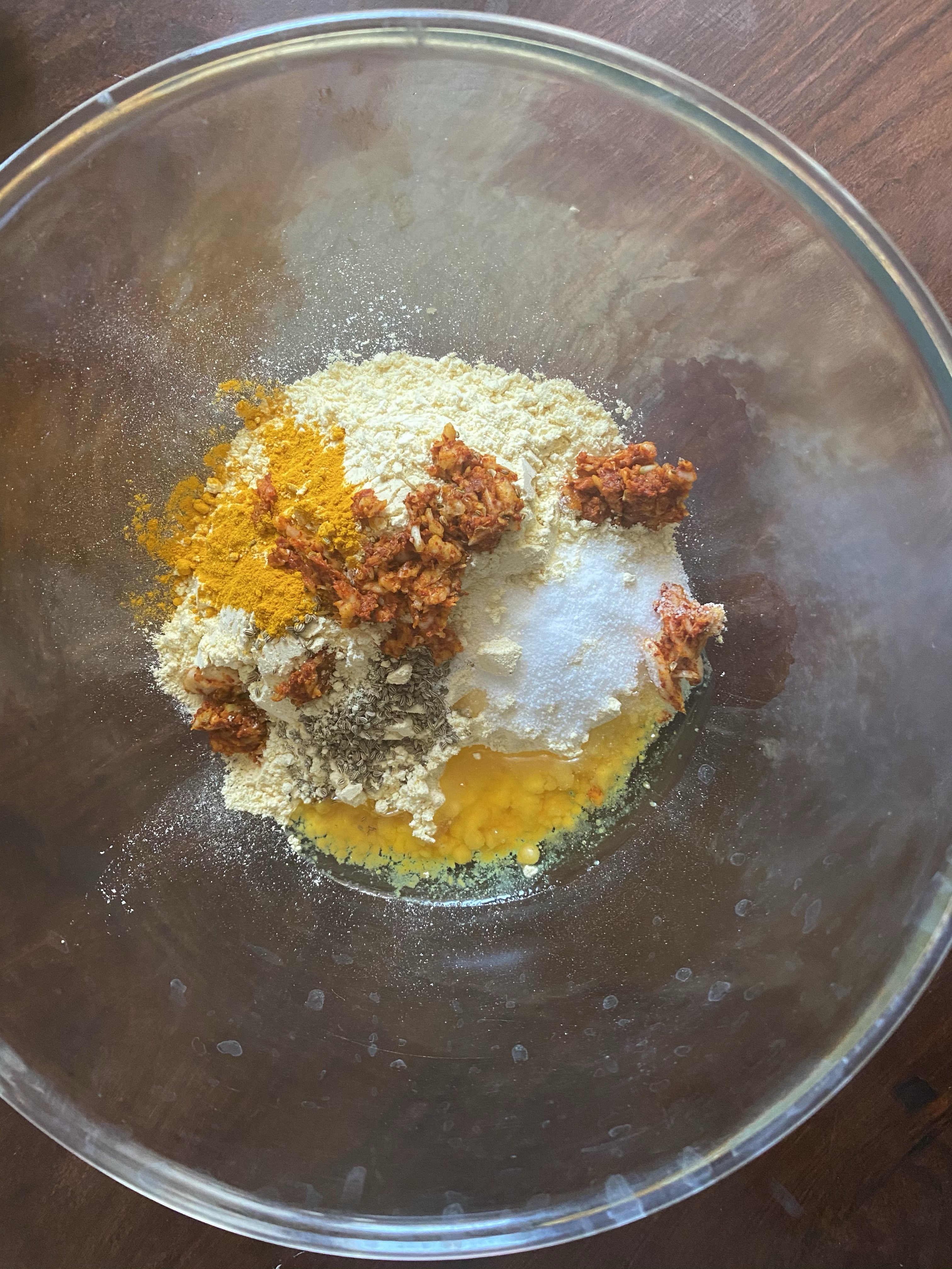 - In a mixing bowl, add besan, rest of the spices, salt and garlic paste.