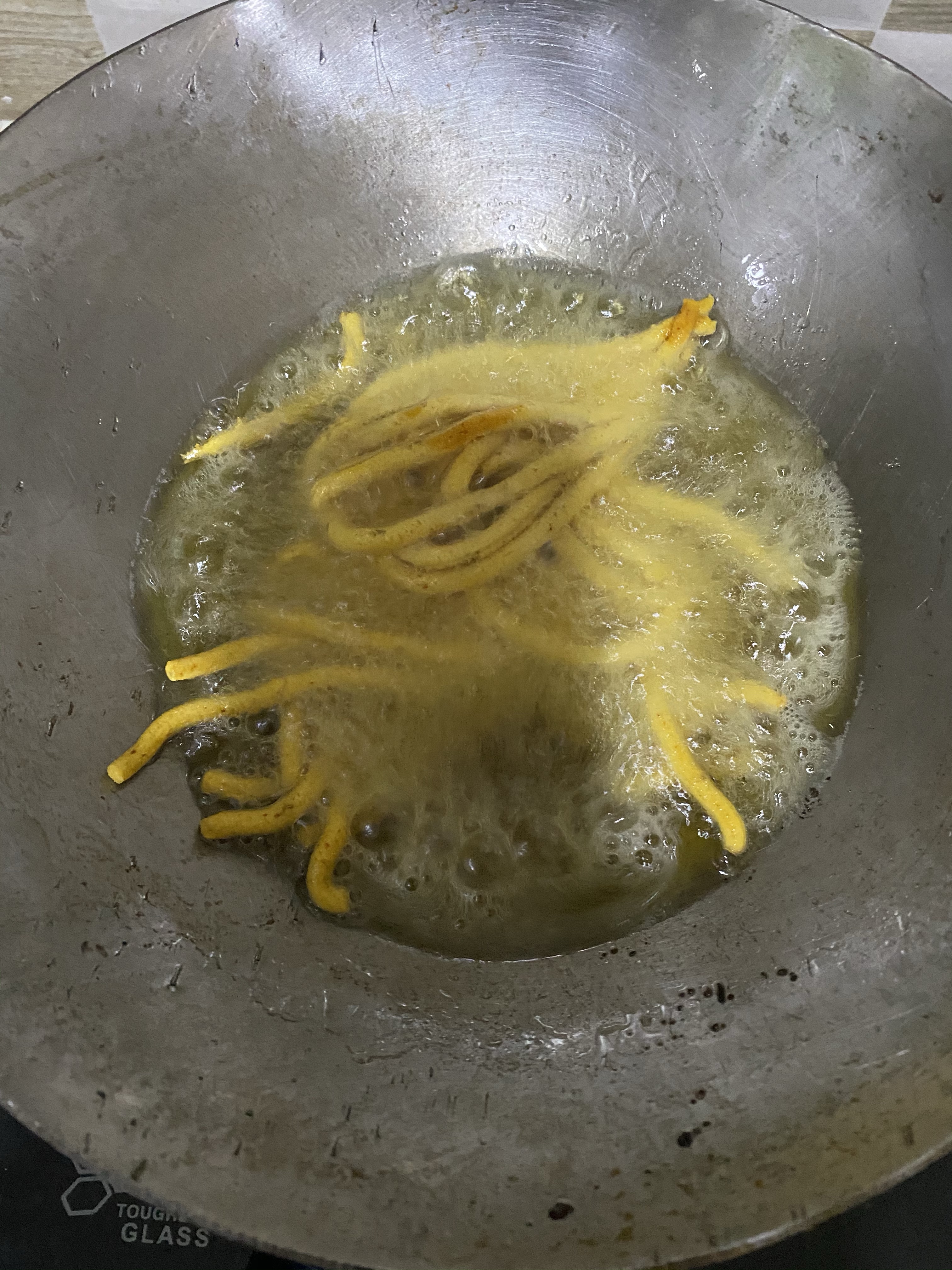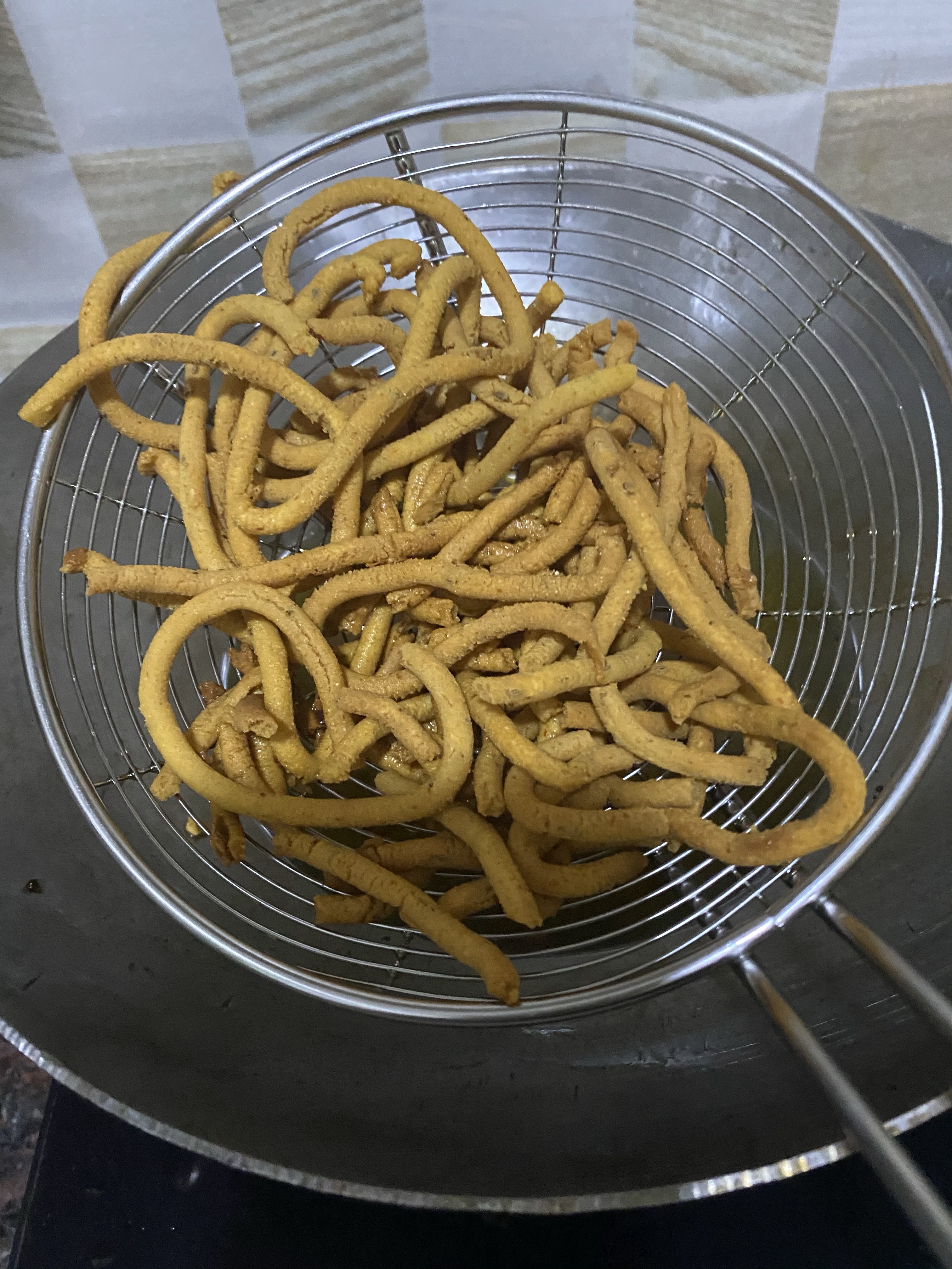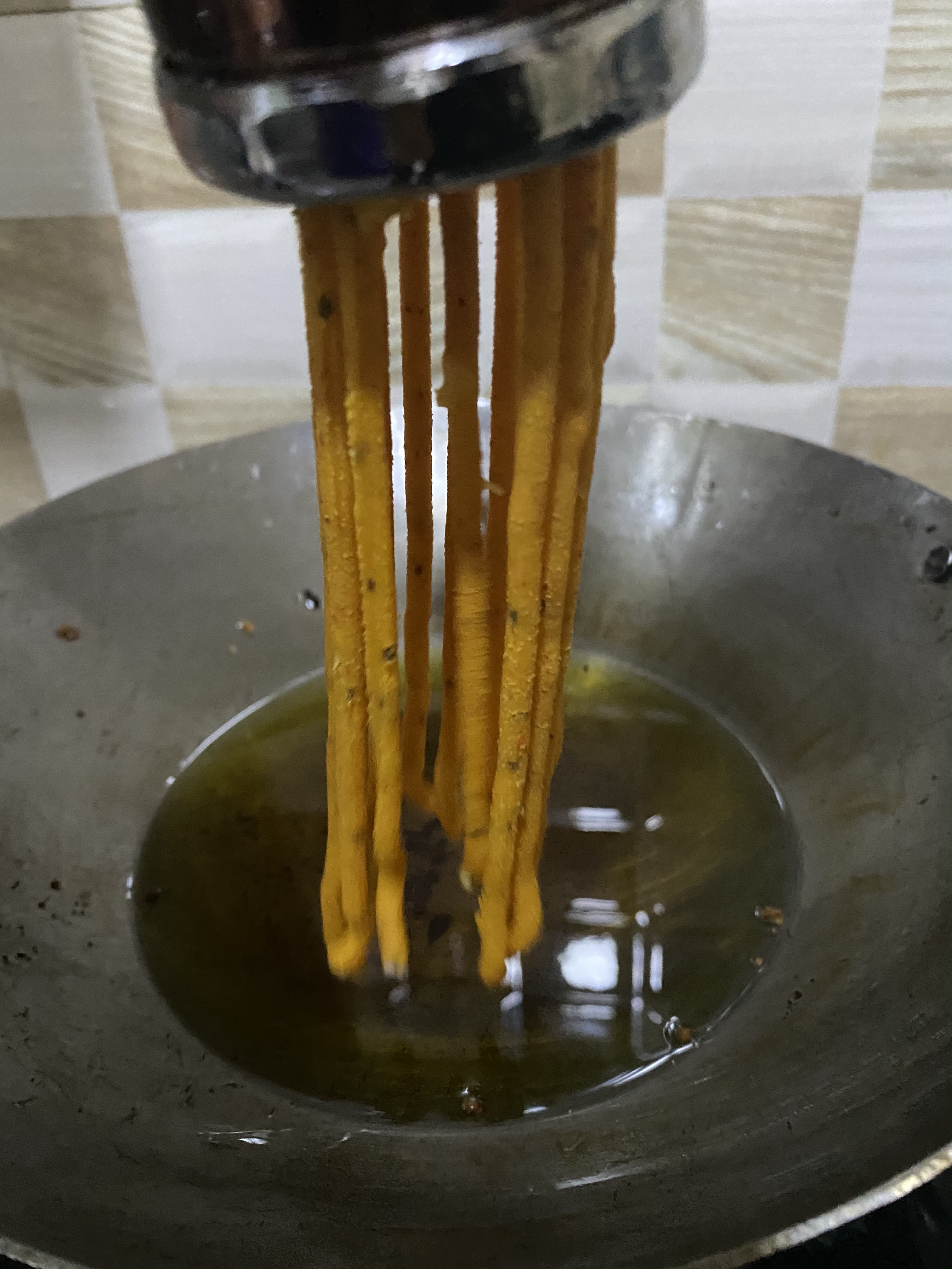 - Press and drop the dough in hot oil in circular motion. It will come like noodles.