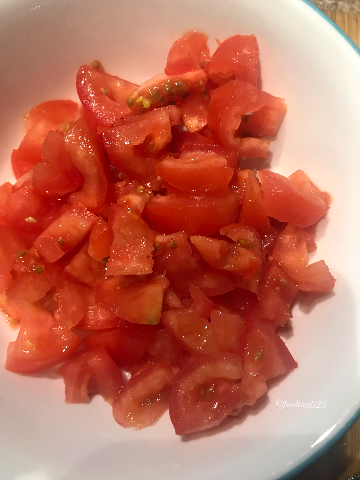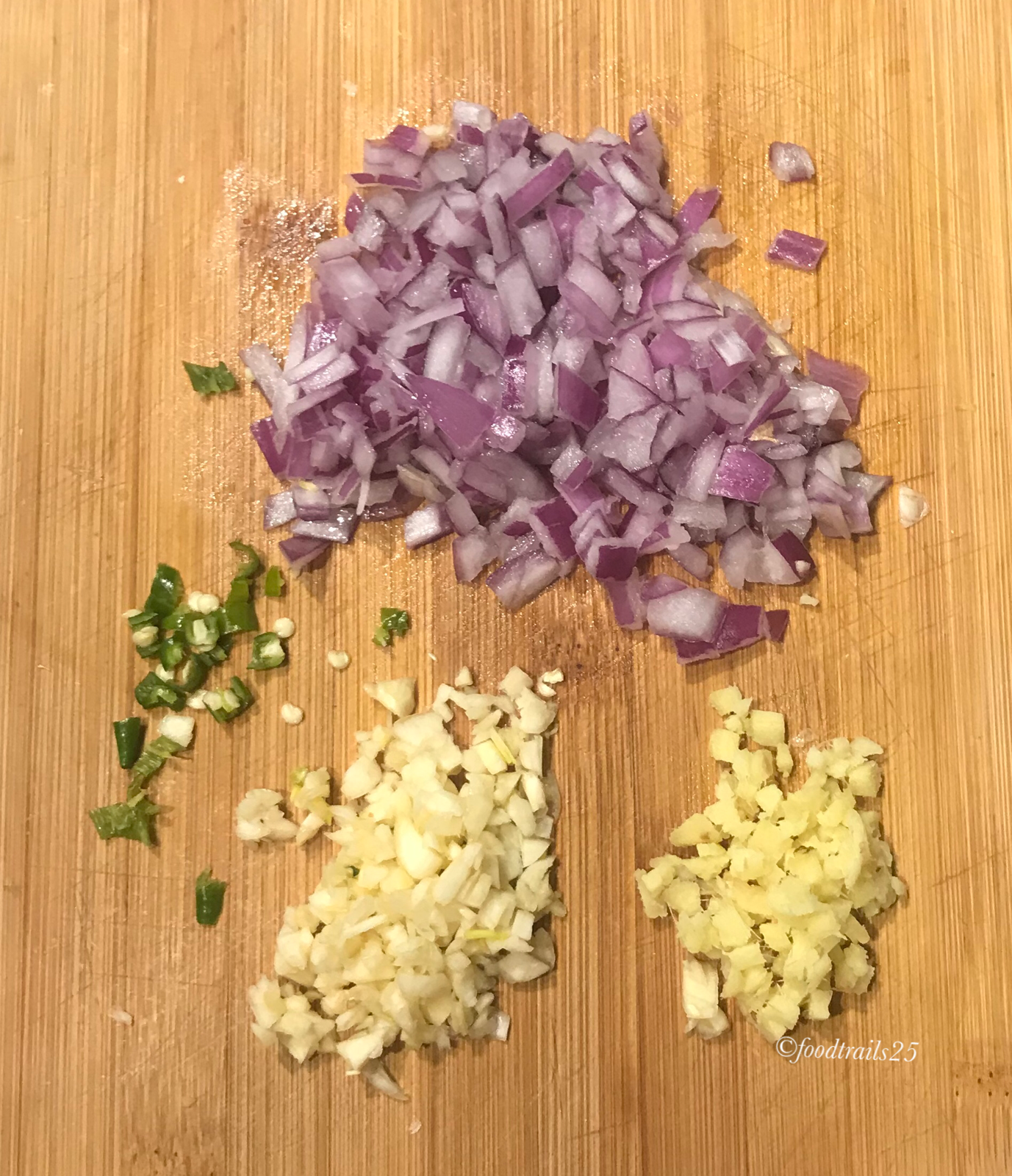 - Meanwhile, finely chop onions, tomatoes, garlic and green chilies(if using).