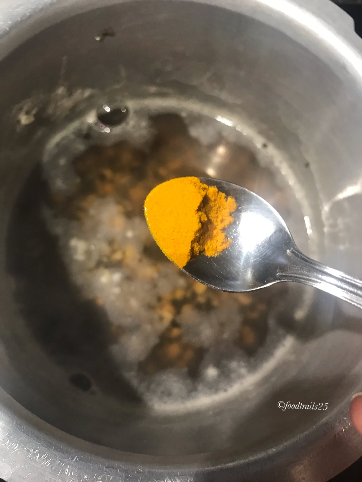 - Add bay leaf, cinnamon stick, turmeric and salt. Add 1Tsp of finely chopped ginger. Close the lid of the pressure cooker and cook lentils till 2 whistles.