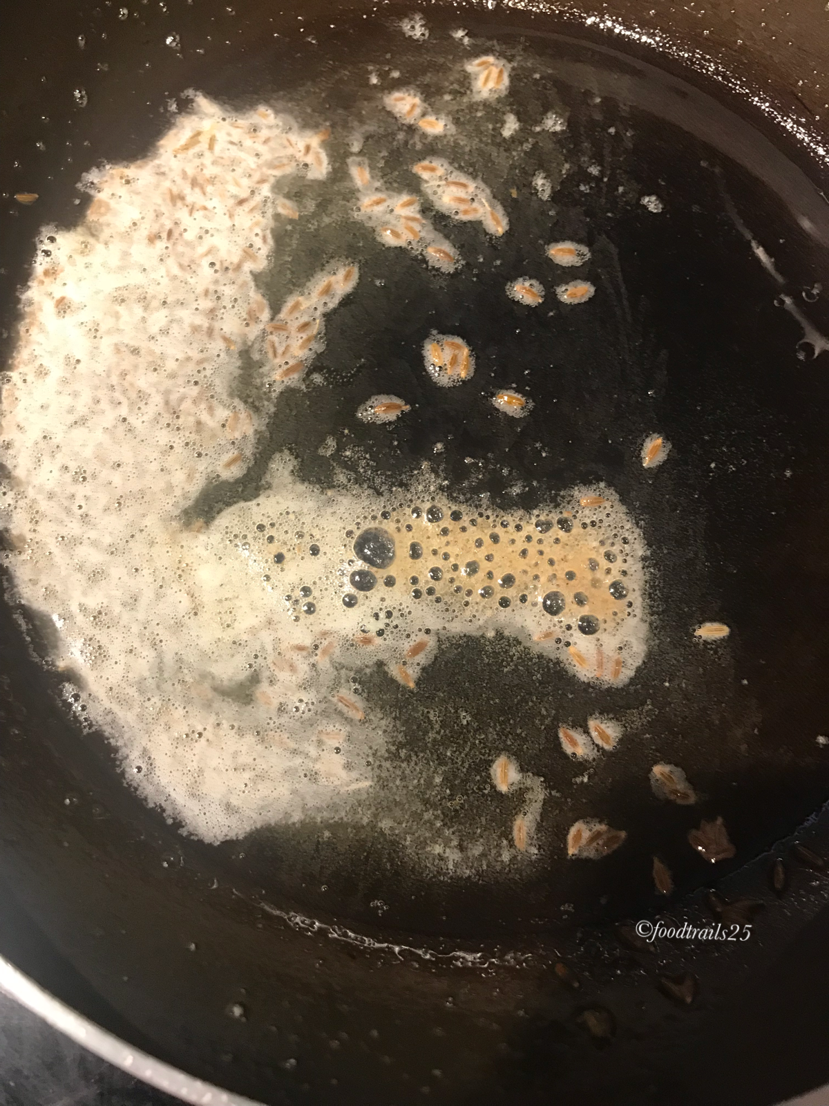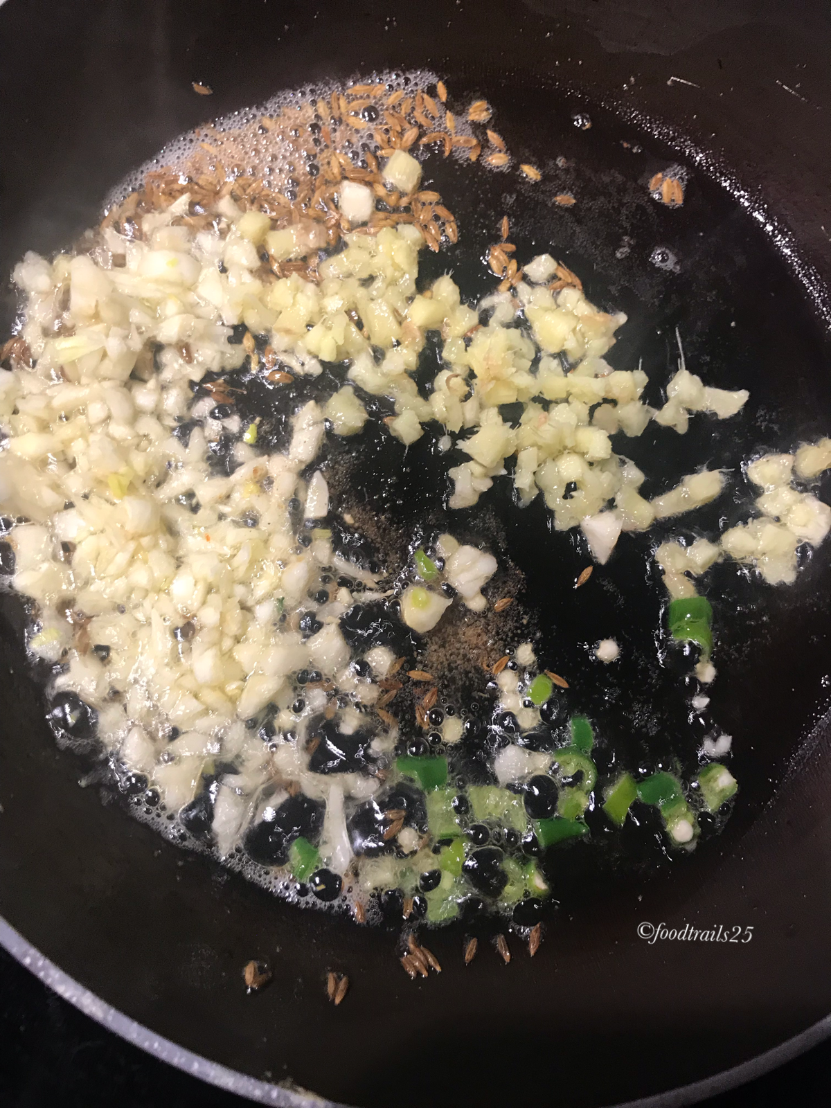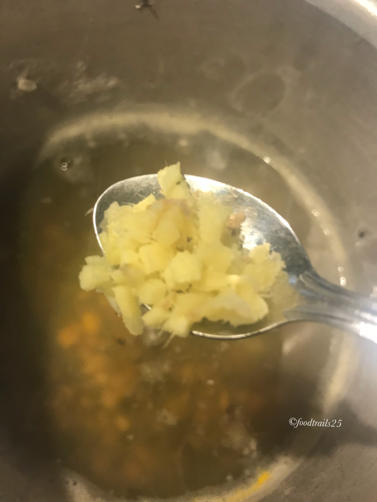 - In a pan, heat ghee/oil, add, asafoetida, cumin seeds, when the seeds start to crackle add chopped garlic and rest of the ginger. Saute till the garlic starts to turn brown.
