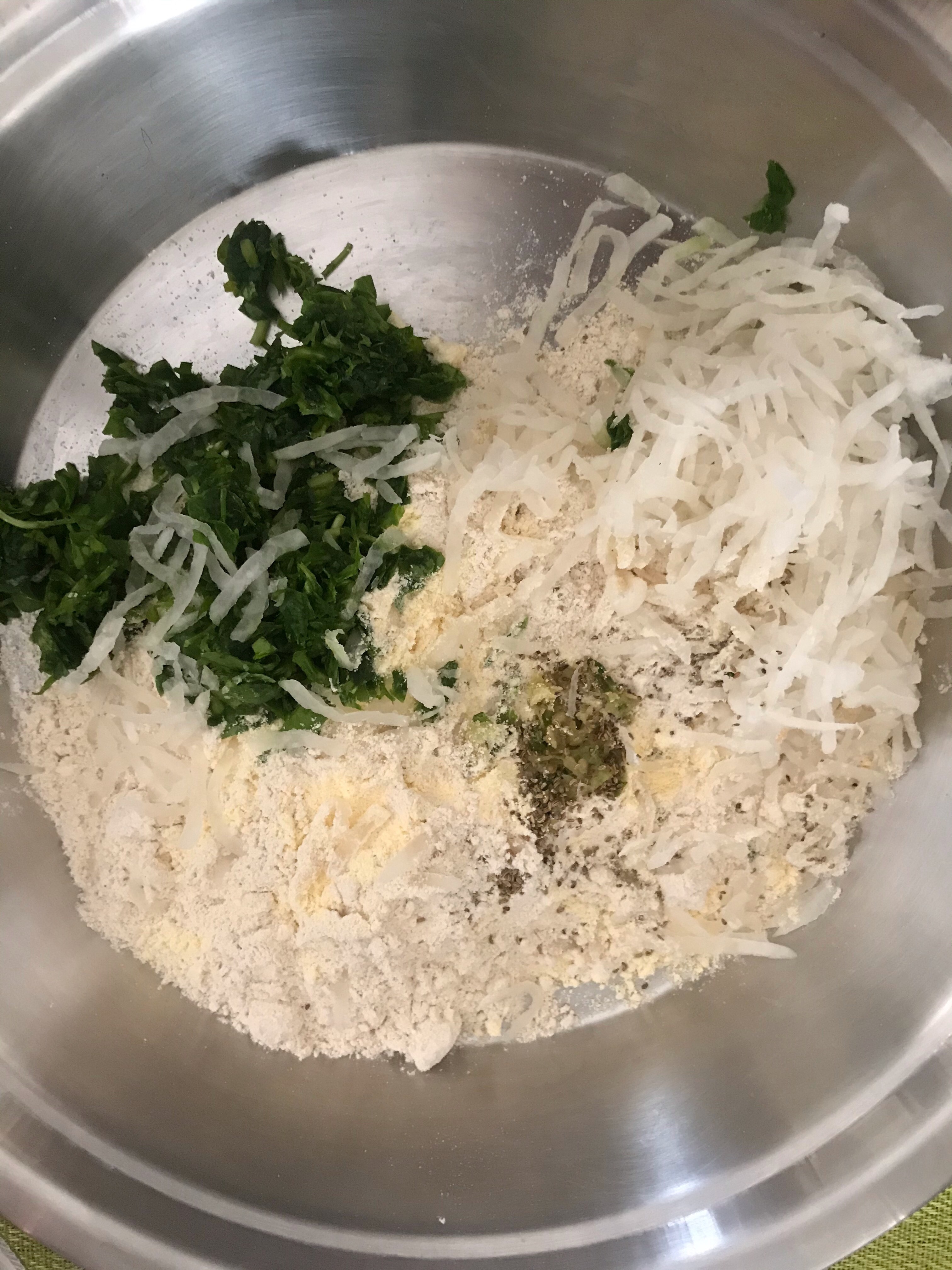 Mix both the flours with all the ingredients and make dough. As radish and fenugreek leave water, do not add water initially. First mix everything and then add water if required.