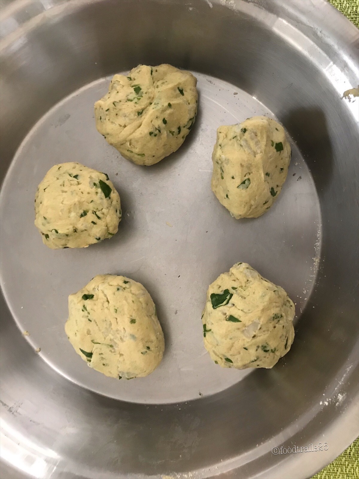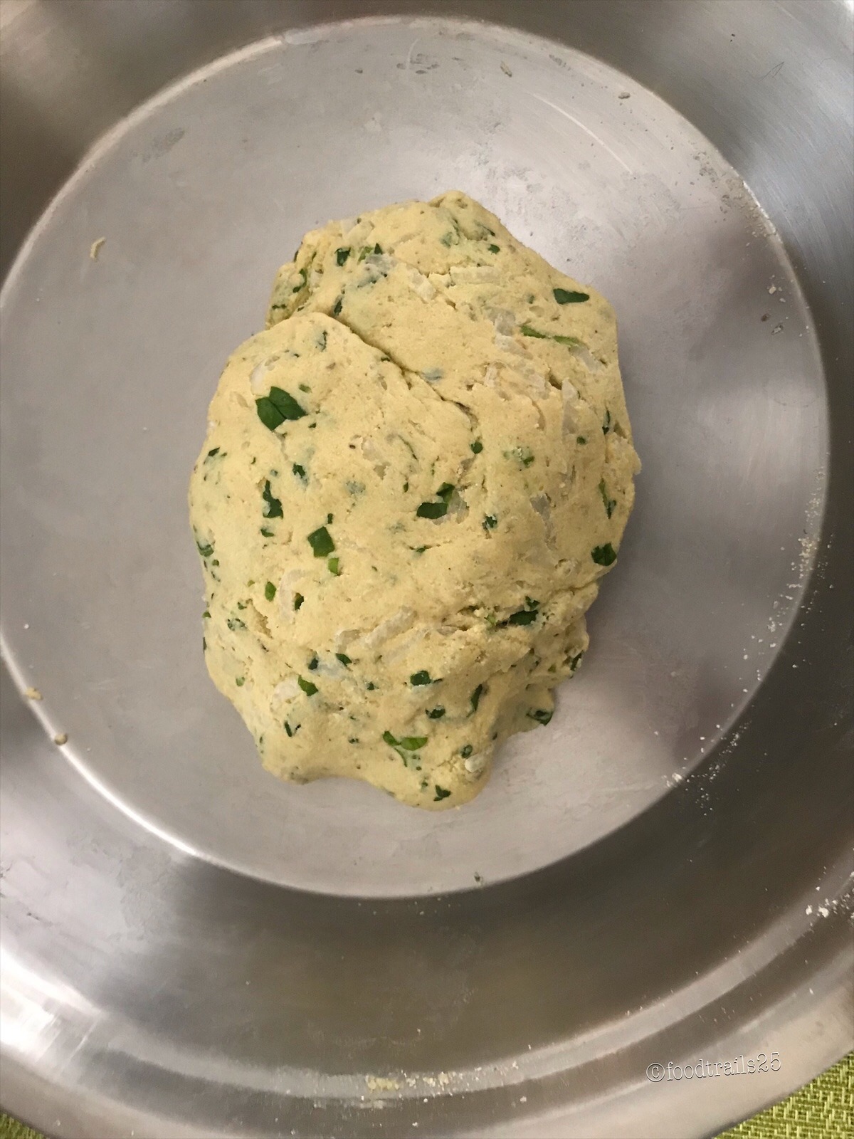 - Mix both the flours with all the ingredients and make dough. As radish and fenugreek leave water, do not add water initially. First mix everything and then add water if required.