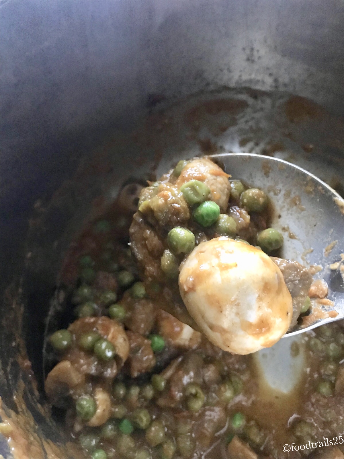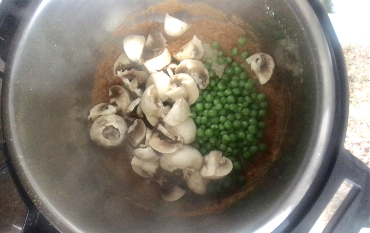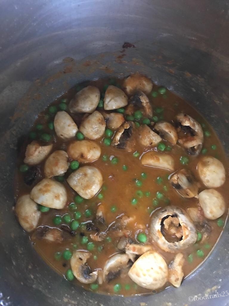 For Stove-top Pressure cooker version, make curry with bhuna masala and spices, add peas and mushrooms and cover with lid and cook till 2 whistles. Add very little water around 1/4 as mushrooms leaves water when cooked.