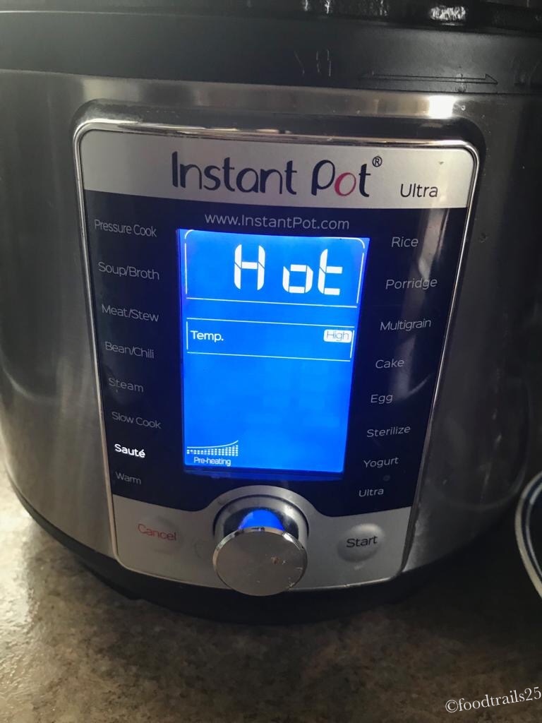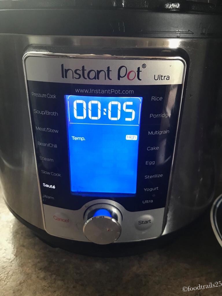 - Swtich on the Instant Pot on SAUTE MODE, set timer for 5 mins.