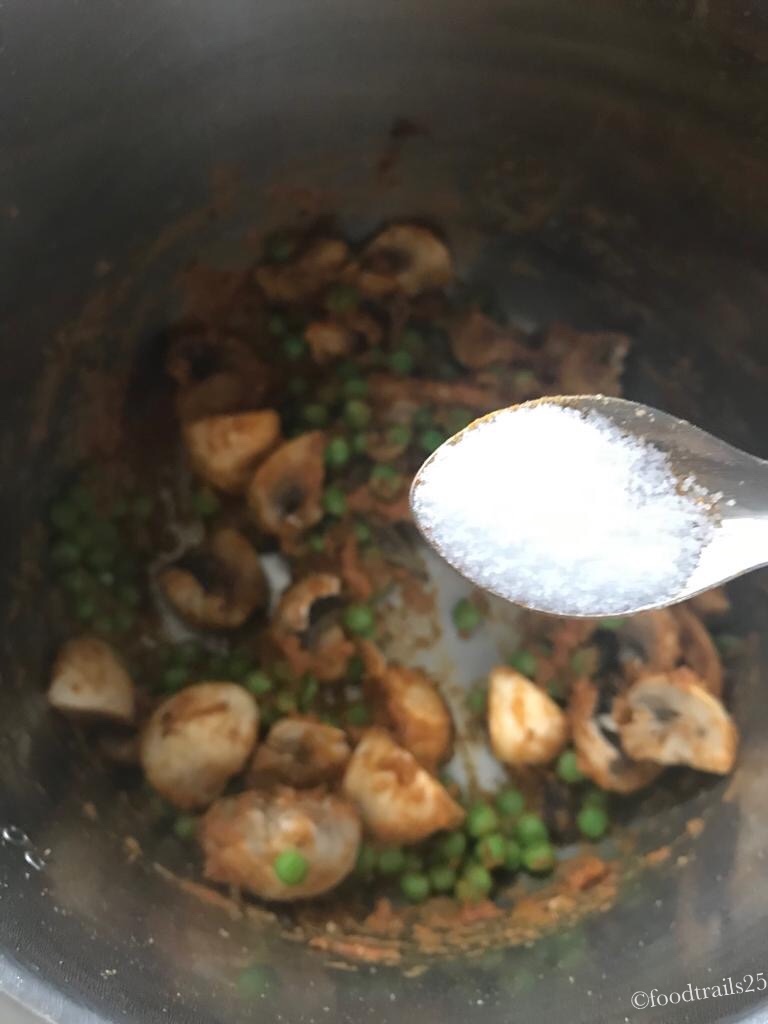 - Add mushrooms and peas and mix well with masala. Add salt. Adjust the consistency of curry, add water as required. Mushrooms leave water when cooked so add water carefully.