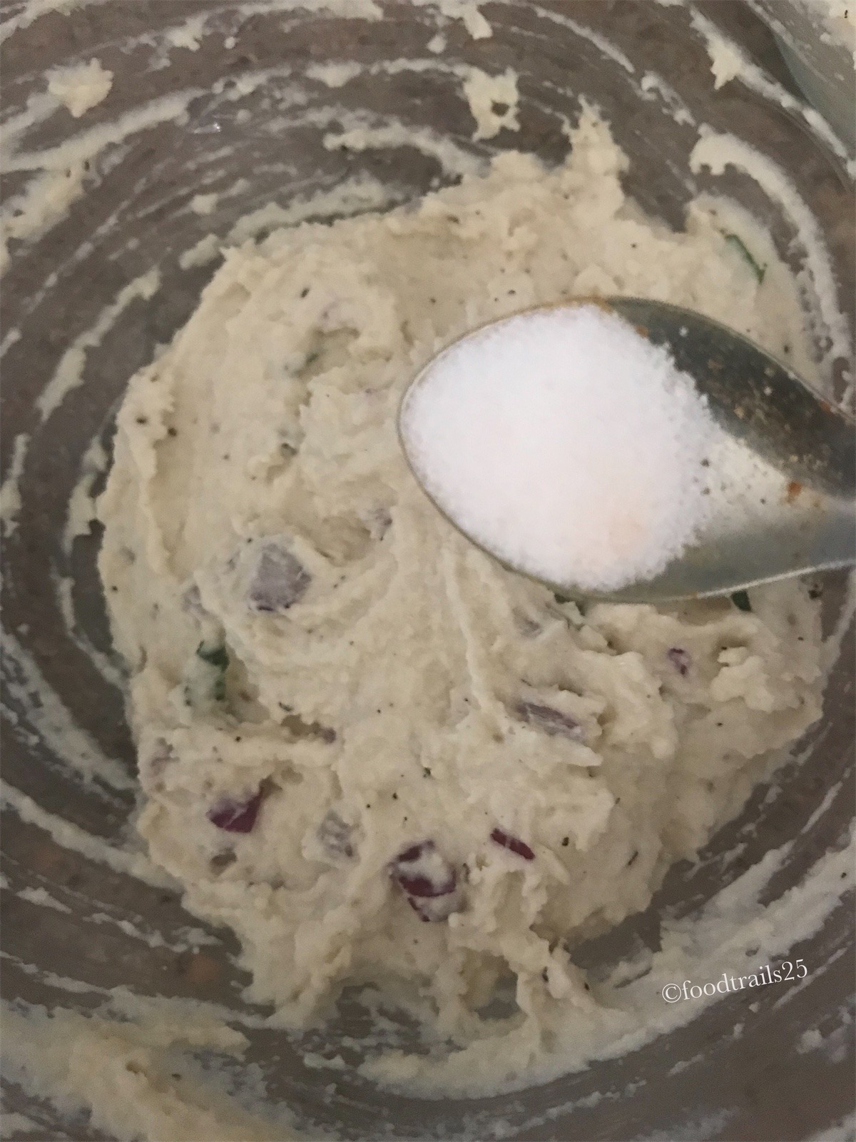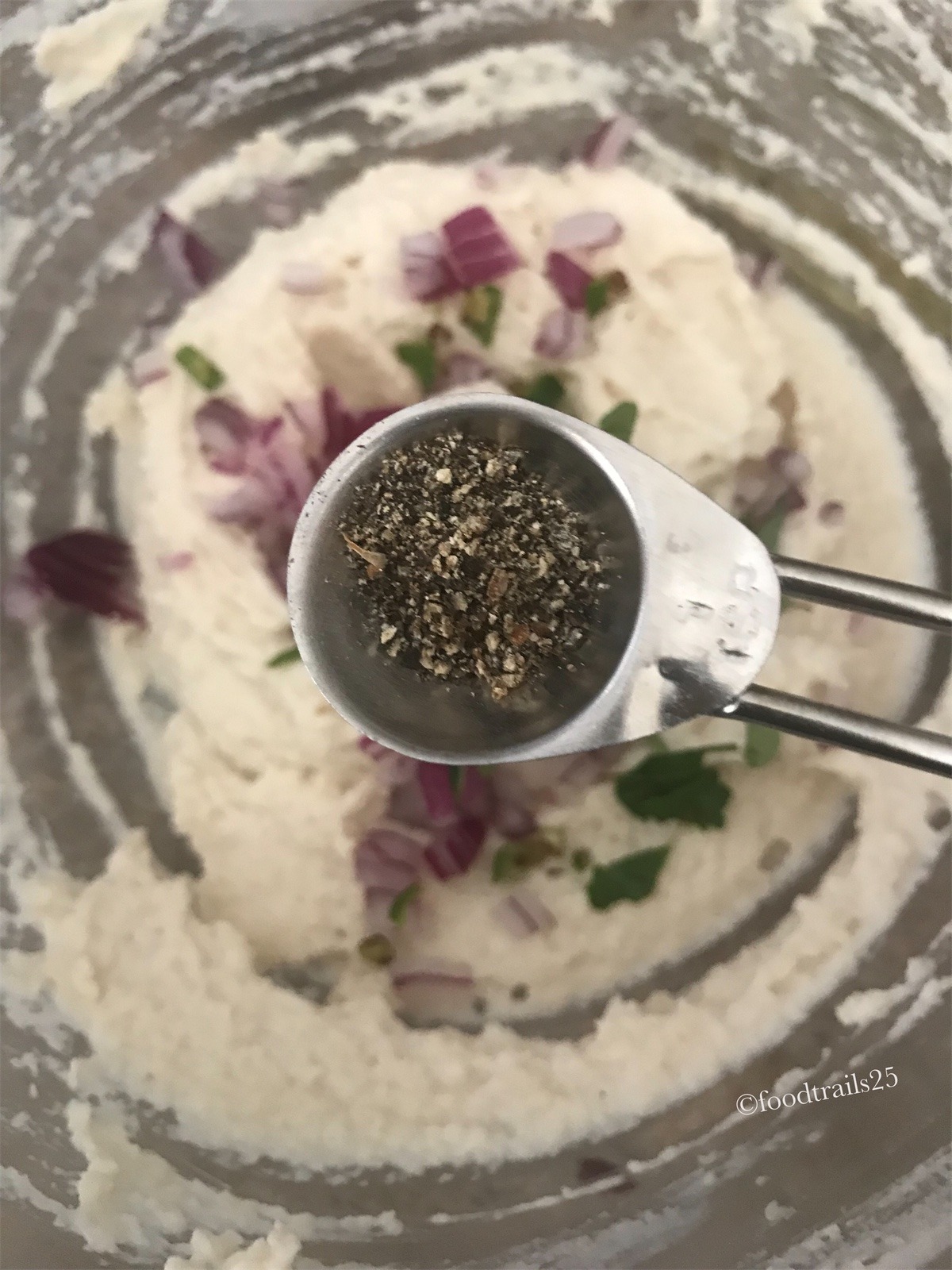 - Add chopped onions, curry leaves, green chillies and cumin seeds with salt. Mix everything well.