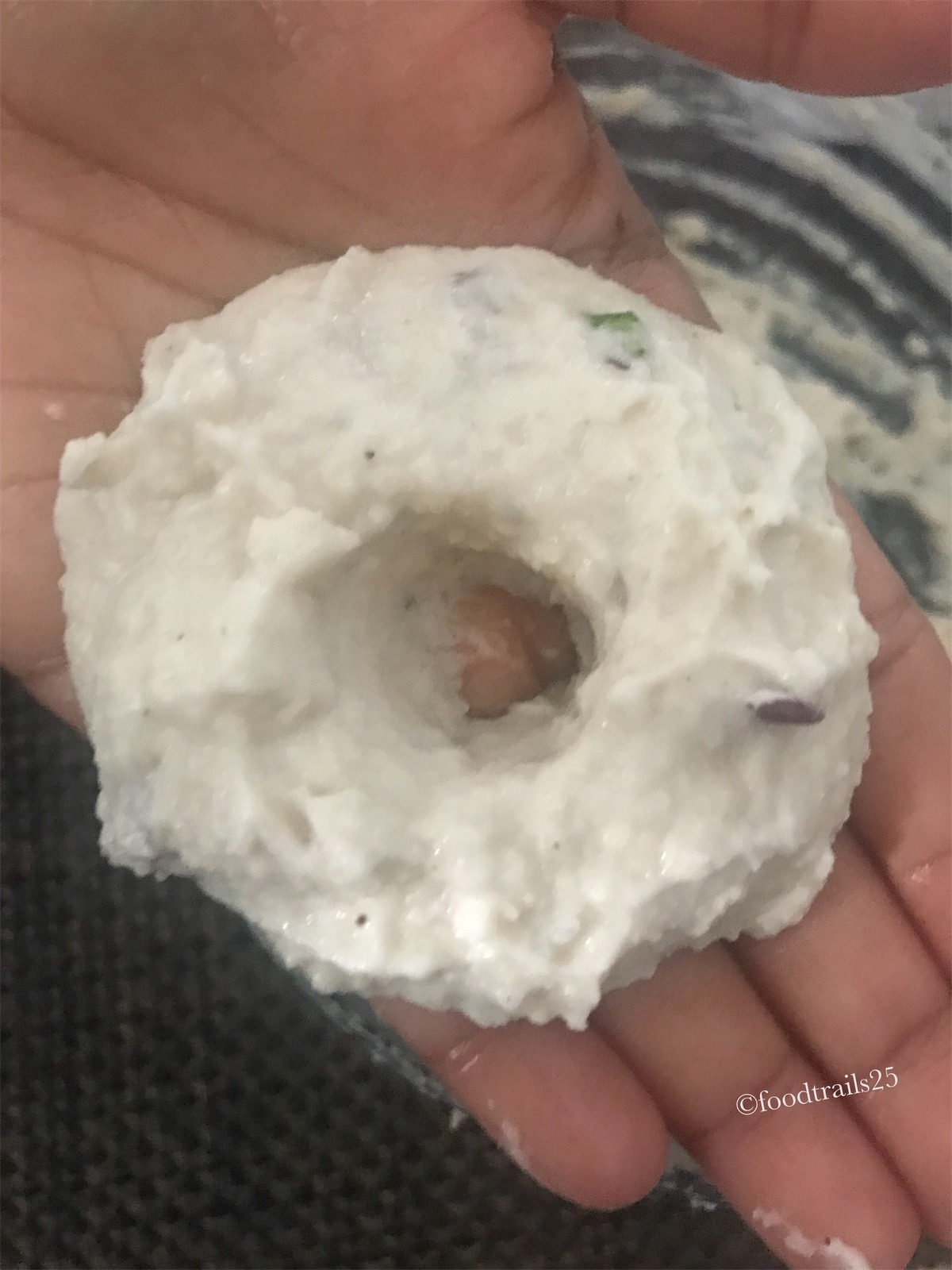 Medu Vada have characteristic shape, just like donuts. The reason of the shape is that the batter with urad lentil is dense and since the vadas are a little bigger in size. The vadas should cook evenly and now remain raw form the center, a hole is made, just like we do in donuts.right hand, then make a hole giving it the shape of donut.