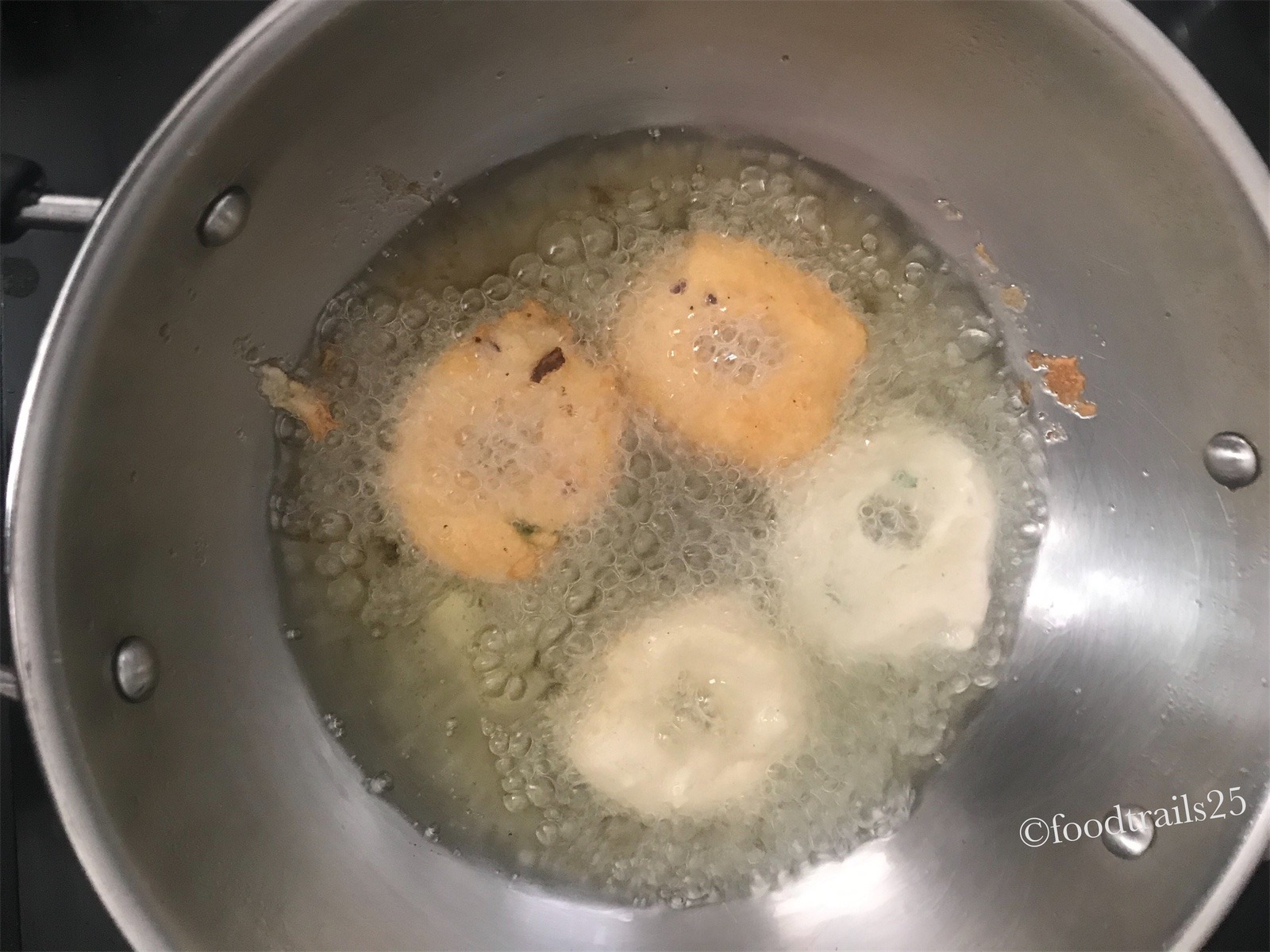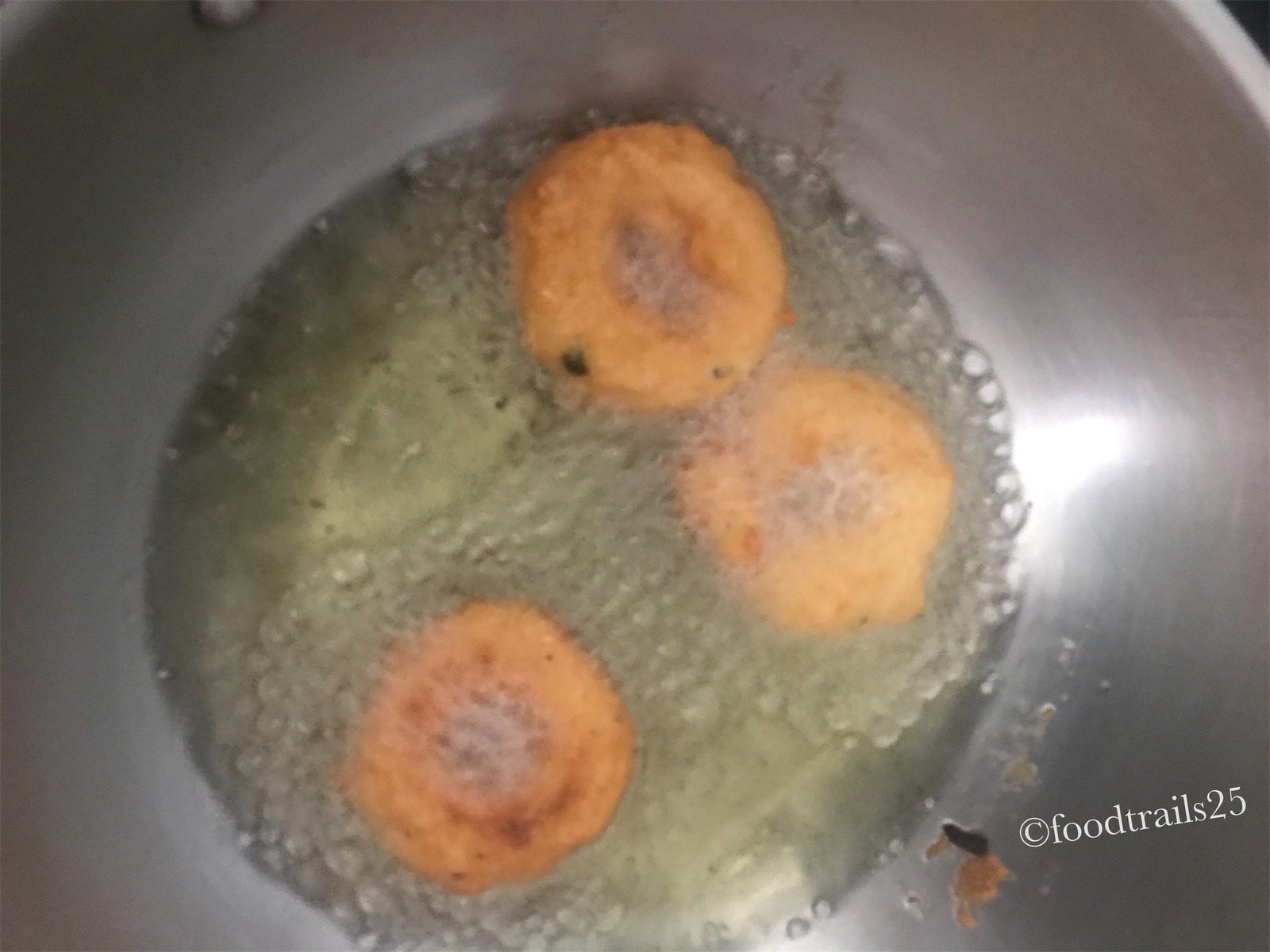 I have seen a Vada Vendor( who hailed from Karnataka) in Mumbai in our locality frying the vadas twice. First time he fried the vadas lightly on low flame. Took out the batch and then keep it outside for a few minutes, till the other batch he fried. Then again on medium to high flame he again fried the vadas. His Vadas with chutneys were famous in our locality and people would queue outside his shop in mornings and evening for the vadas and idlis. I usually do not fry vadas twice, only when if making for guests. Fry the vadas lightly before guests arrive and then just before serving fry it again. It really gives crispy vadas.