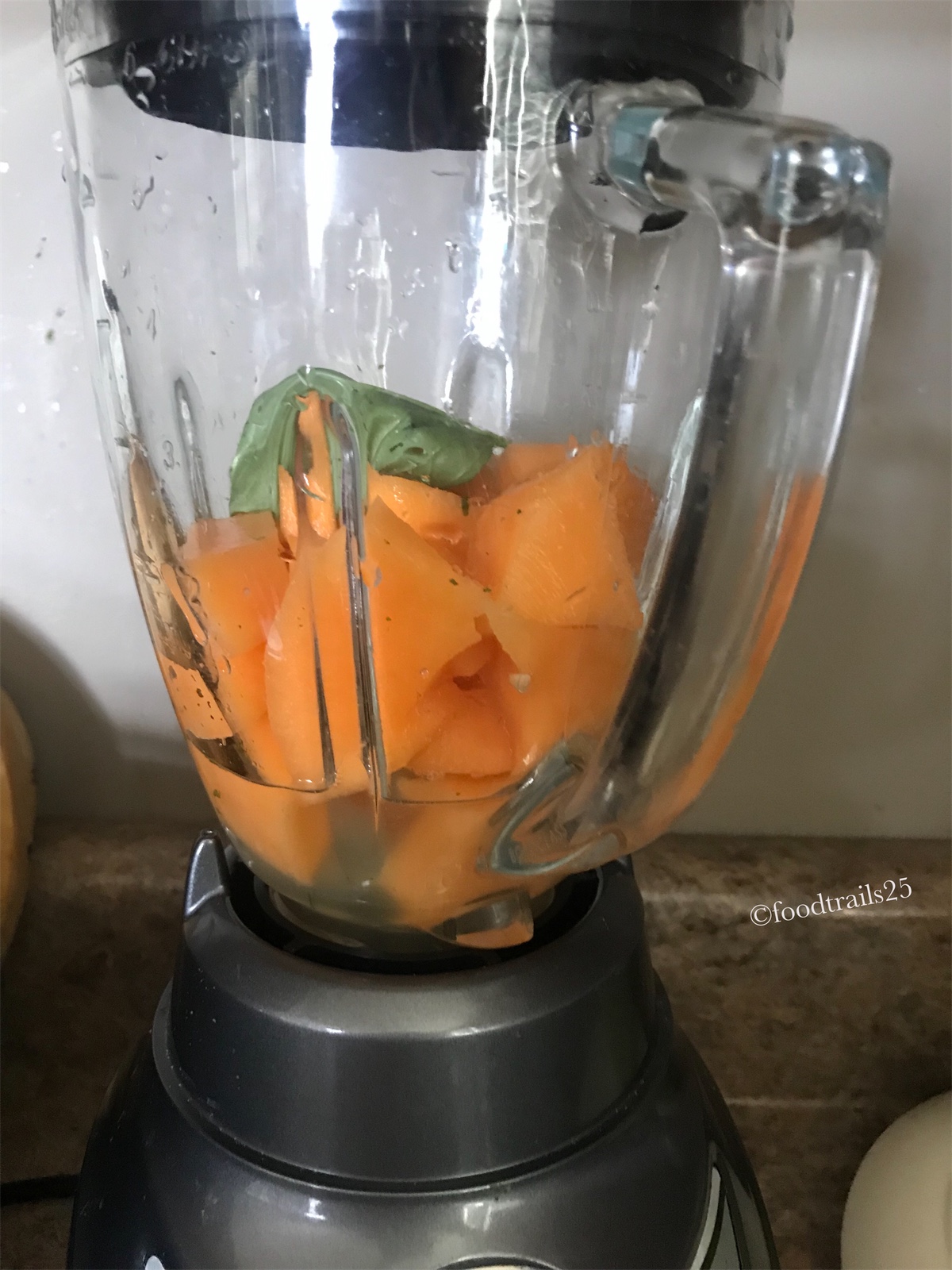 Making this refreshing agua fresca/ summer cooler is very easy. Just wash, cut, peel, slice and blend the melon pieces in a blender with few basil leaves and lemon/lime juice. Add water and blender to smooth mix. I do not add sugar to it as the melons that I used were quite sweet. If you want you can add some sugar if the melons you are using are not sweet. Before serving chill it. You can add few pieces kiwi or strawberry to add some tangy taste to the cooler.