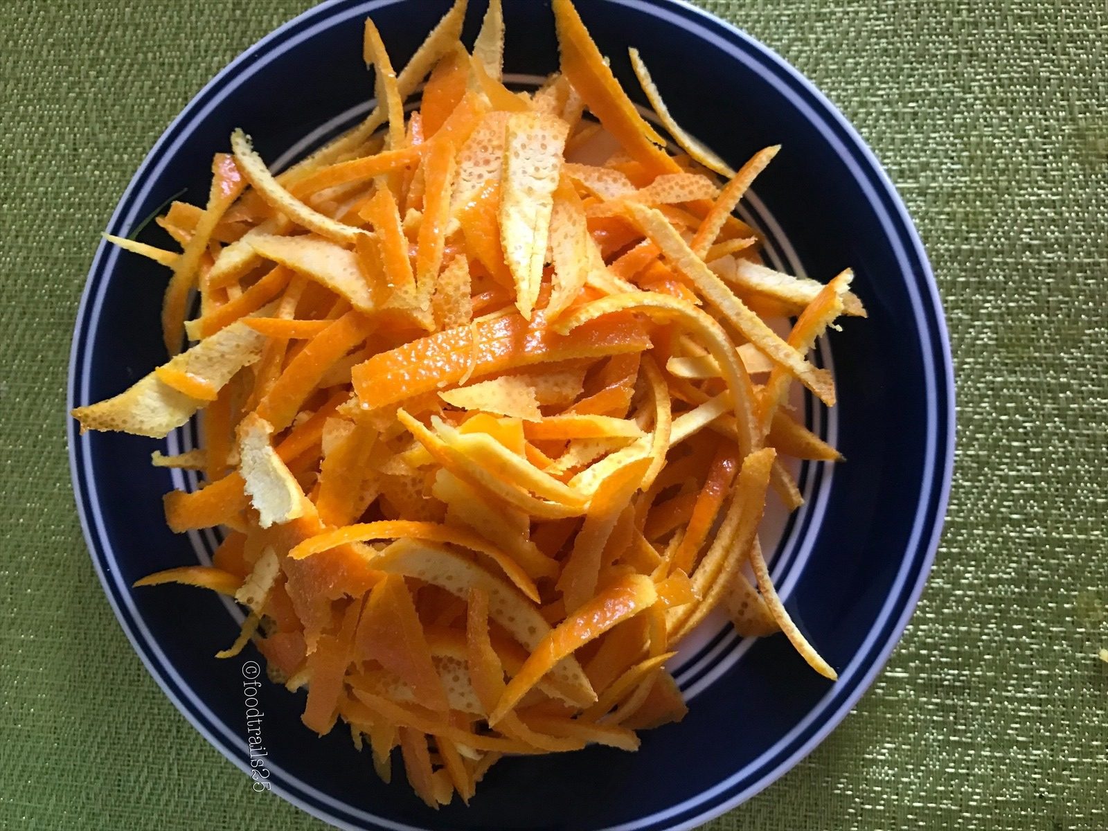 Using the amount of peel depends on one's personal preference. You can use all of the thinly sliced peel or use half of it. I prefer using half of the peel and use rest for making Candied Citrus Peels.