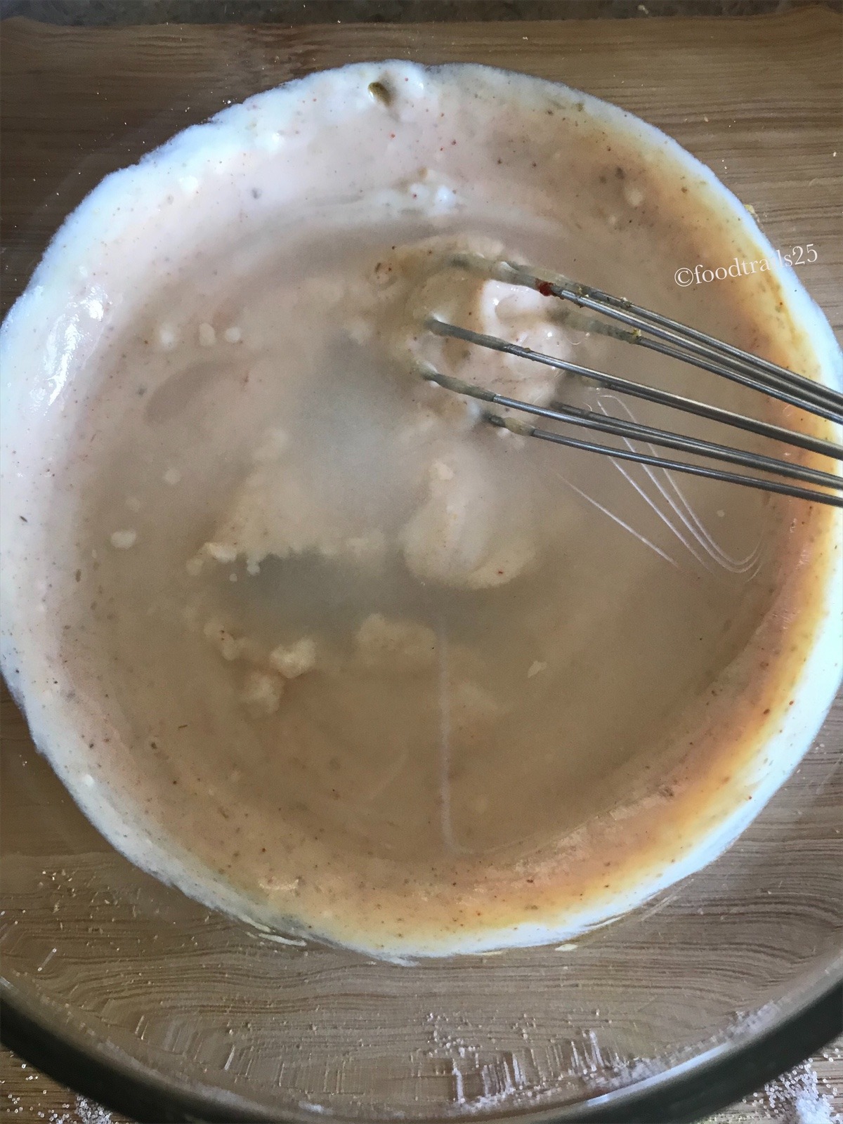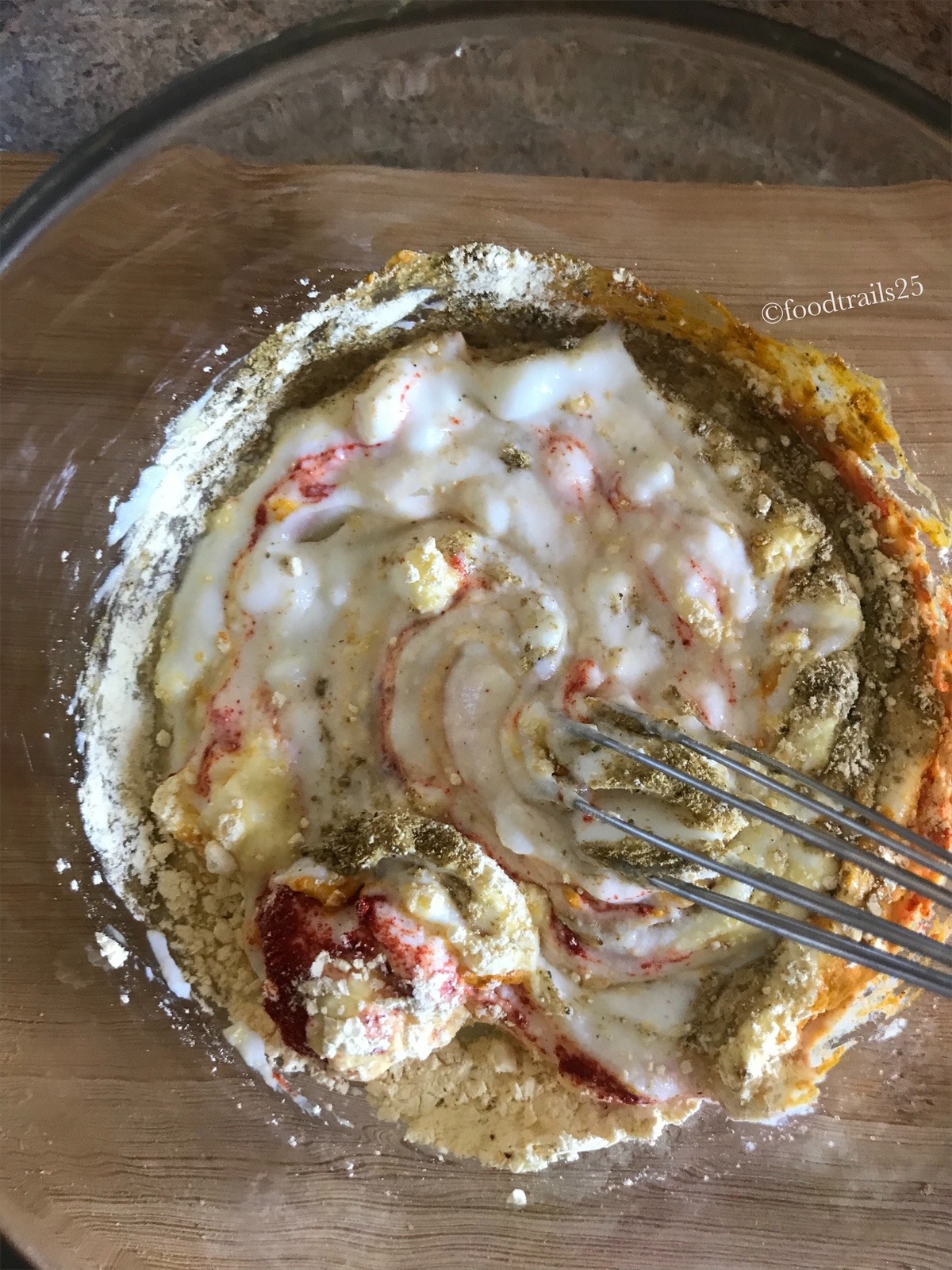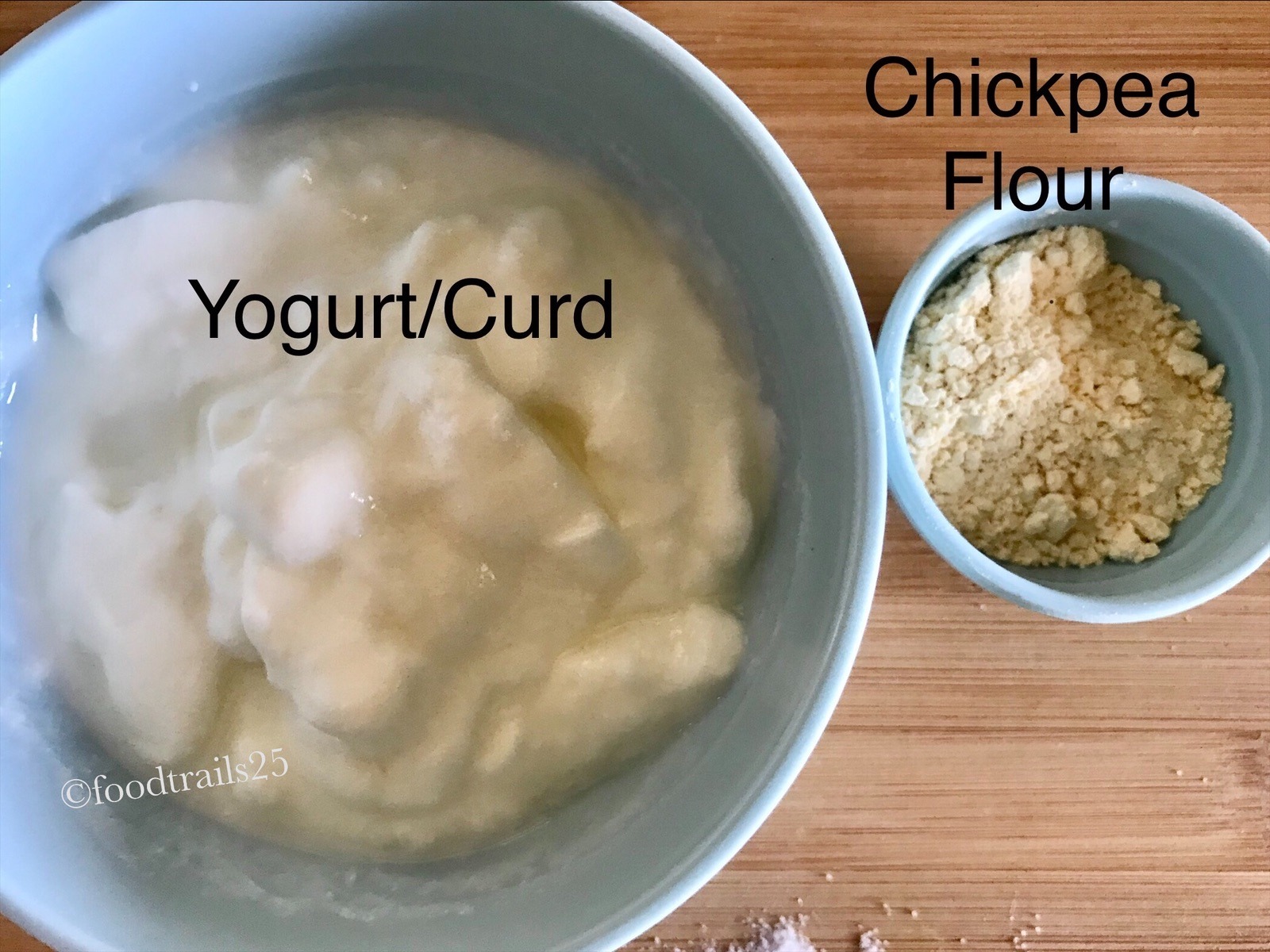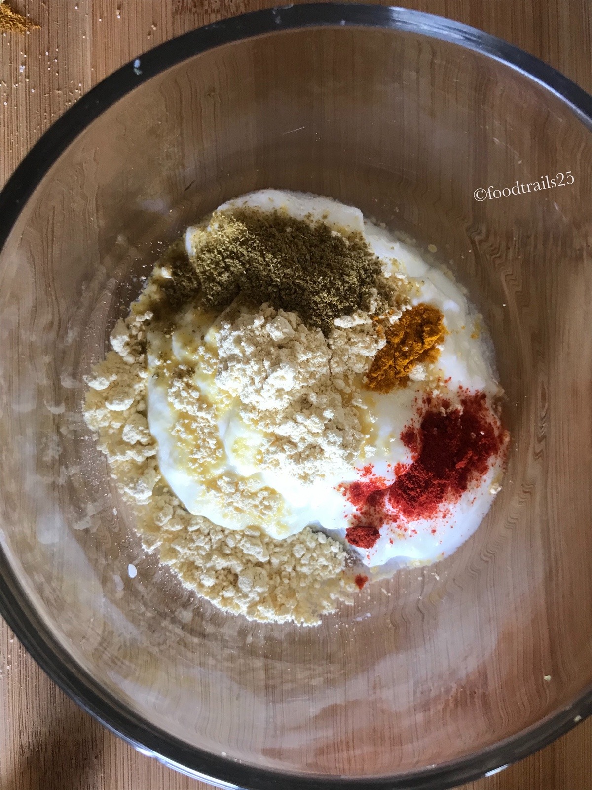 - In a mixing bowl, add yogurt, chickpea flour/besan , salt and other powdered spices like coriander powder, red chilli powder, turmeric powder.Add about 1 cup of water and mix well.