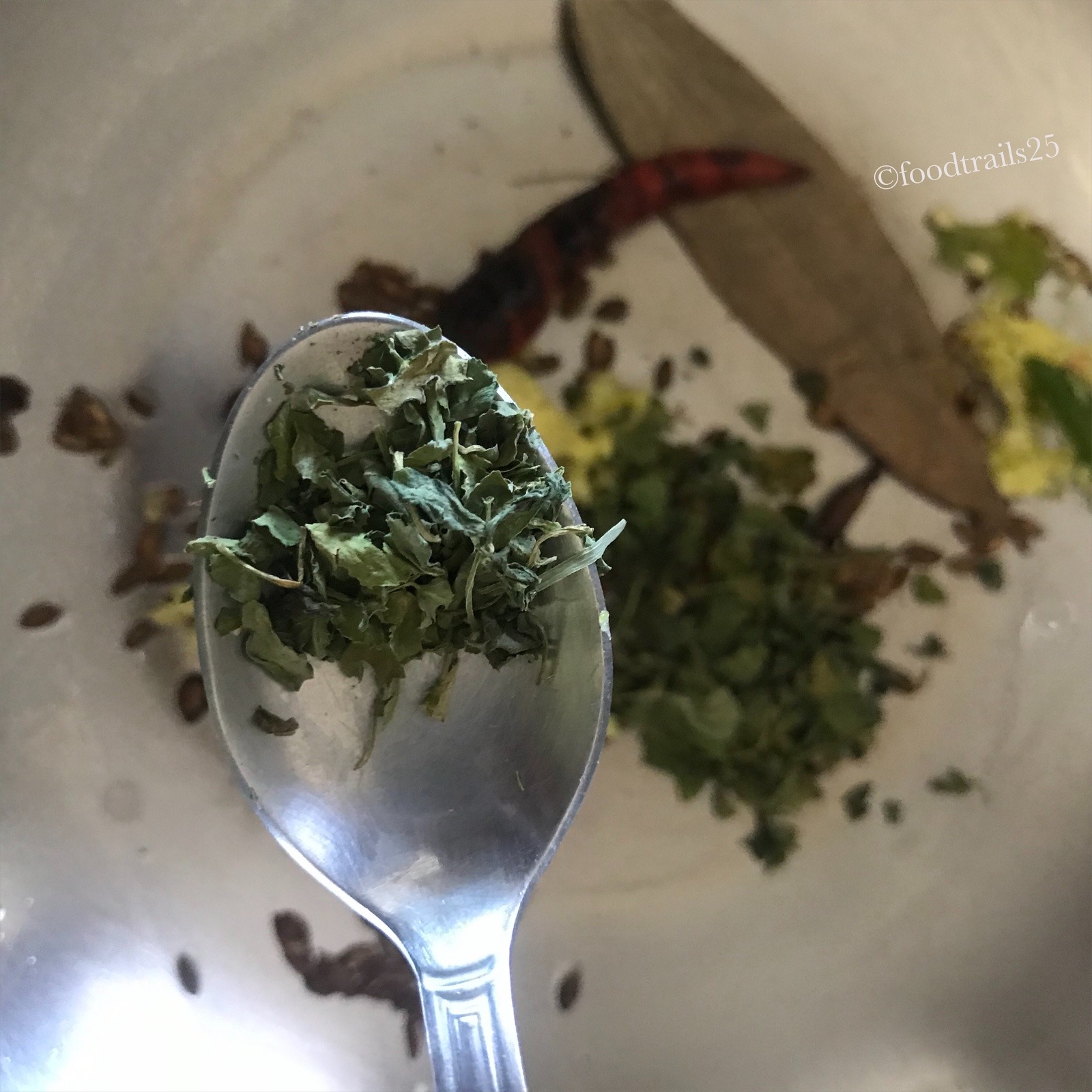 - Add ginger green chilli paste and saute for few seconds. Add dried fenugreek leaves/kasuri methi and saute for another few seconds.