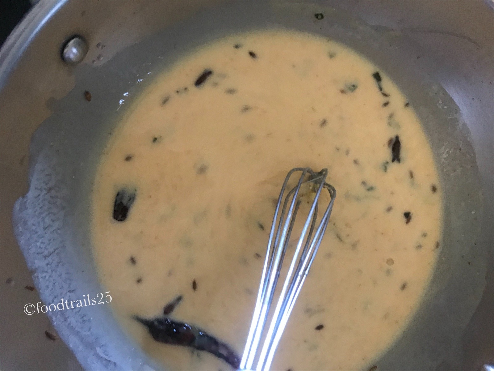 Chickpea flour/besan to bind the curry, spices like bay leaf, cinnamon, cloves and black pepper for flavour.