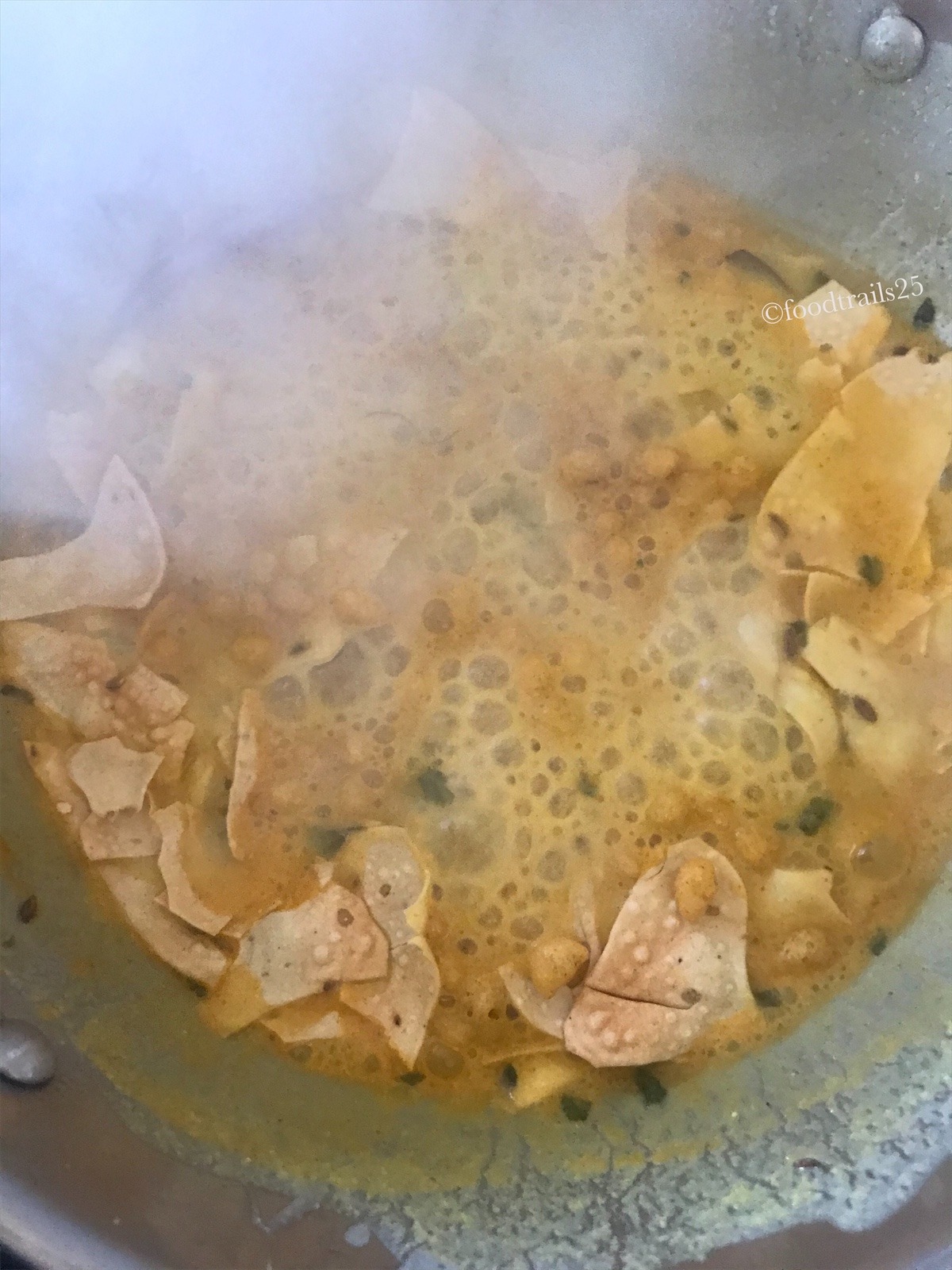 Cook the mixture for 2-3 minutes and then add crushed papads and boondi to it. Many recipes tell about soaking papads and boondi in hot water before adding to curry, but I add it directly. It get's cooked and soaked in curry. I like it that way.