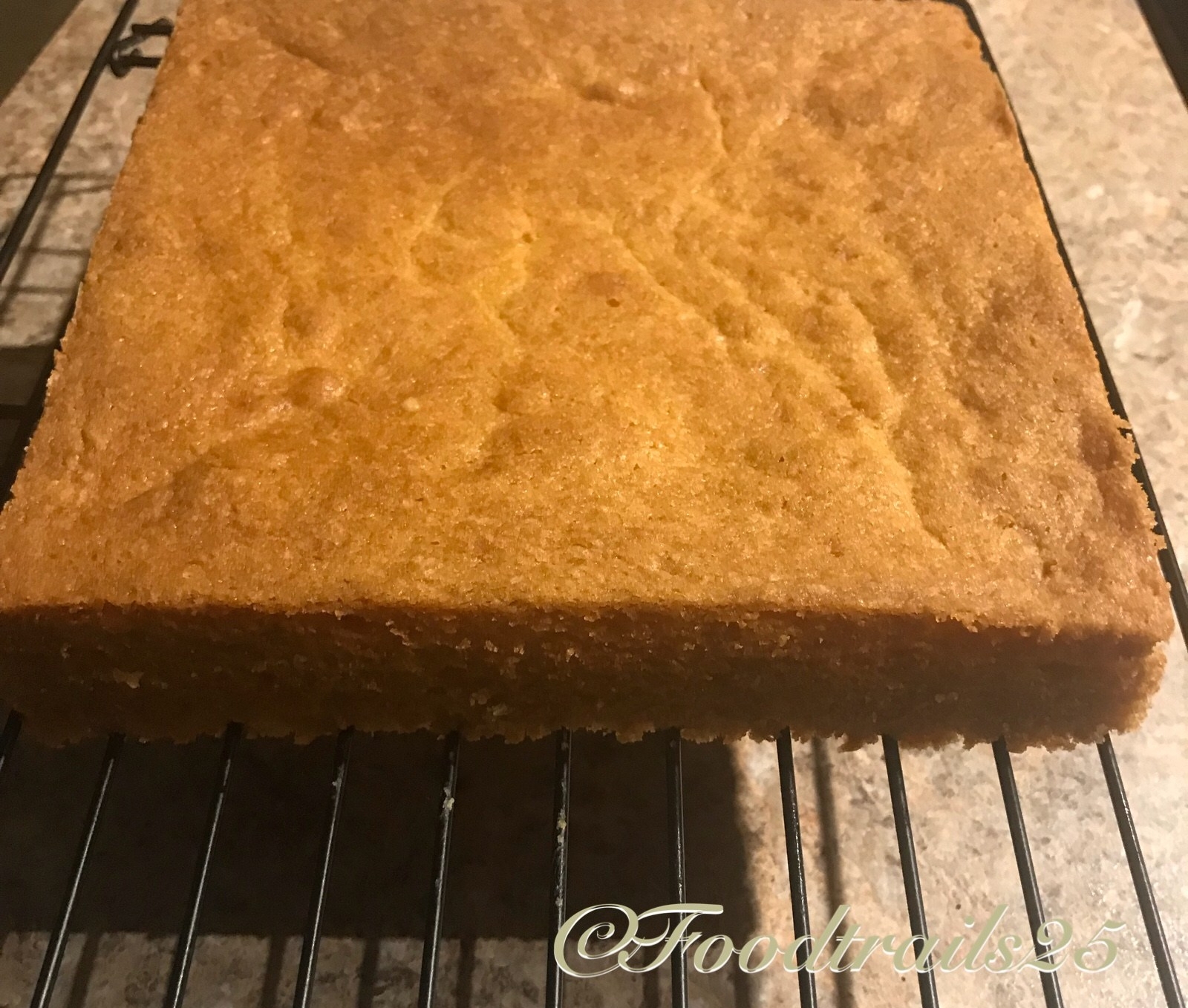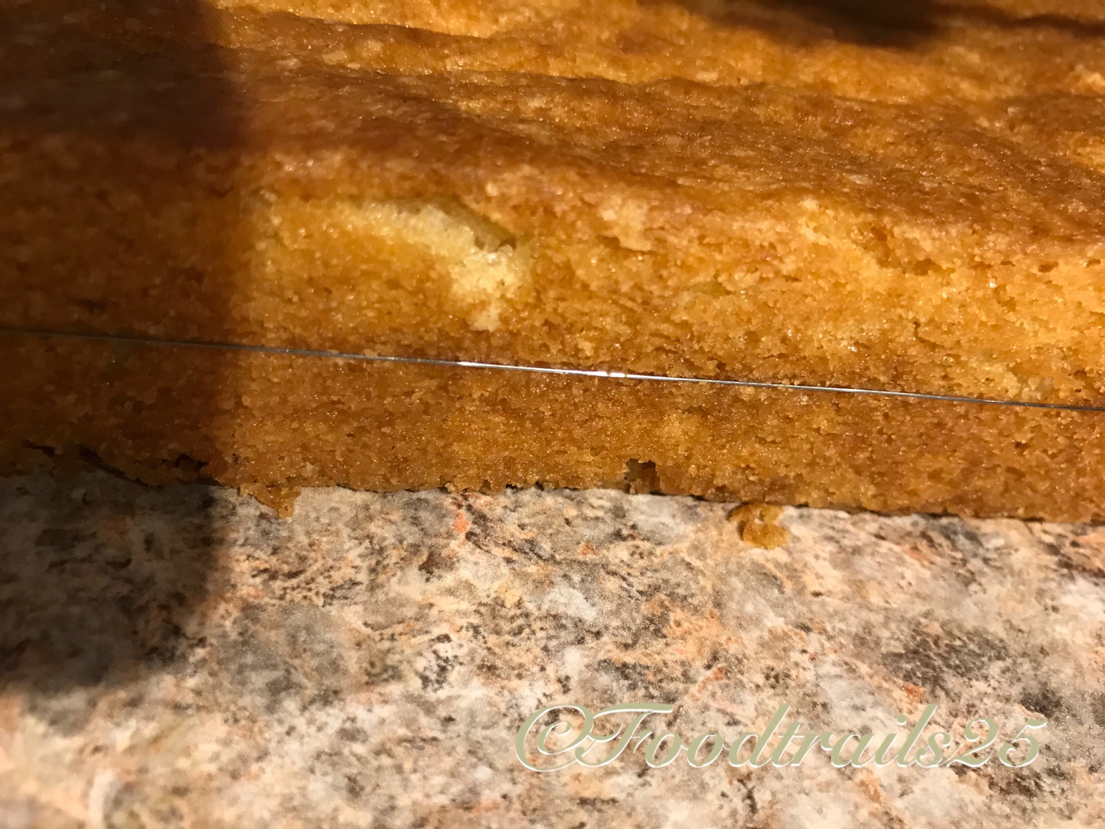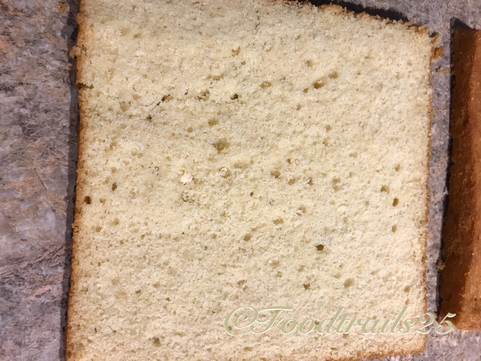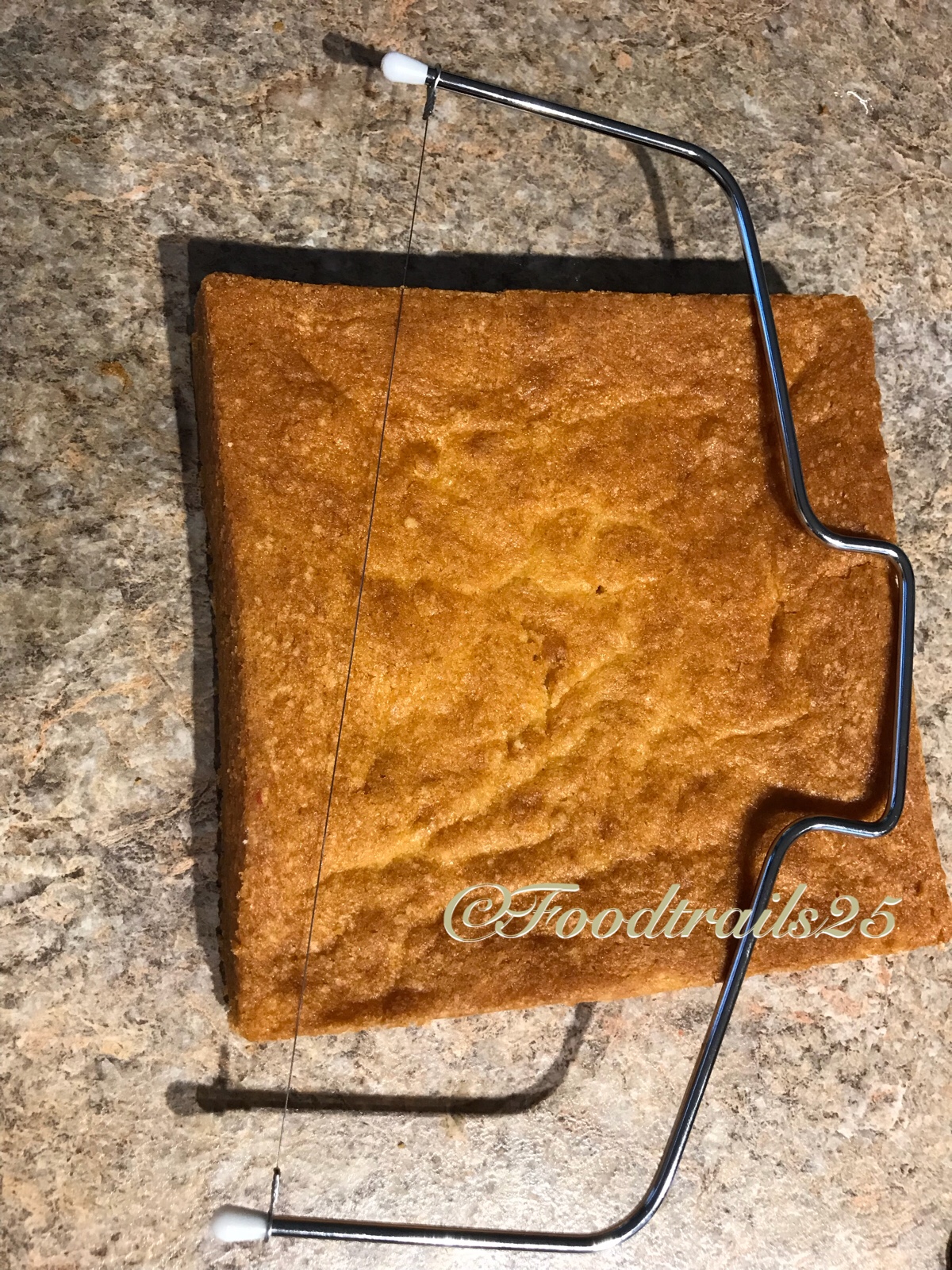 - Bake the eggless sponge as per the recipe. You can divide the batter in half bake two sponges using sheet pans or bake one sponge in a circular or square tin (8x8), and cut in half as I have done for the recipe.