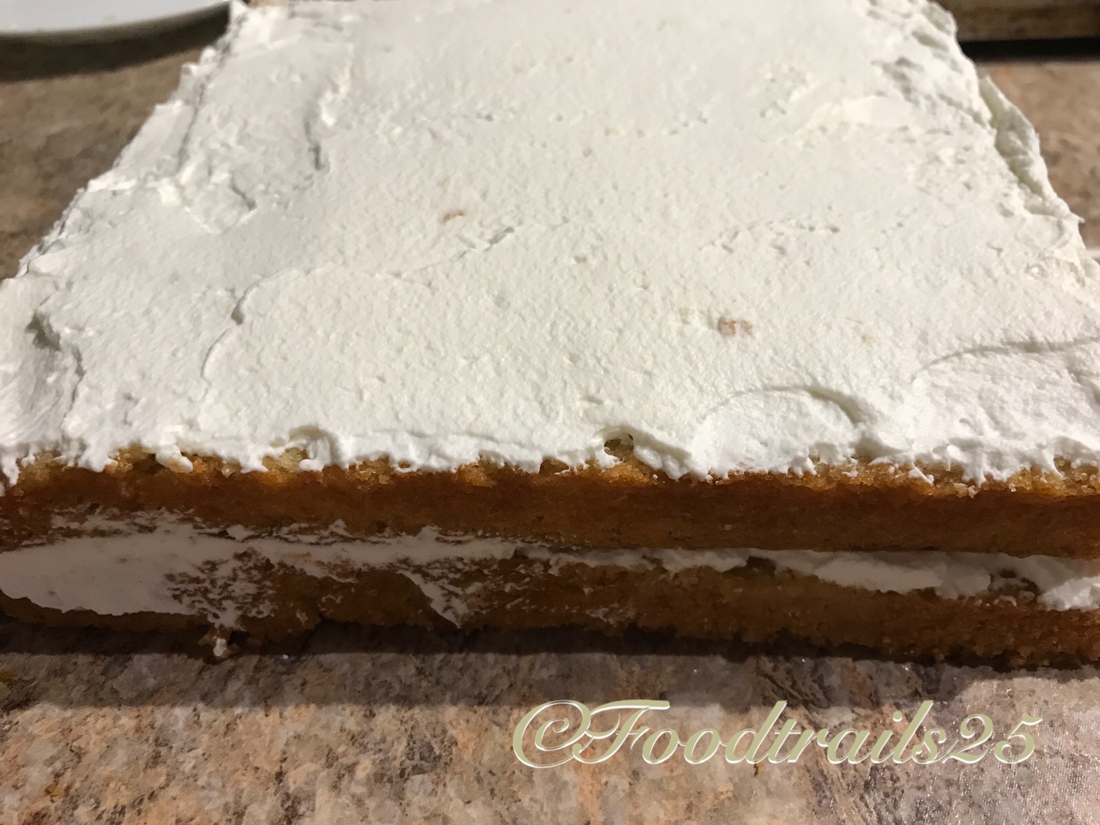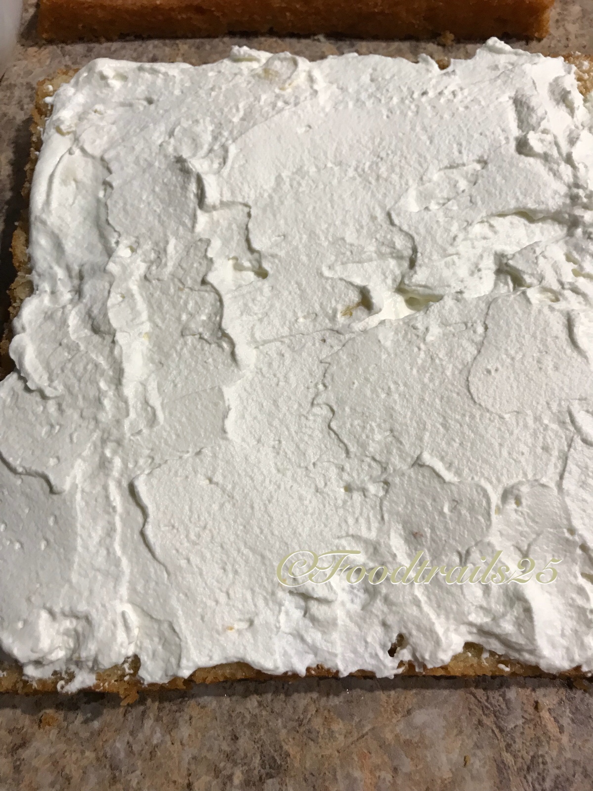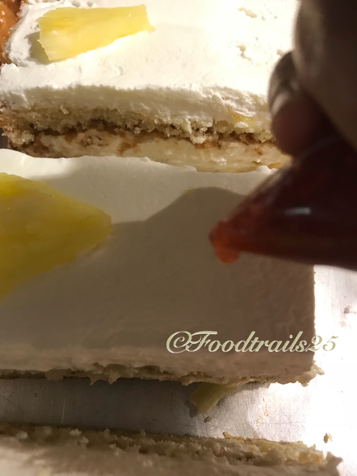 - Spread the cream generously on one half of the sponge.Layer some pineapple chunks on top of the cream.