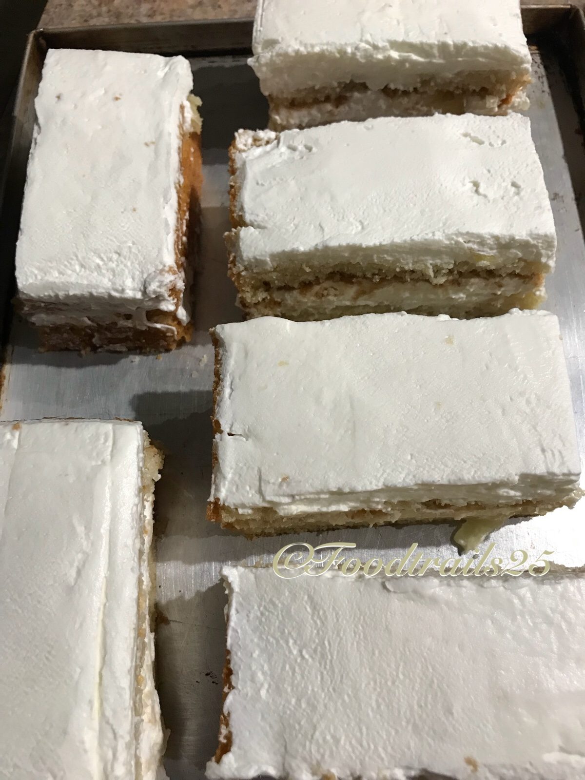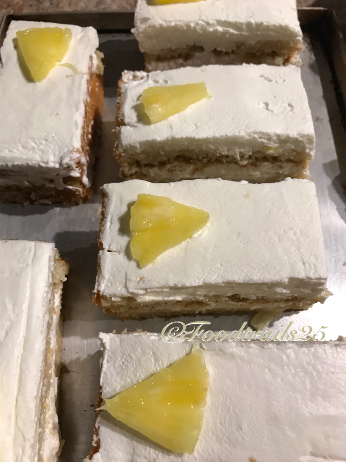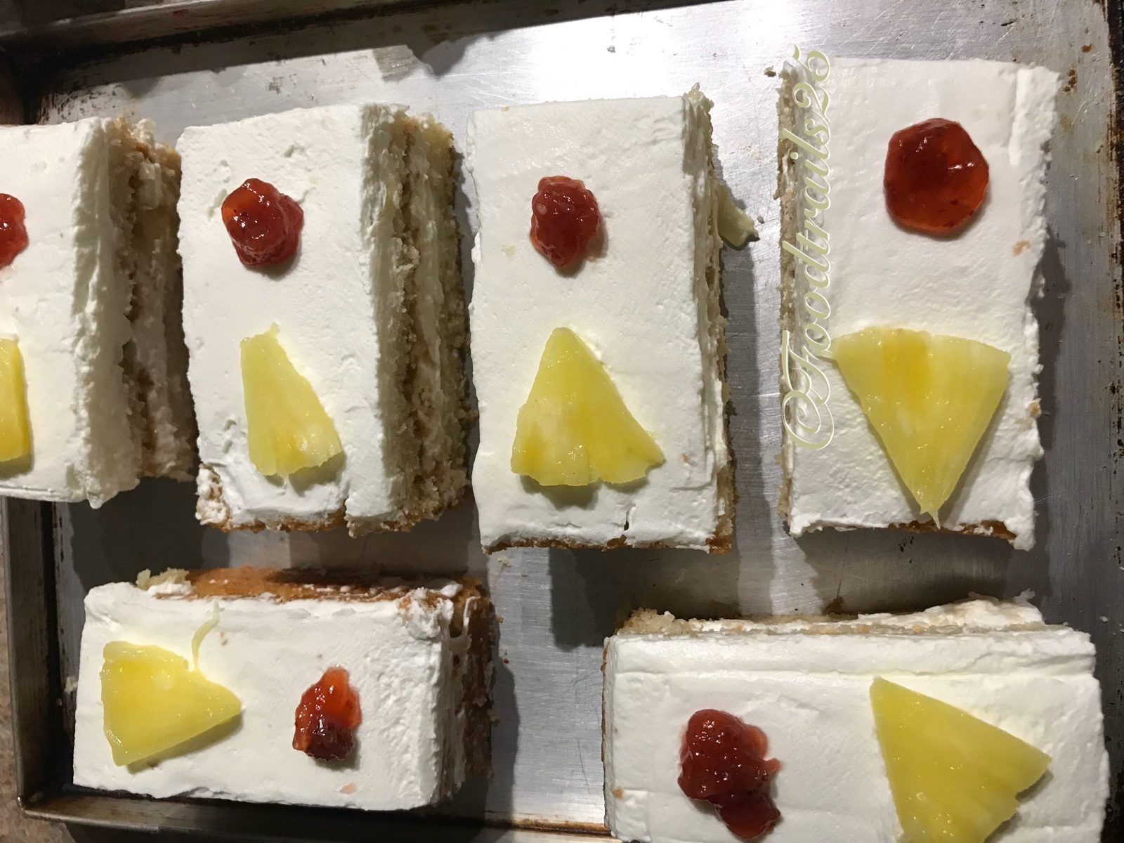 Making these pastries at home is very easy. Bake a sponge(egg/eggless), whip some fresh cream, add up pineapple chunks, frost the cake with cream and cut into desired pieces.