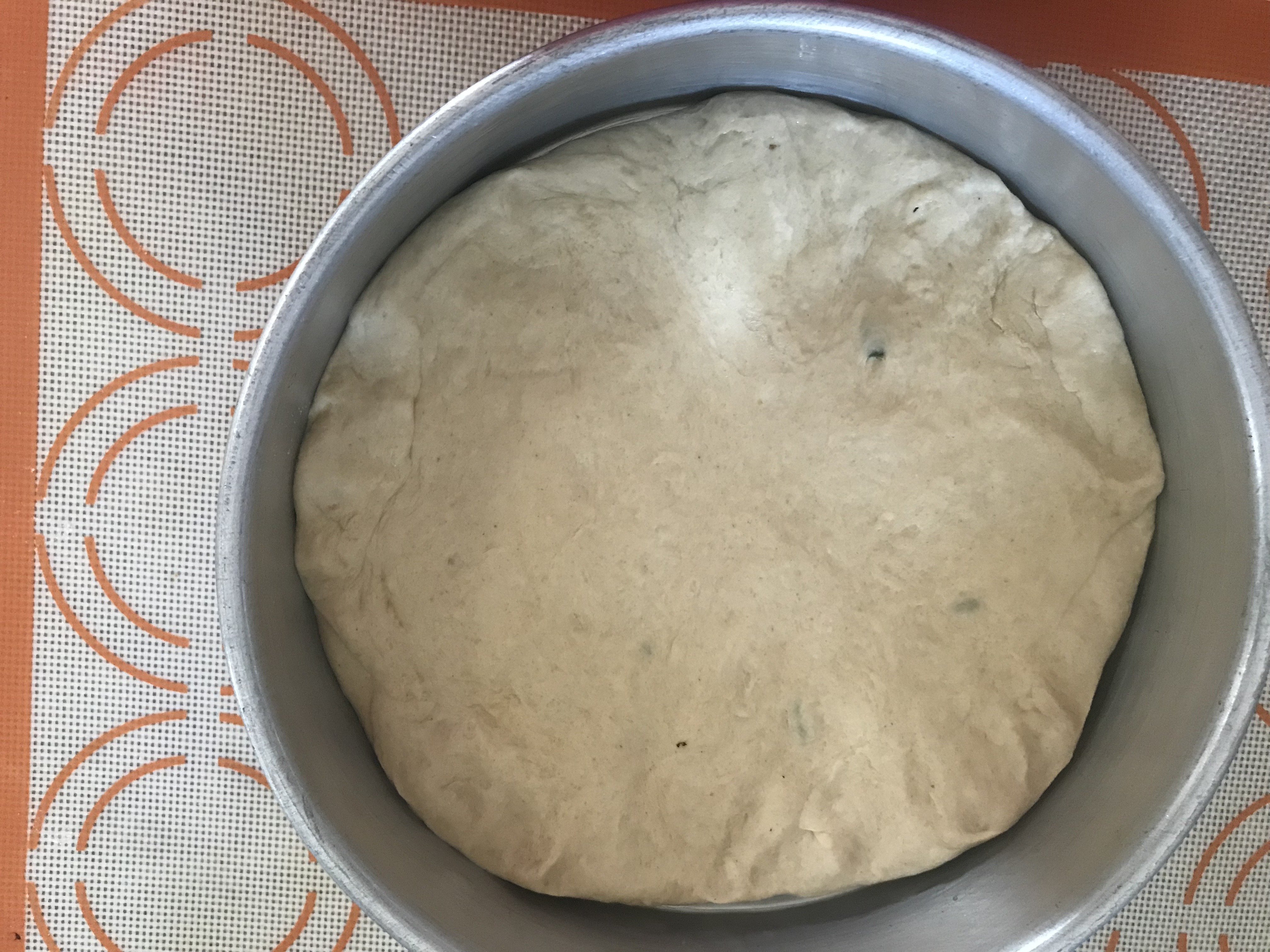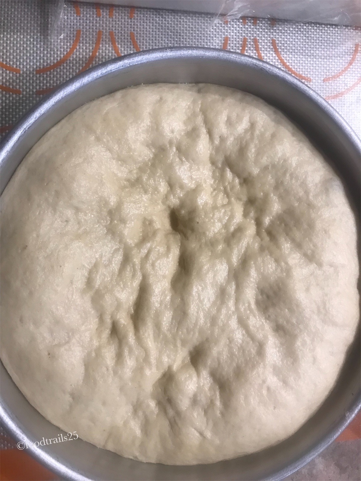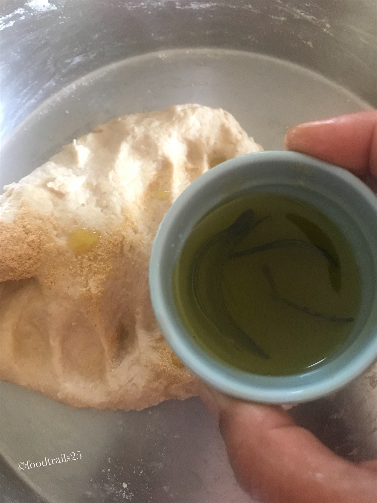 - Grease pan with oil,that you are using to bake focaccia, transfer the dough to it and lightly spread the dough onto the pan. Or, roughly shape it with hand for the rustic look. Cover again the pan or bread with cling film and let it sit for another 20-30 minutes. It will again rise and double up.