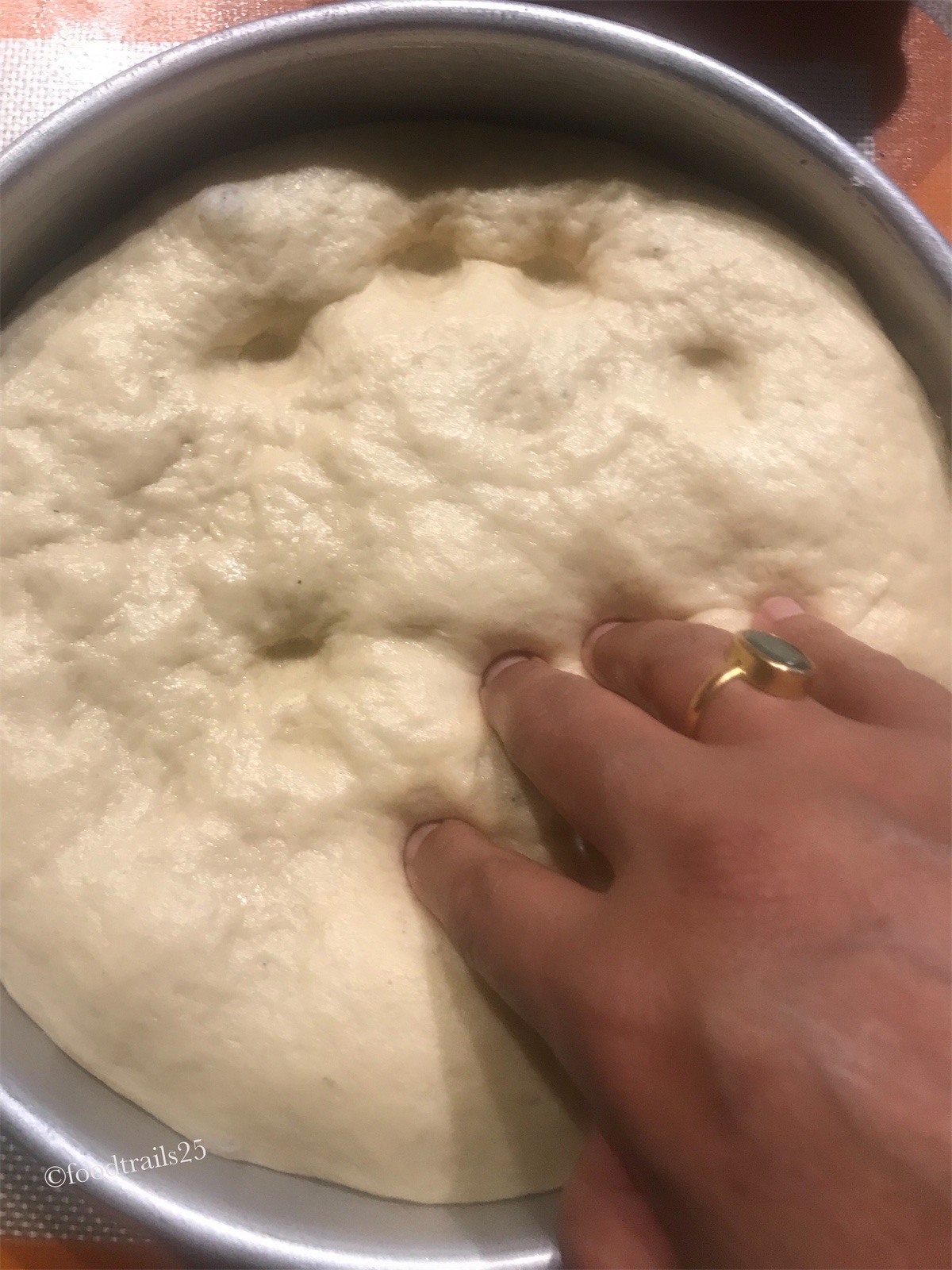 - Now lightly knock the dough down with knuckles or make indentations with fingers. Do not press too tightly on the dough as it with inflate it. Make dimples, add toppings.