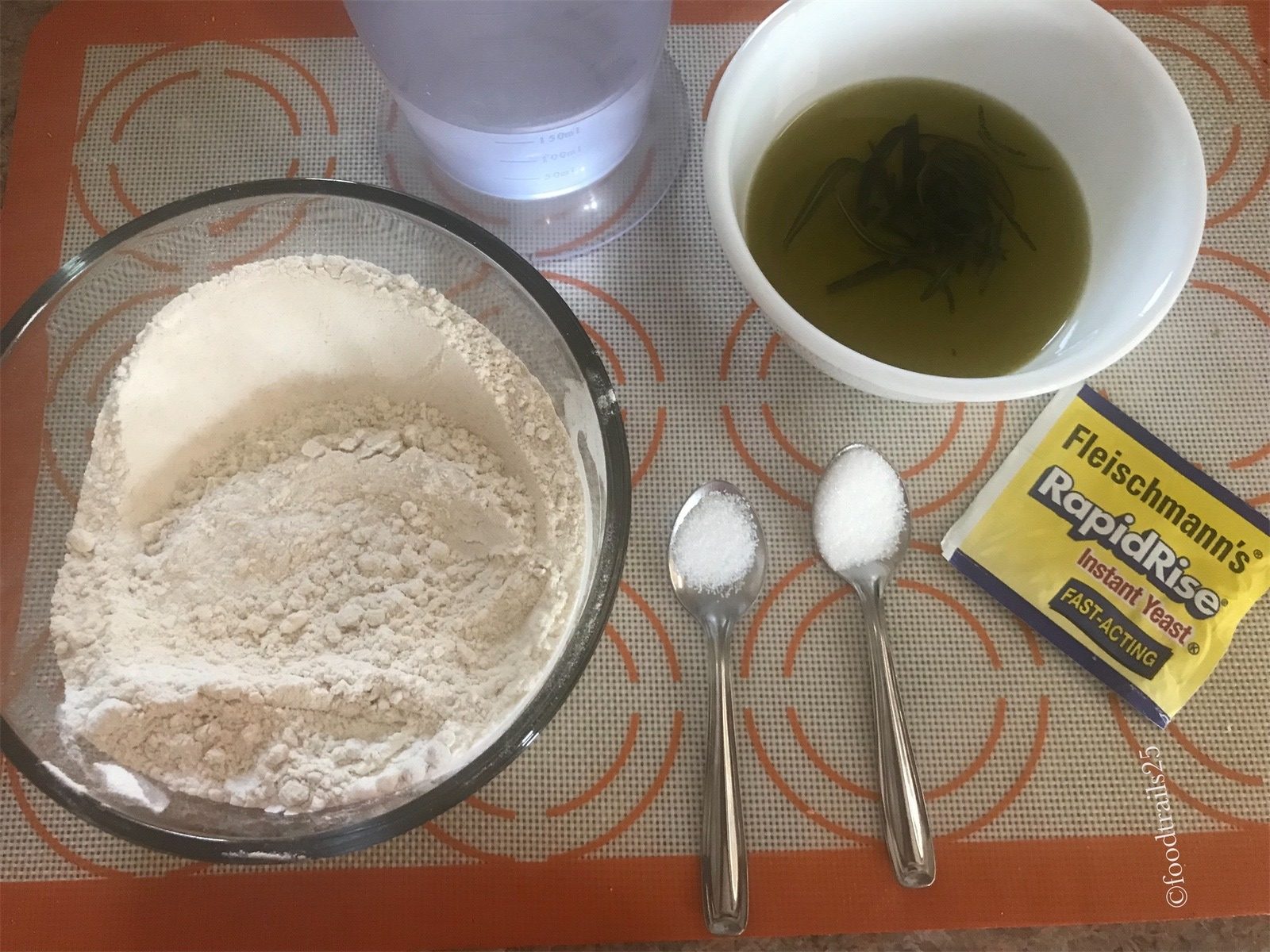 Fresh Rosemary Sprigs, cherries and yeast along with salt and sugar. Extra Virgin Olive Oil (EVVO) is used for the fat part and gives the bread it's characteristic flavor. Use a good quality EVOO for making Focaccia.