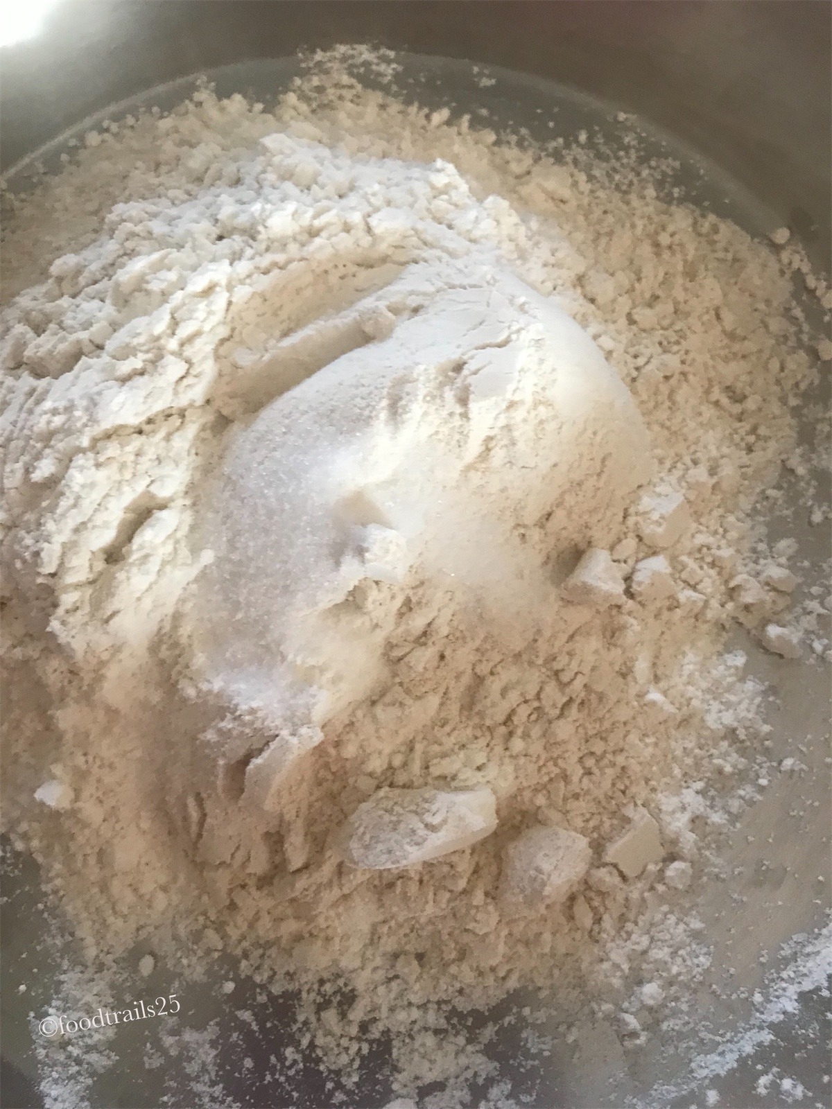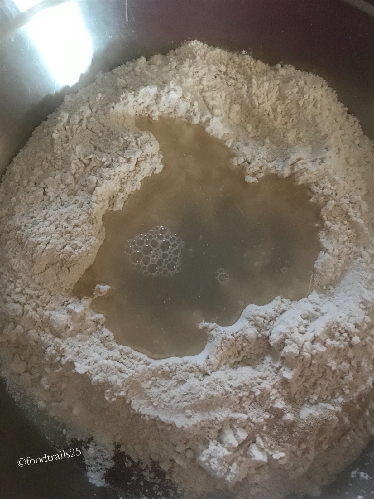 - In a mixing bowl, take flour, add yeast, salt and sugar to it. Make a well in center and add water slowly and gradually.