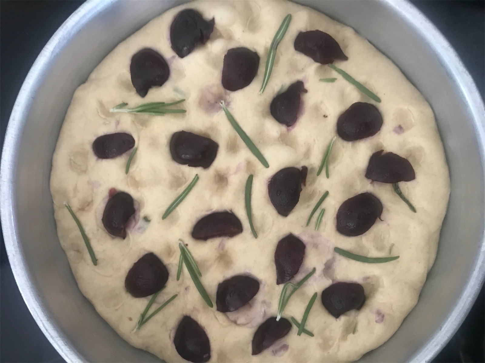 Rosemary Focaccia with fresh Cherries,Classic Focaccia topped with fresh Rosemary Cherries, Caramelized Onions with infused Rosemary oil.