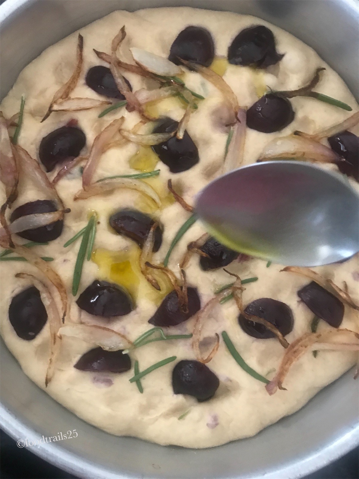 Line the pan with oil,that you are using to bake focaccia, transfer the dough to it and lightly spread the dough onto the pan. Or, roughly shape it with hand for the rustic look. Cover again the pan or bread with cling film and let it sit for another 20-30 minutes. It will again rise and double up.