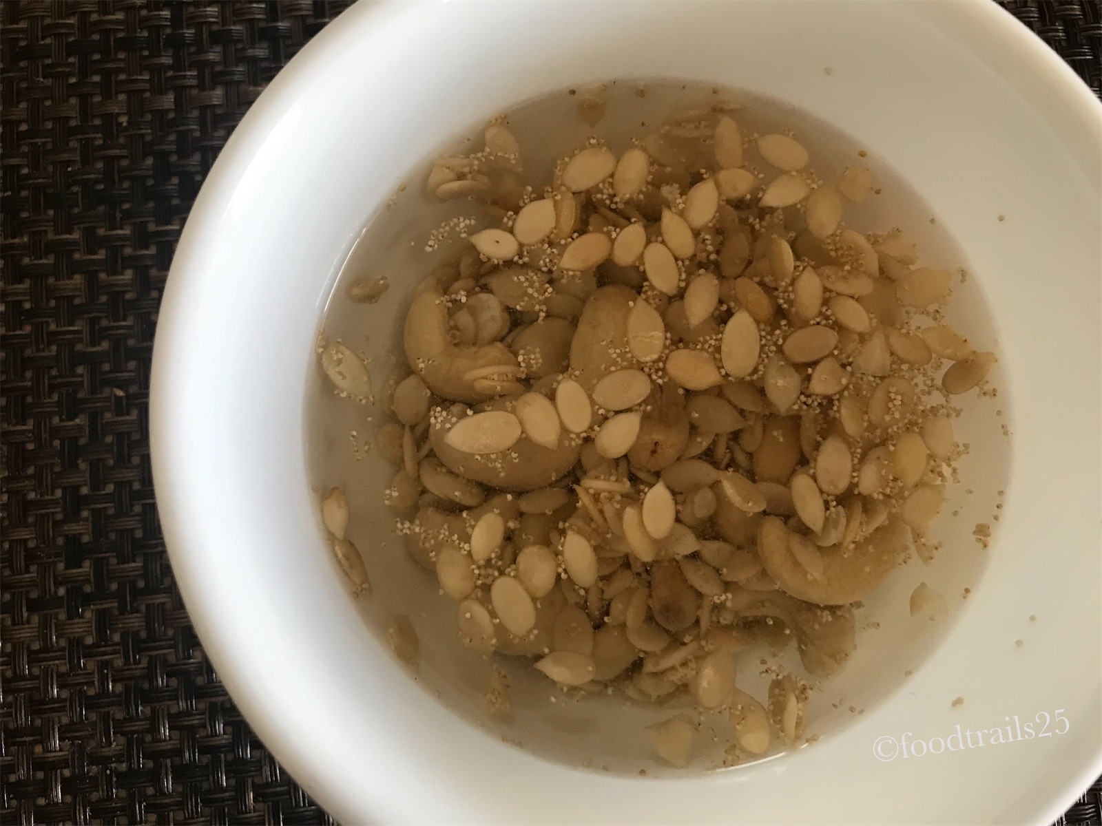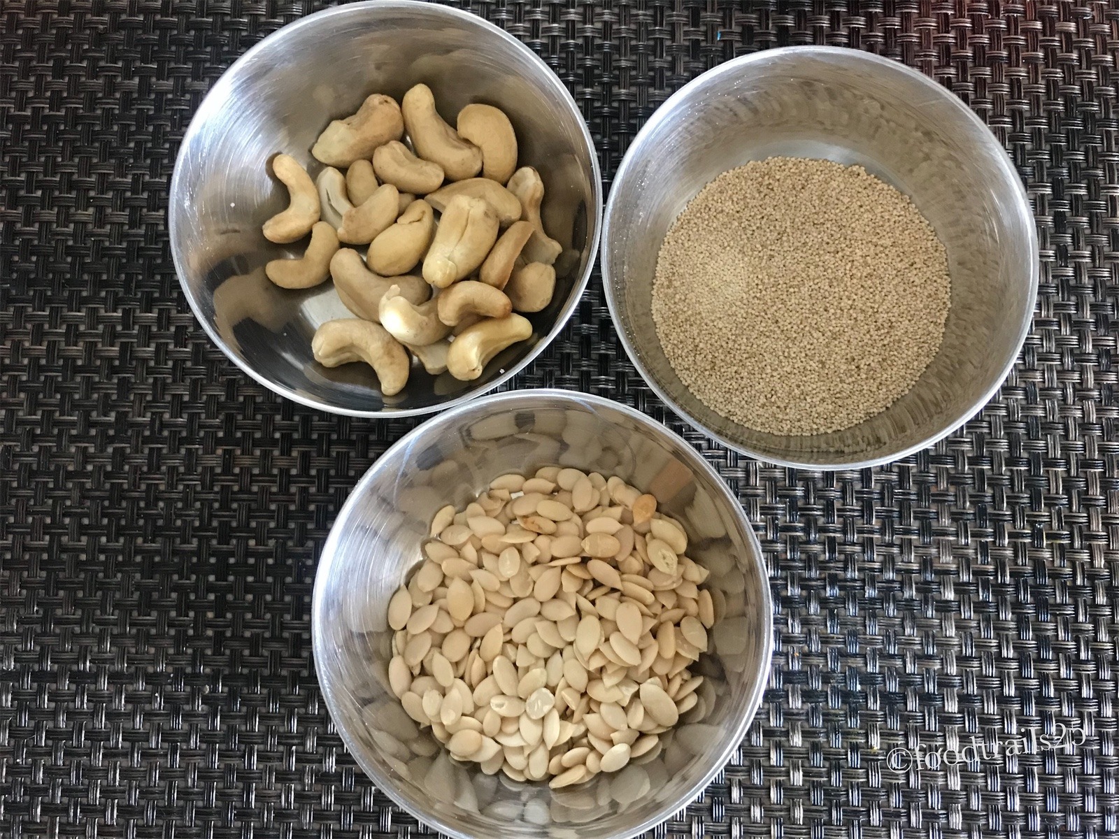 Soak cashew nuts, poppy seeds and melon seeds in warm water for 10 minutes.