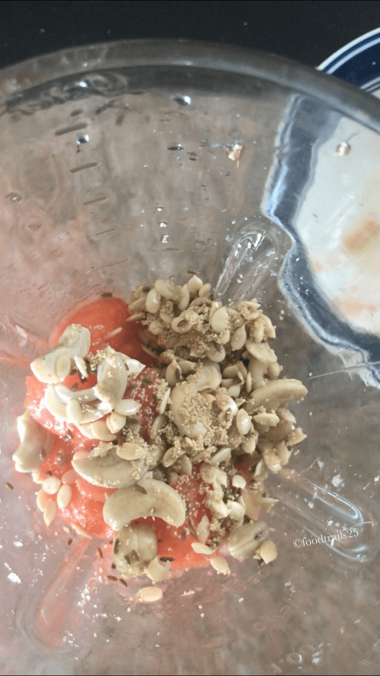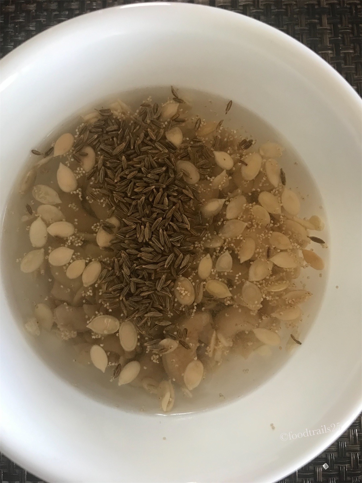 - Soak whole red chilies, cashew nuts, poppy seeds cumin seeds and melon seeds in warm water for 10 minutes.
