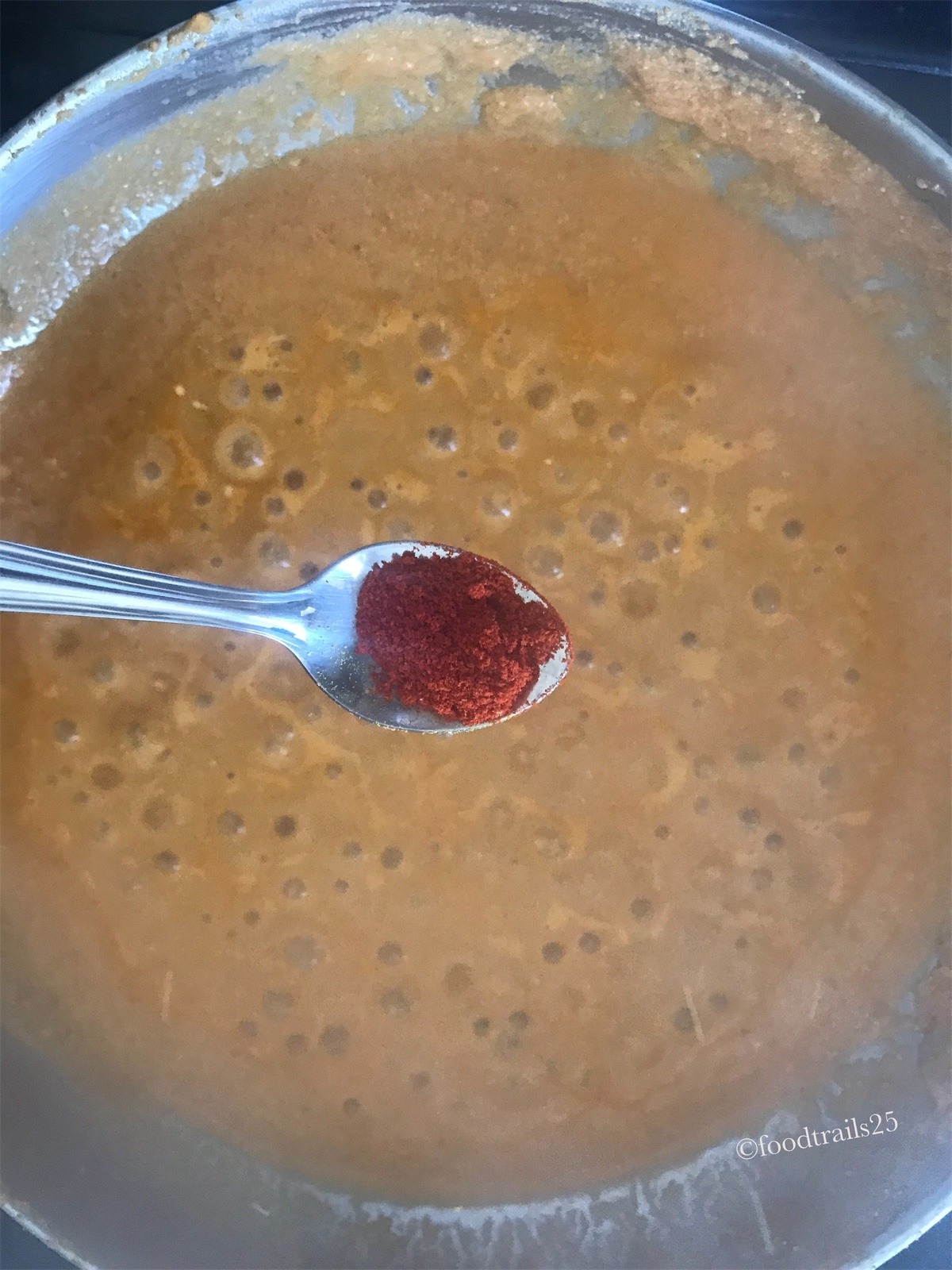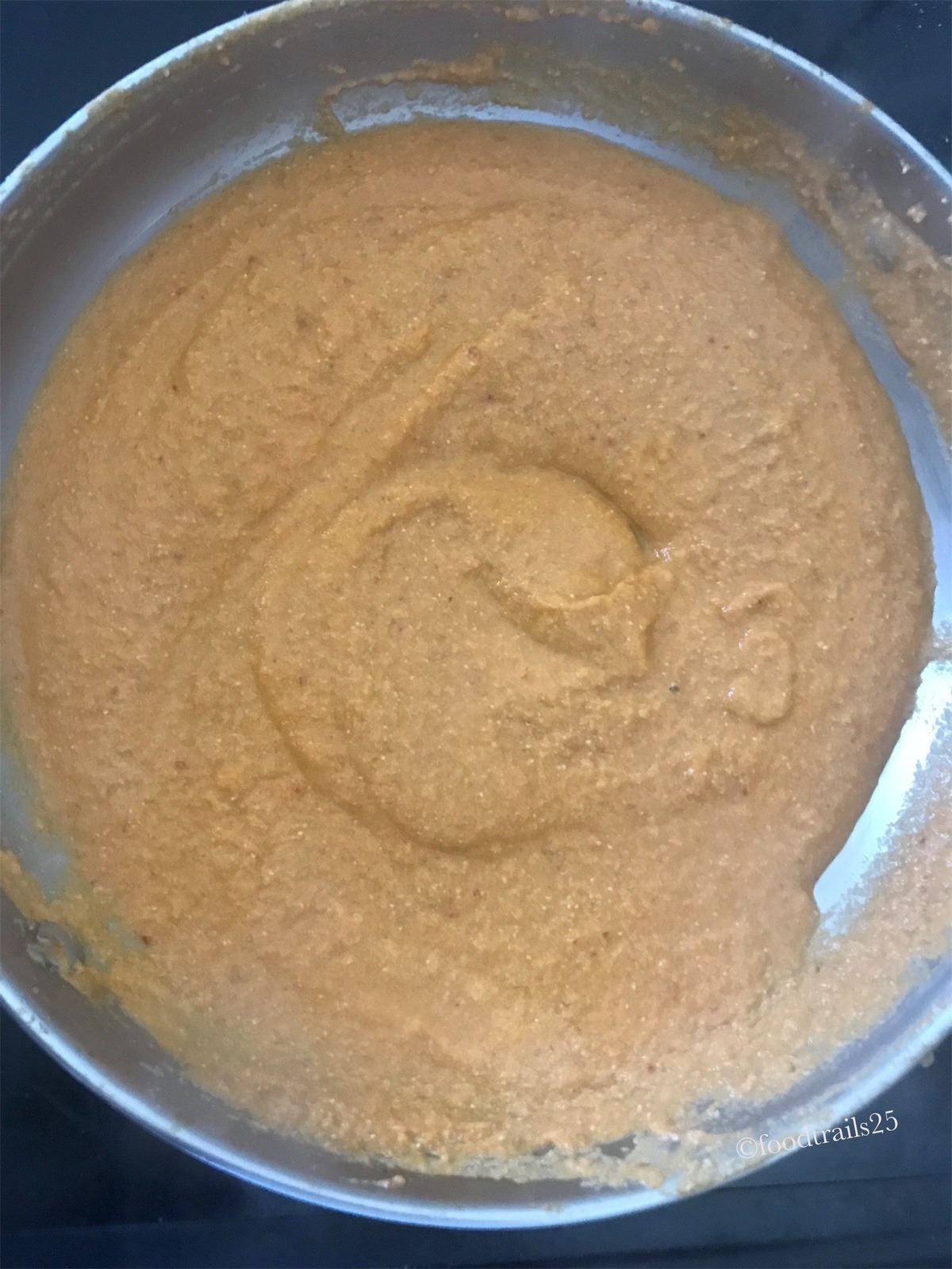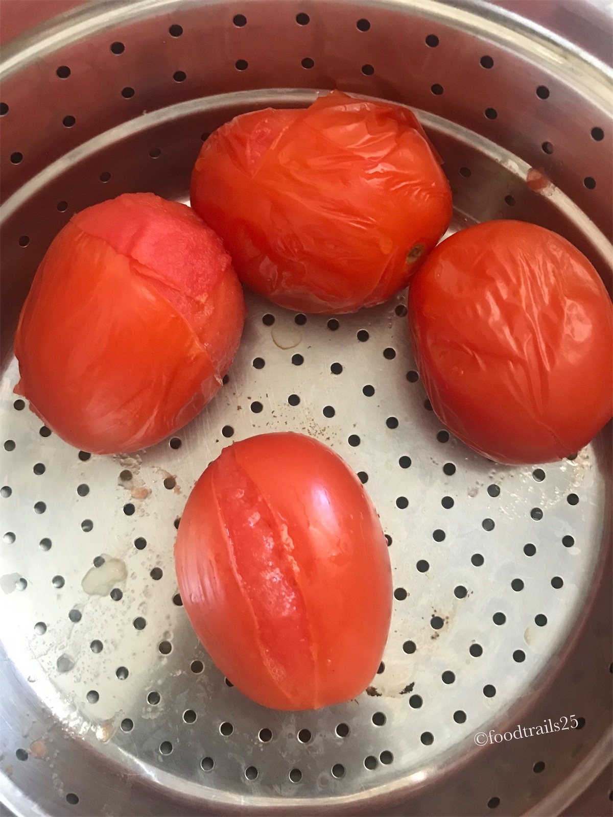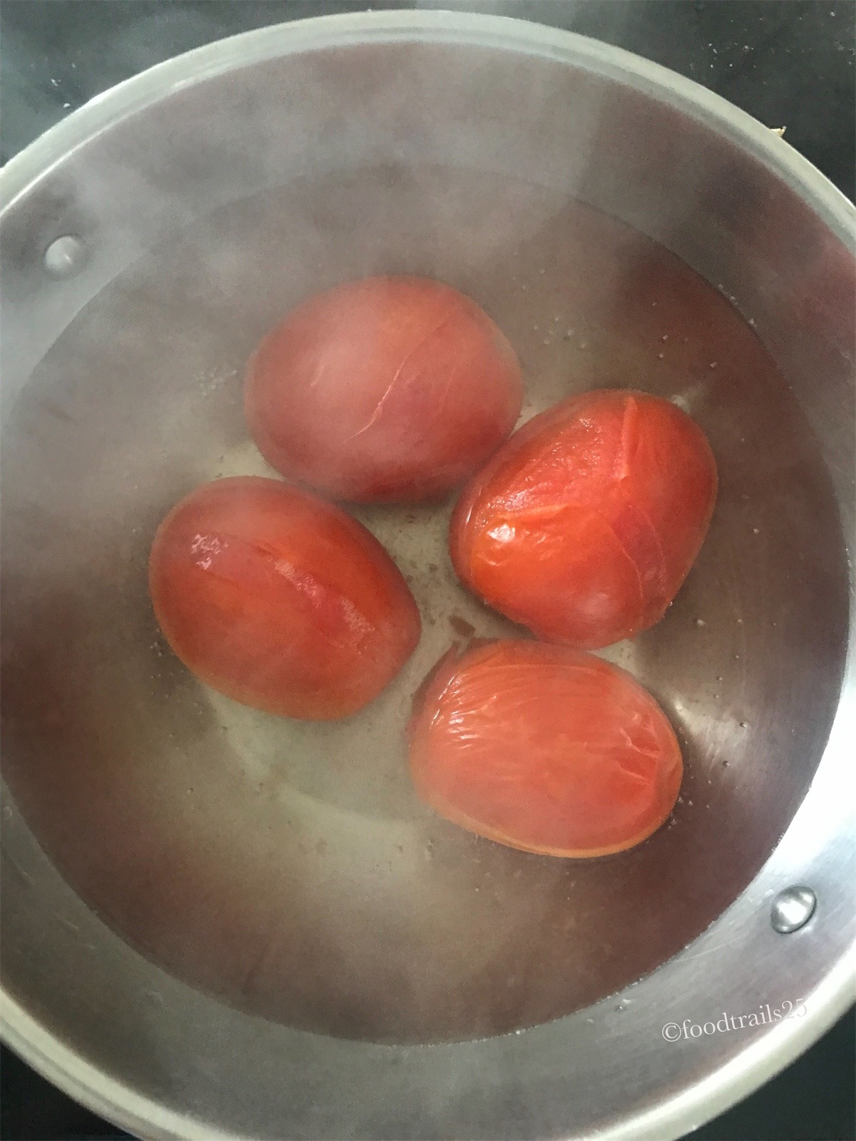 - Boil water in a pan. Add tomatoes. Keep tomatoes in it for few minutes. Take out once the skin is shriveled, peel of the skin . Grind with soaked red chili, cashew nuts, poppy seeds, cumin seeds and melon seeds, make smooth puree.