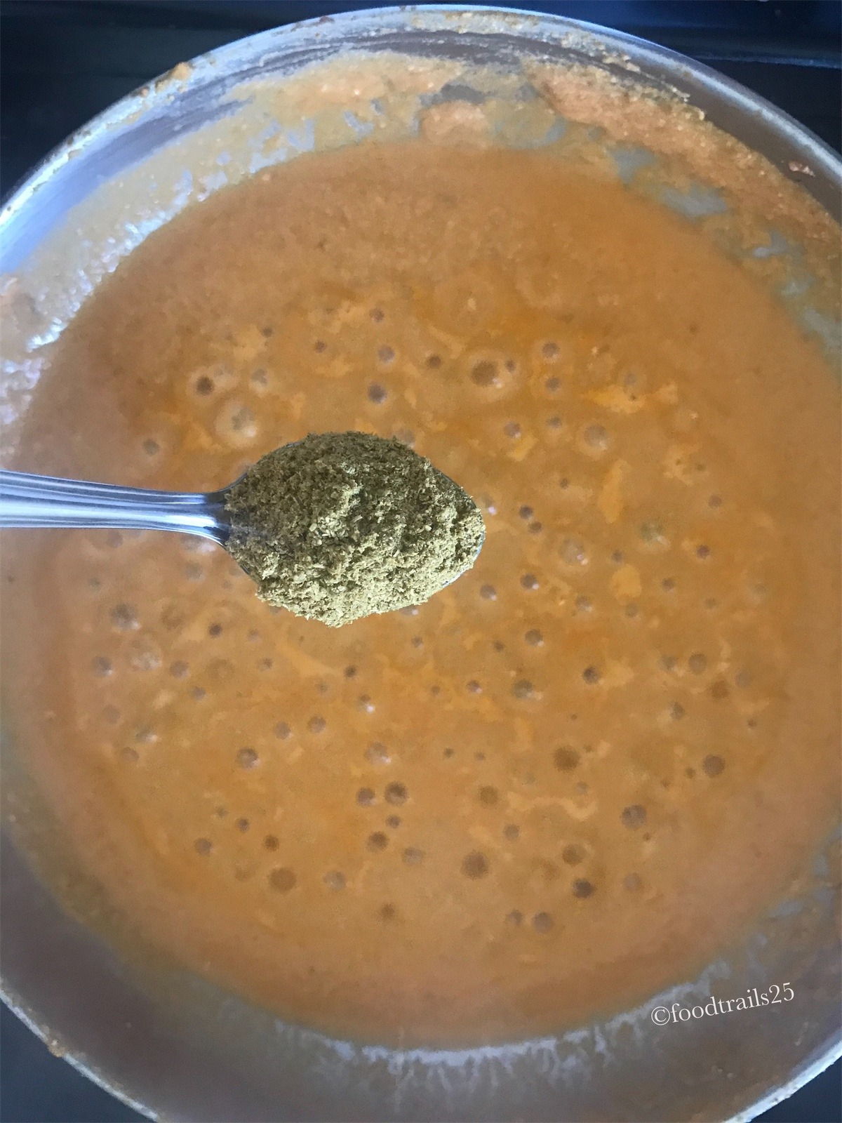 - Cook on medium flame for few minutes. Add roasted and crushed Kasuri Methi to gravy.
