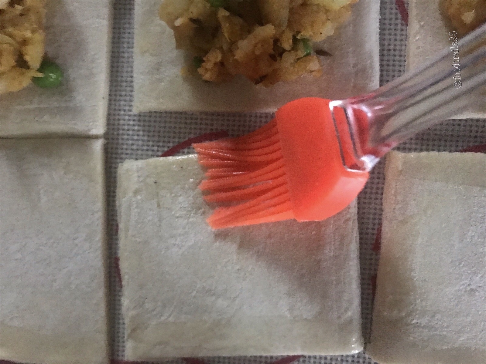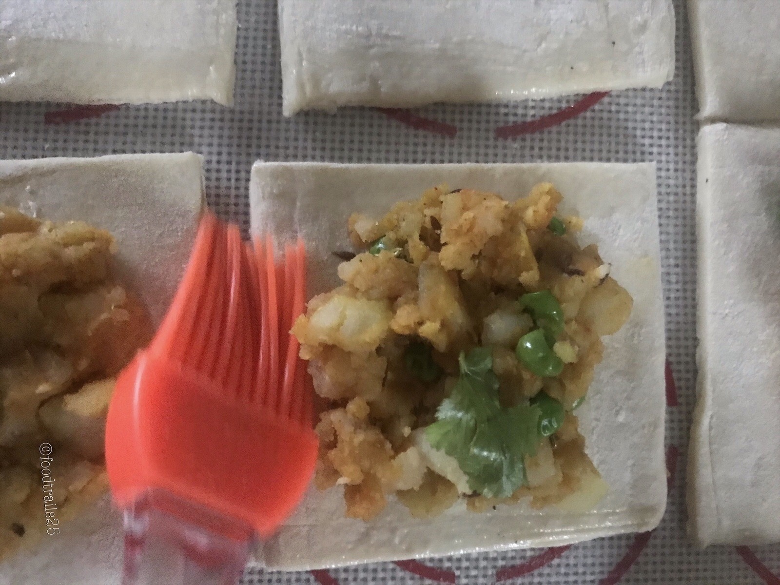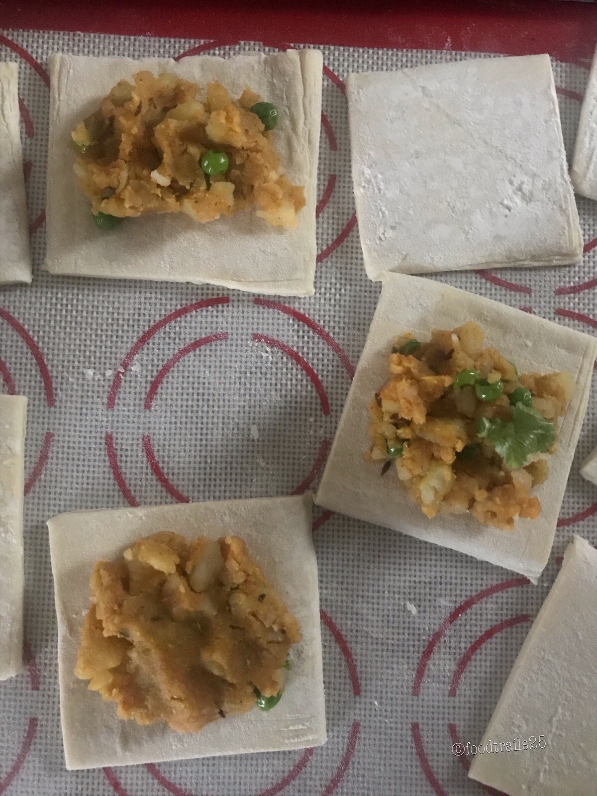 To make these savory pastries, I have used store-bought pastry sheets(frozen). Soon will be coming up with Homemade Cheat Pastry sheets recipe.