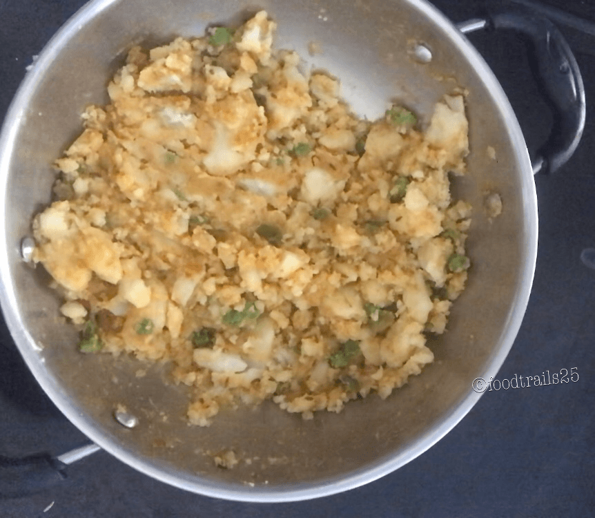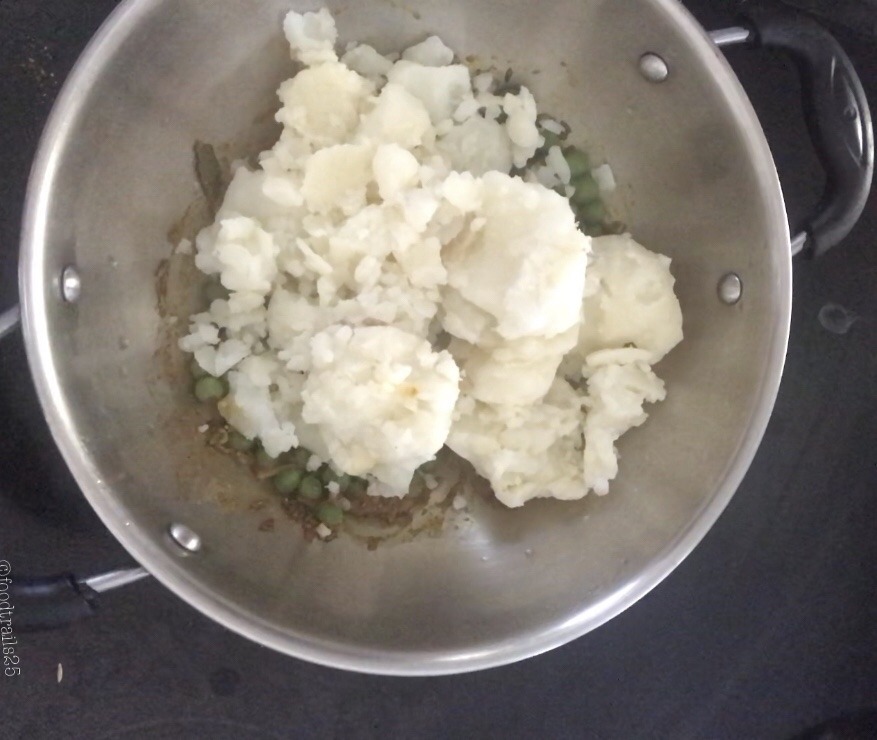 - Add the powdered spices, salt , mix and then add mashed potatoes.