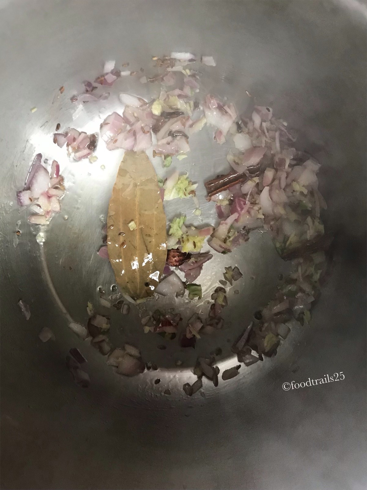 Whole Spices like Bay leaf, Cinnamon, Cloves , black pepper and black cardamom with cumin seeds to enhance the flavor.