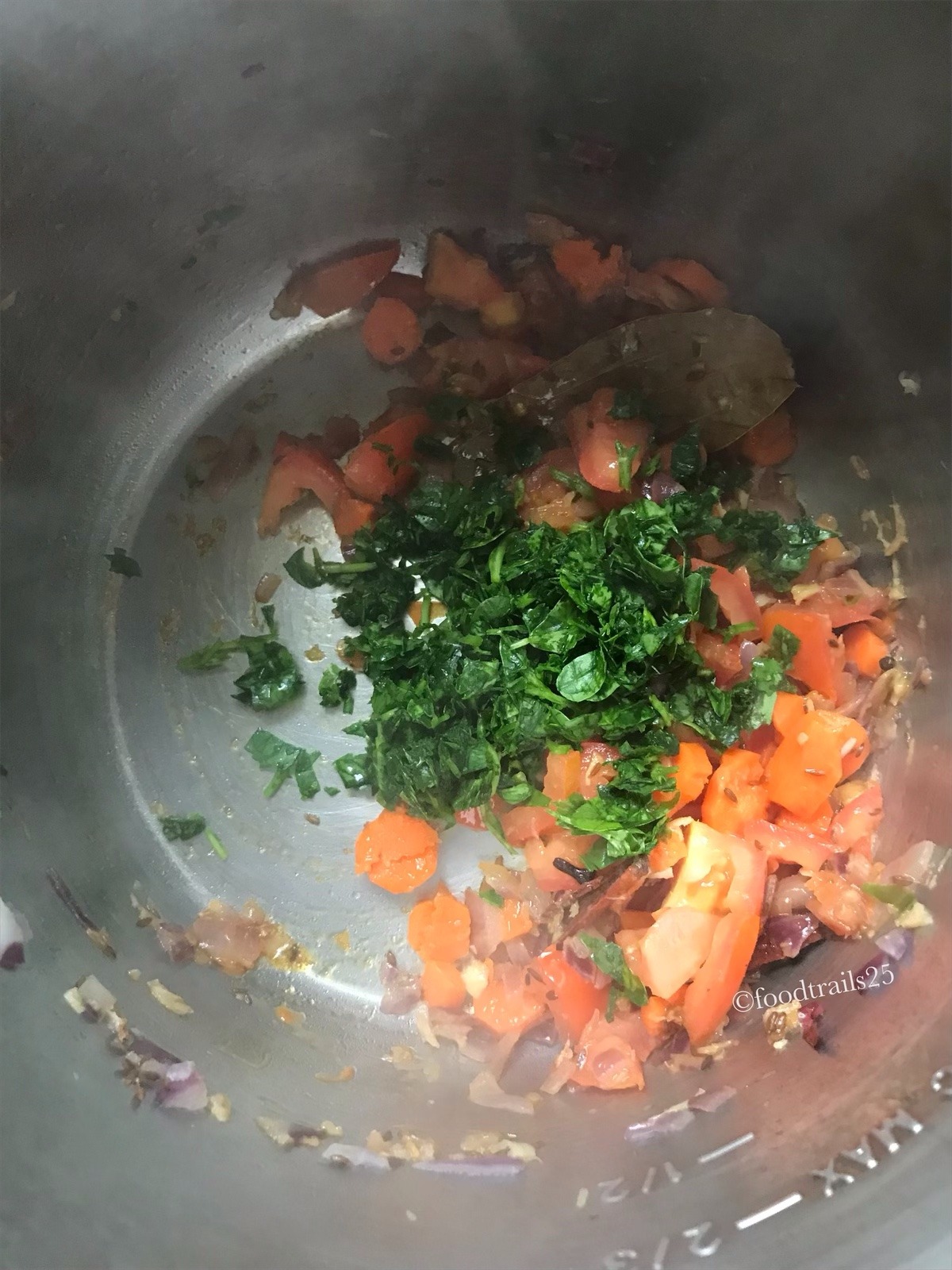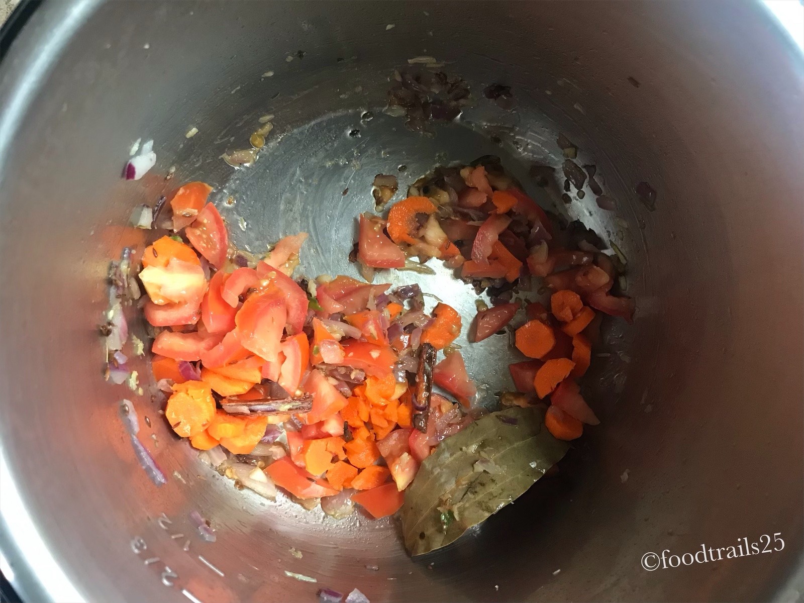 - Once Onions turn pink, add tomatoes and carrots/vegetables and saute for another 2-3 minutes.