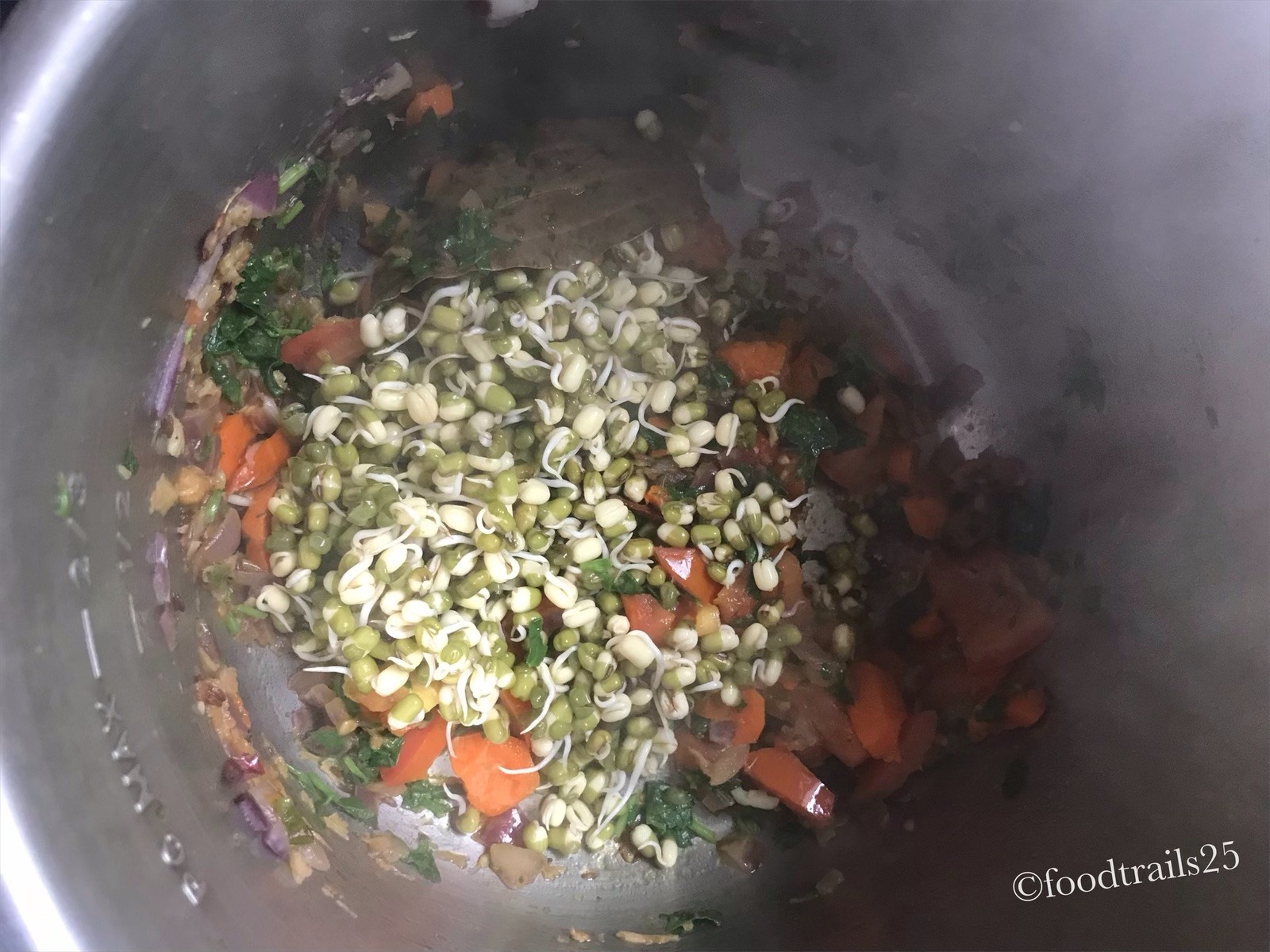 Sprouted Whole Moong Beans, homemade or store bought. Choose vegetables like carrots, green beans, corn of your choice, I added carrots only.