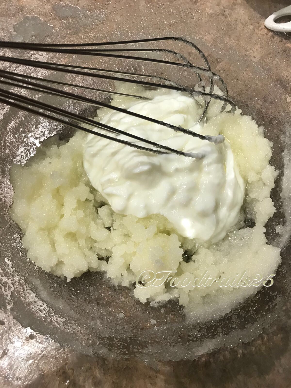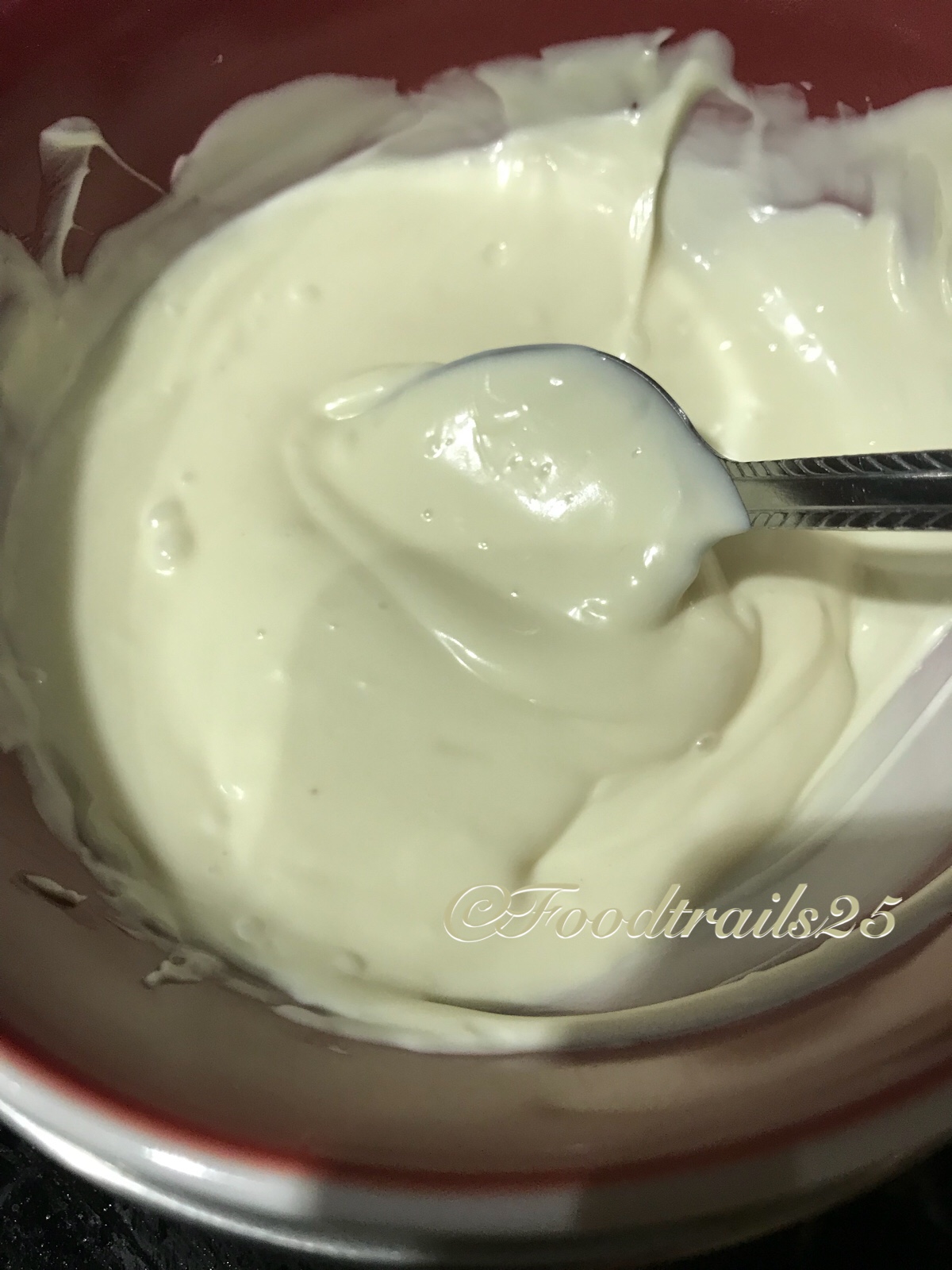 - Once light and fluffy, add curd and beat until creamy.