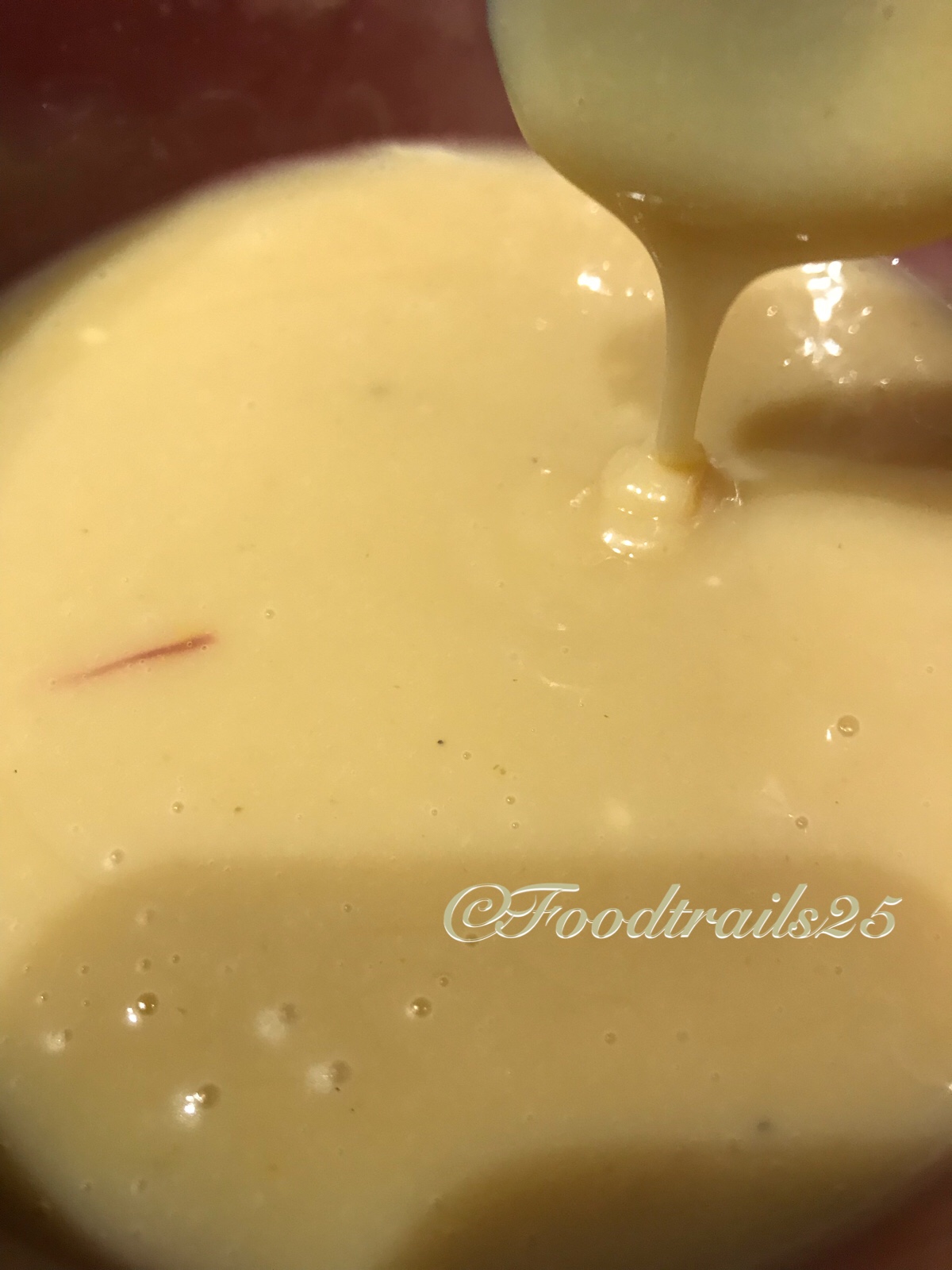 - Add flour in 3 parts mix alternating with buttermilk. Finally, add some saffron infused milk.