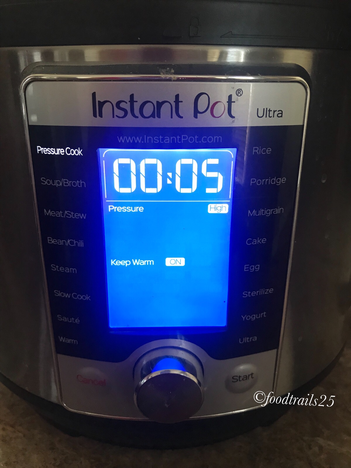 - Seal the lid of the Instant Pot, set the PRESSURE COOK Mode to 5 minutes on HIGH.