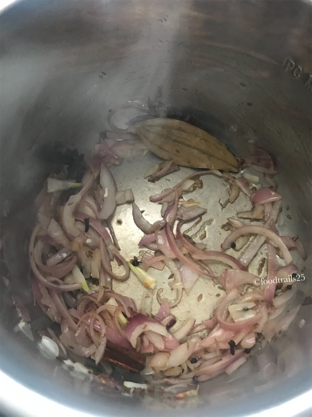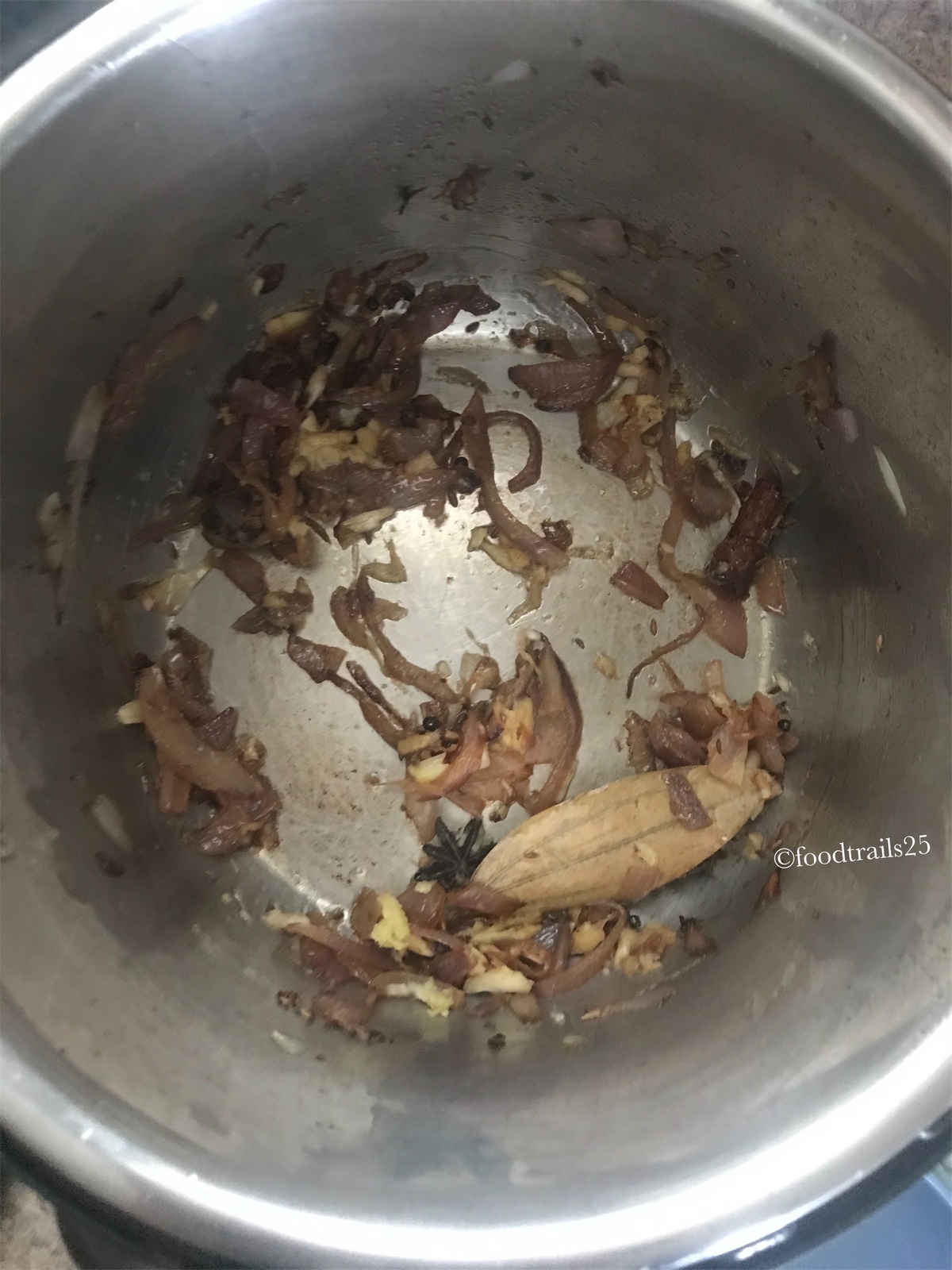 When the display shows 'HOT' add ghee/oil in the inner pot, add the whole spices and cumin seeds. Then add the finely sliced onions, and sauté onion still these start turning brown.