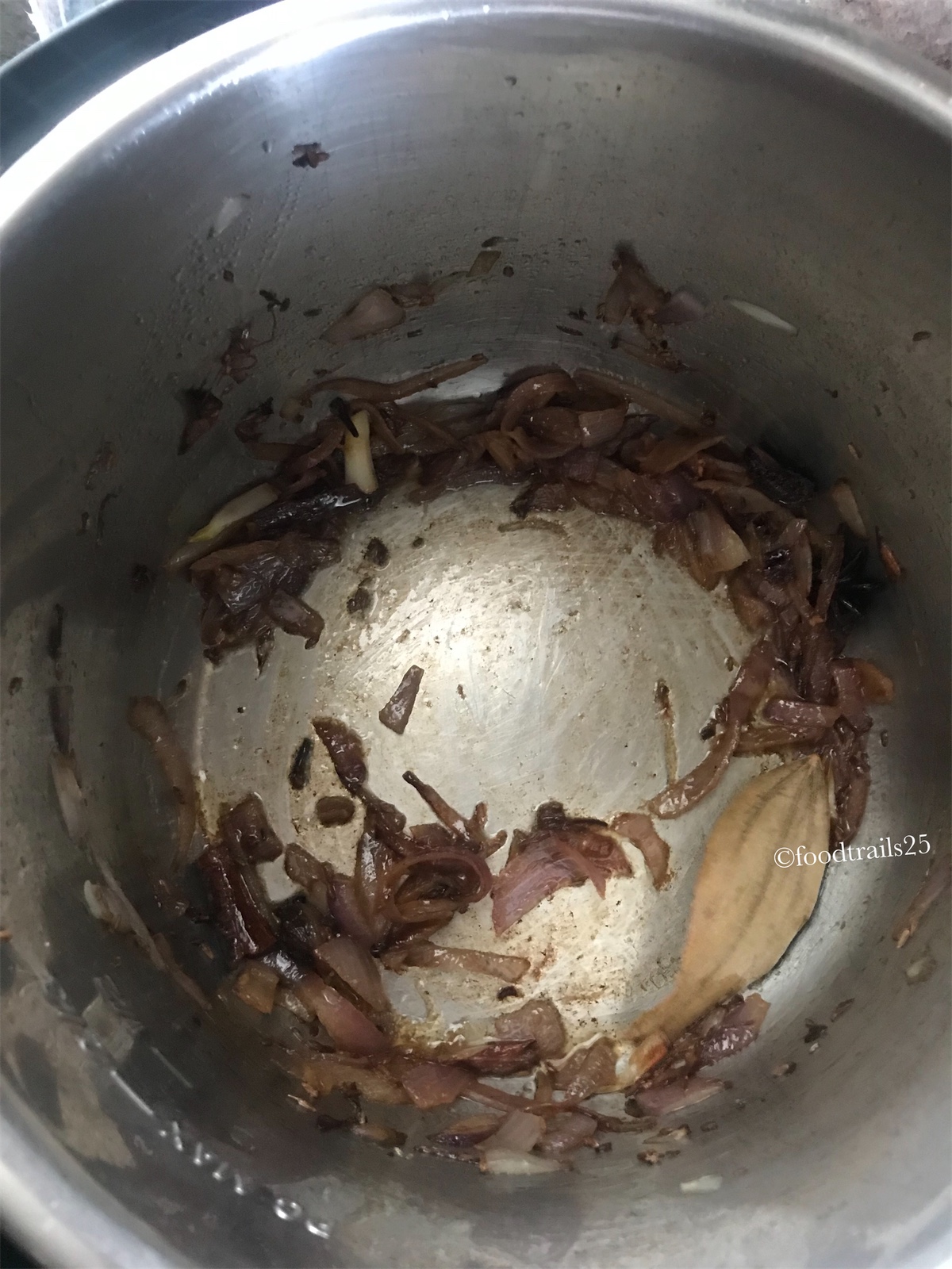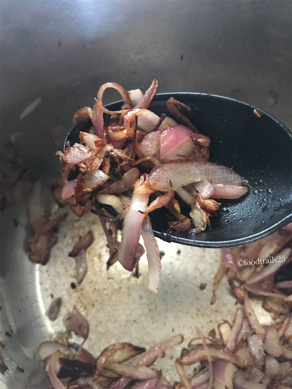 - Cancel the 'SAUTE' mode.Take out half of onions and keep aside for later use. Add some water(about 2-3 tbsp) to clean the bottom of inner pot as onions stick to it while frying.