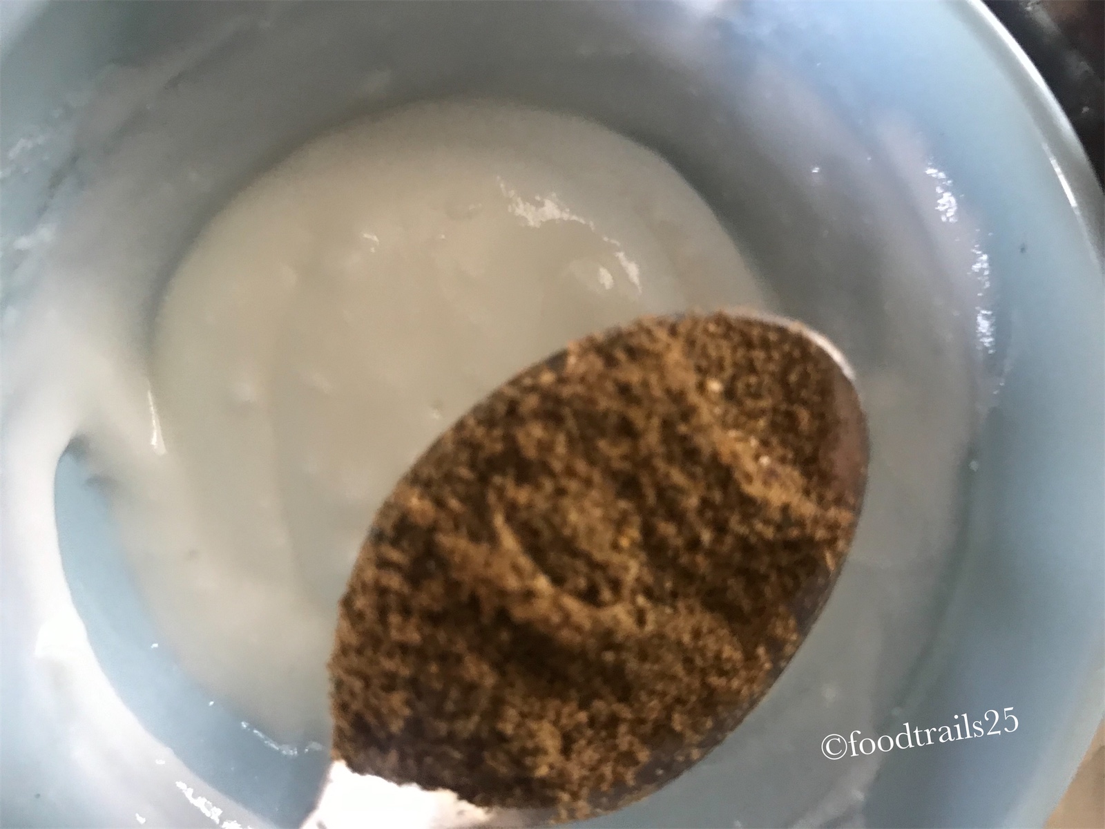 - Mix dry spices in curd, and then add to the inner pot. Stir curd well after adding to onions.