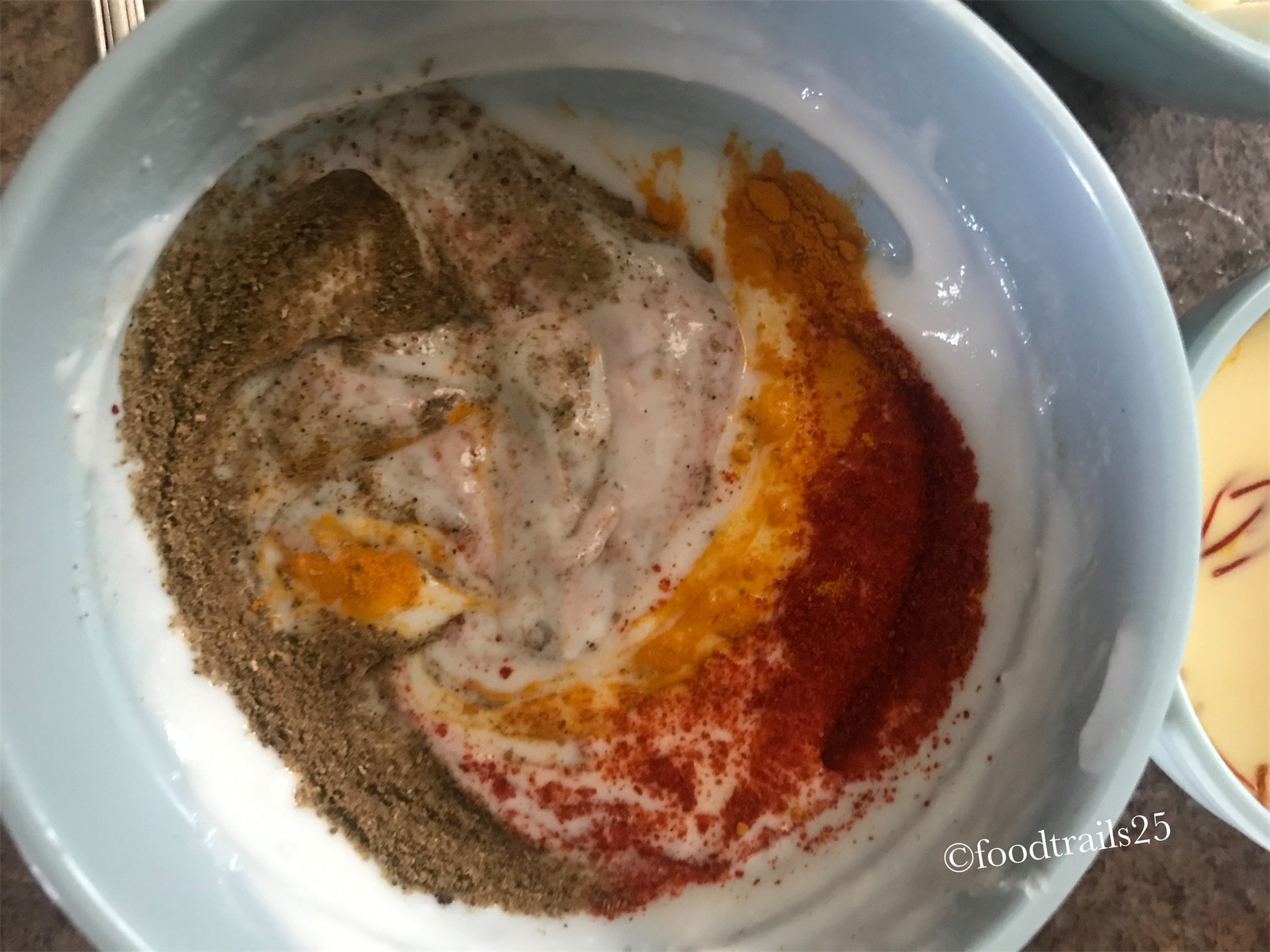 Add ginger-garlic paste, dry spices and curd. I mix dry spices in curd, and then add to the inner pot. Stir curd well after adding.