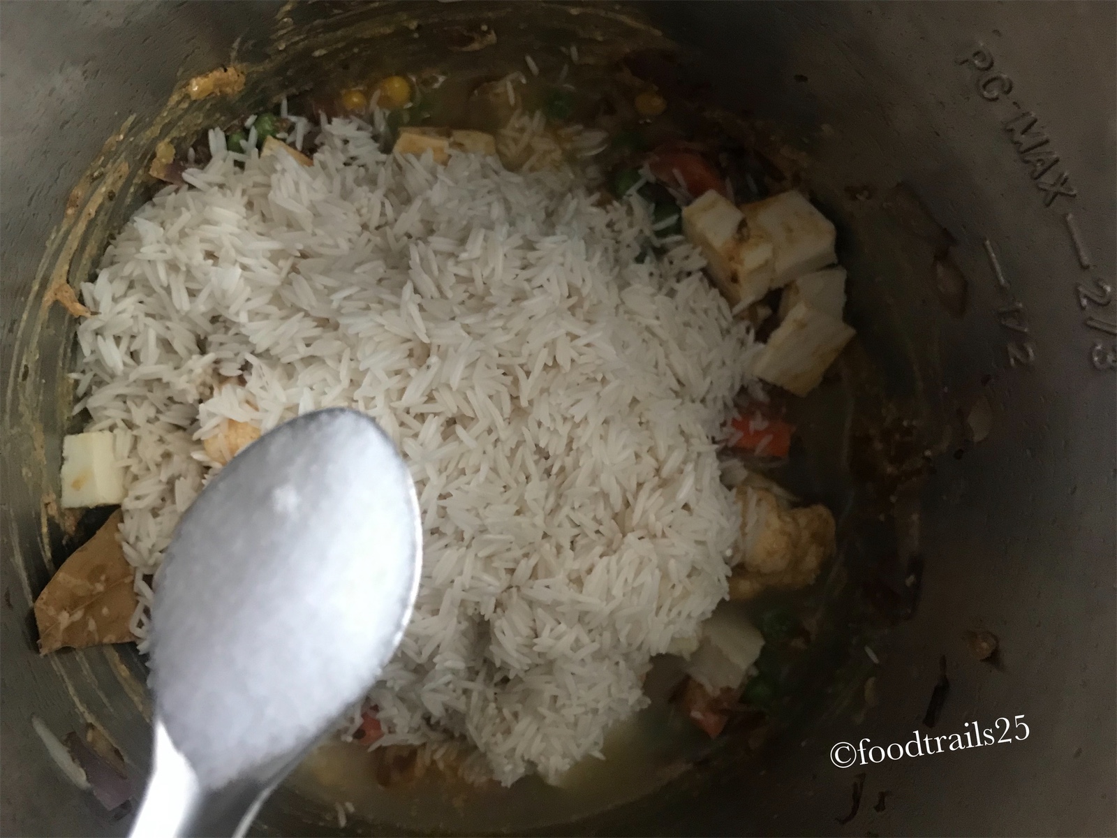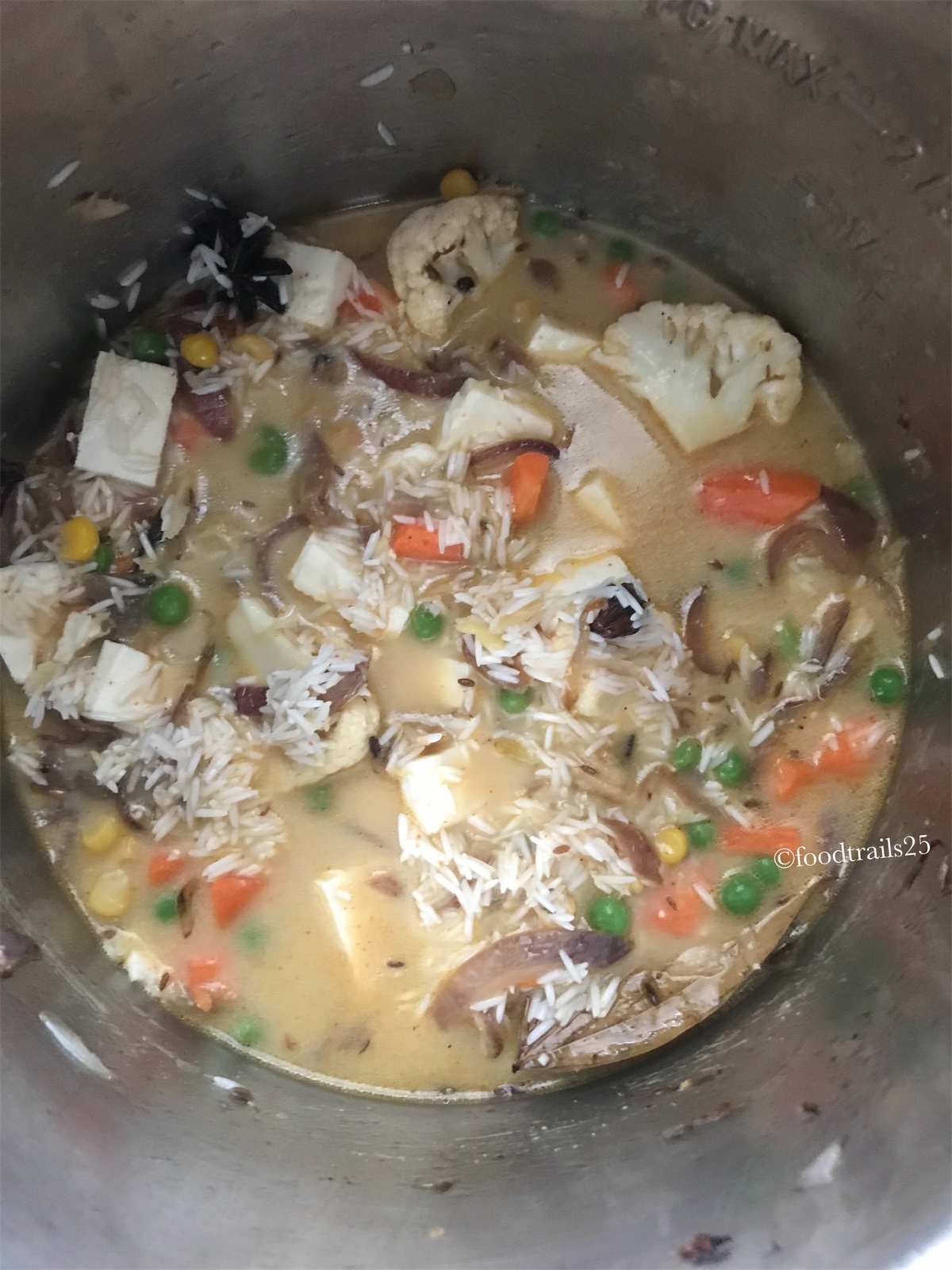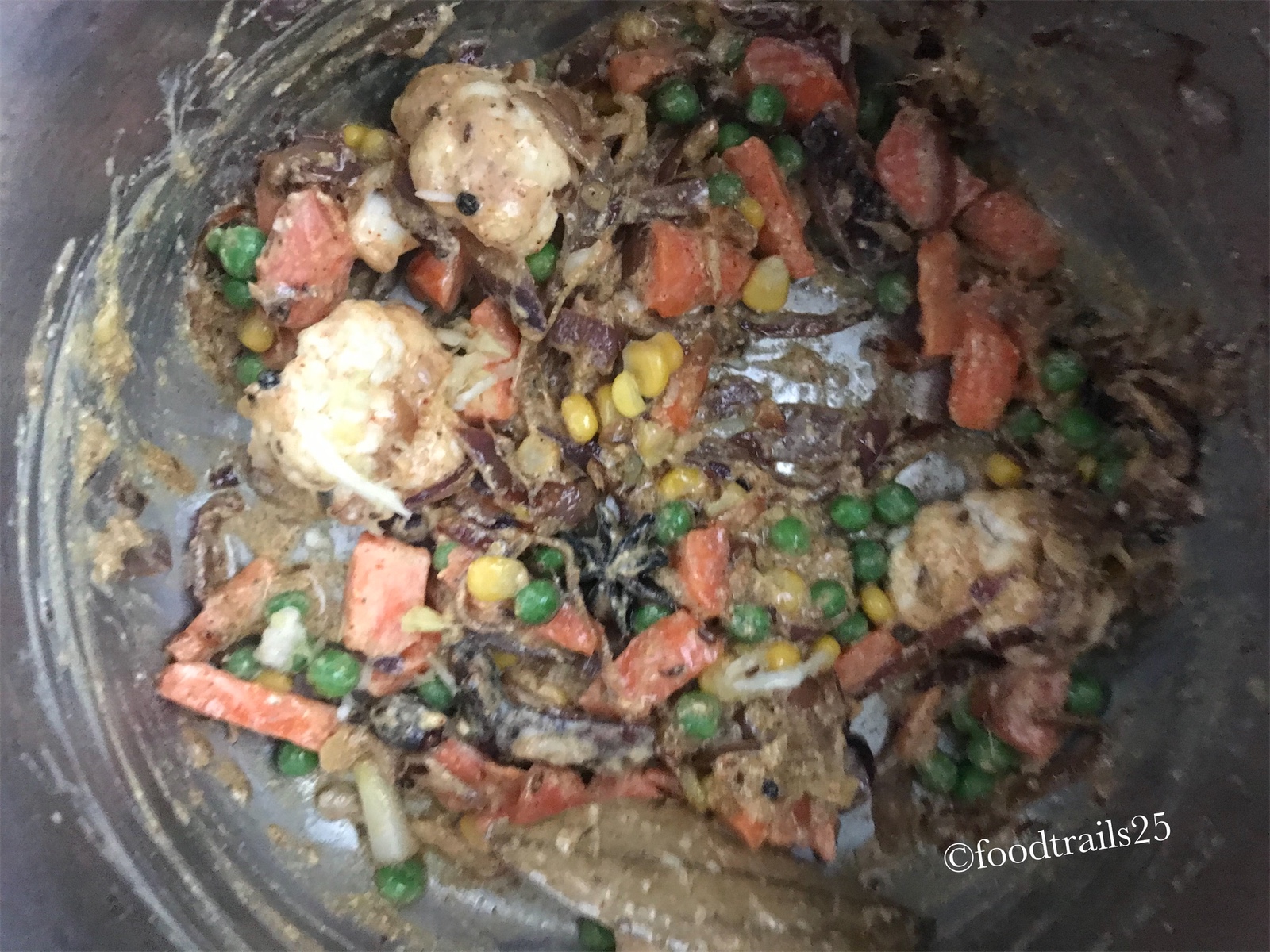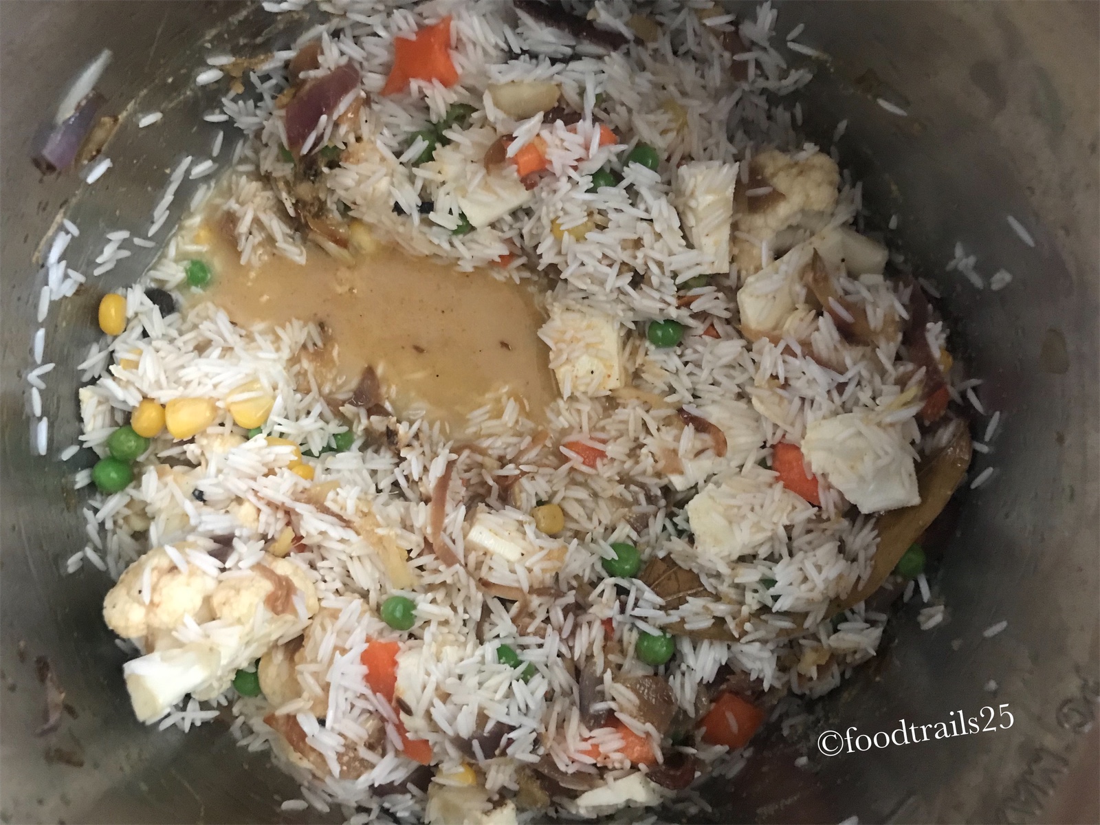 Next add vegetables and paneer and mix well with the curd onion mixture. Cancel the SAUTE Mode.