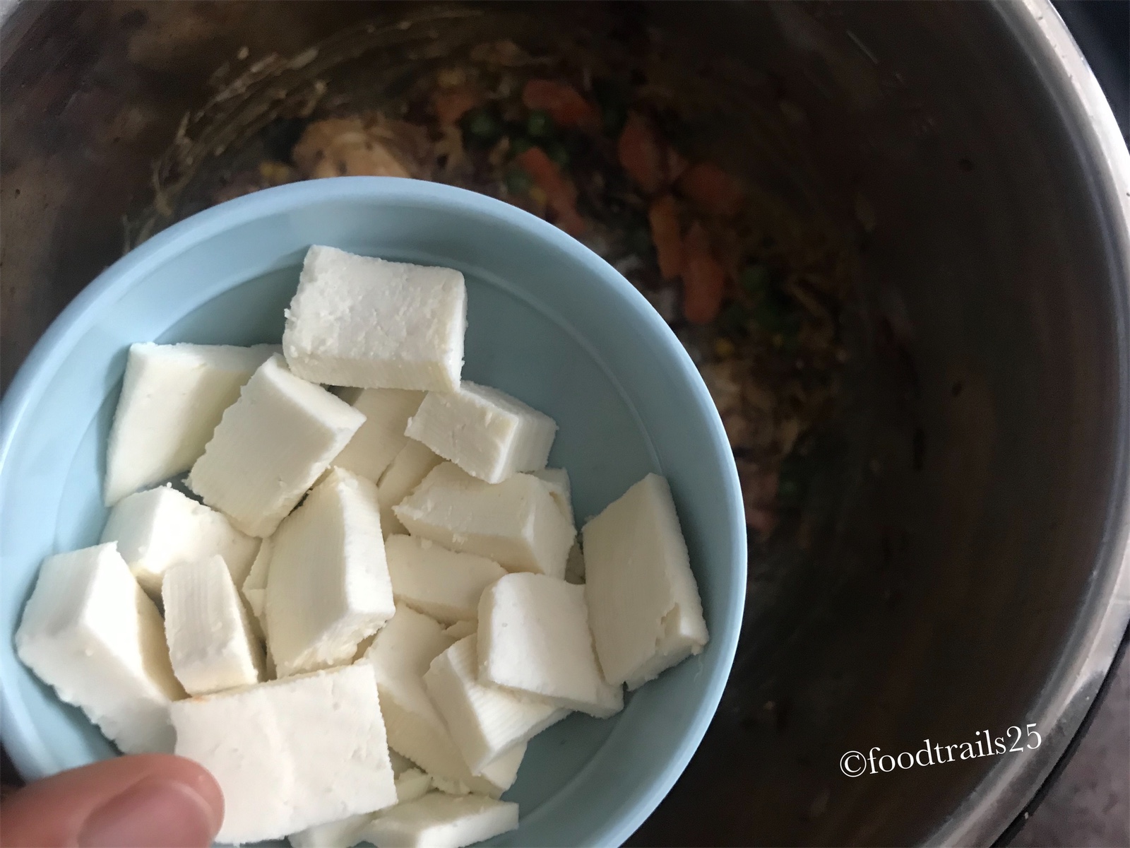 - Next add vegetables and paneer and mix well with the curd onion mixture. Cancel the SAUTE Mode.